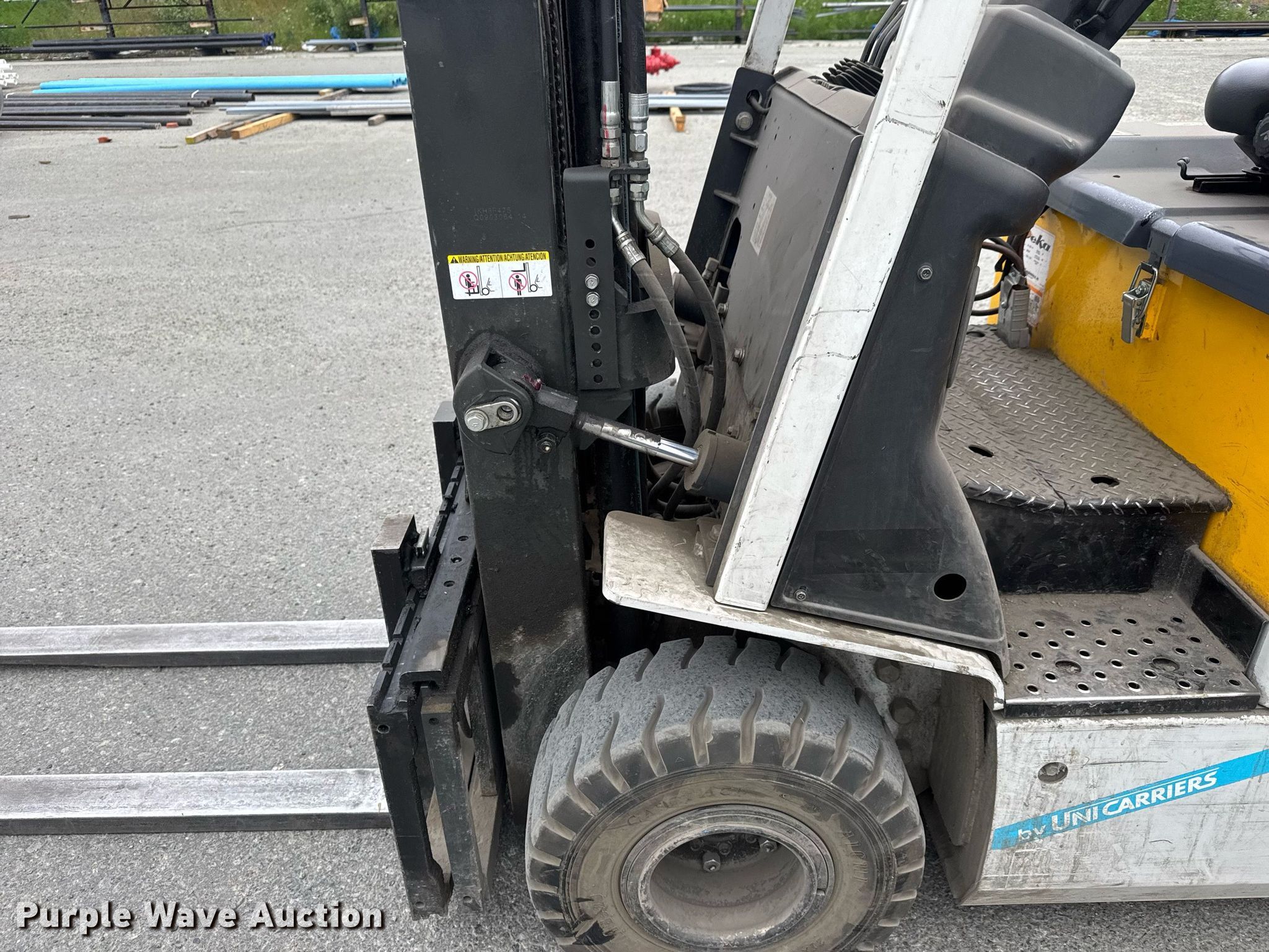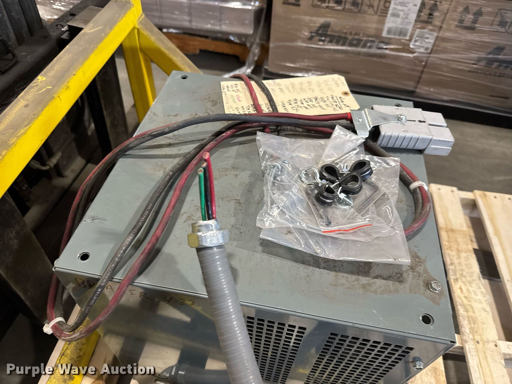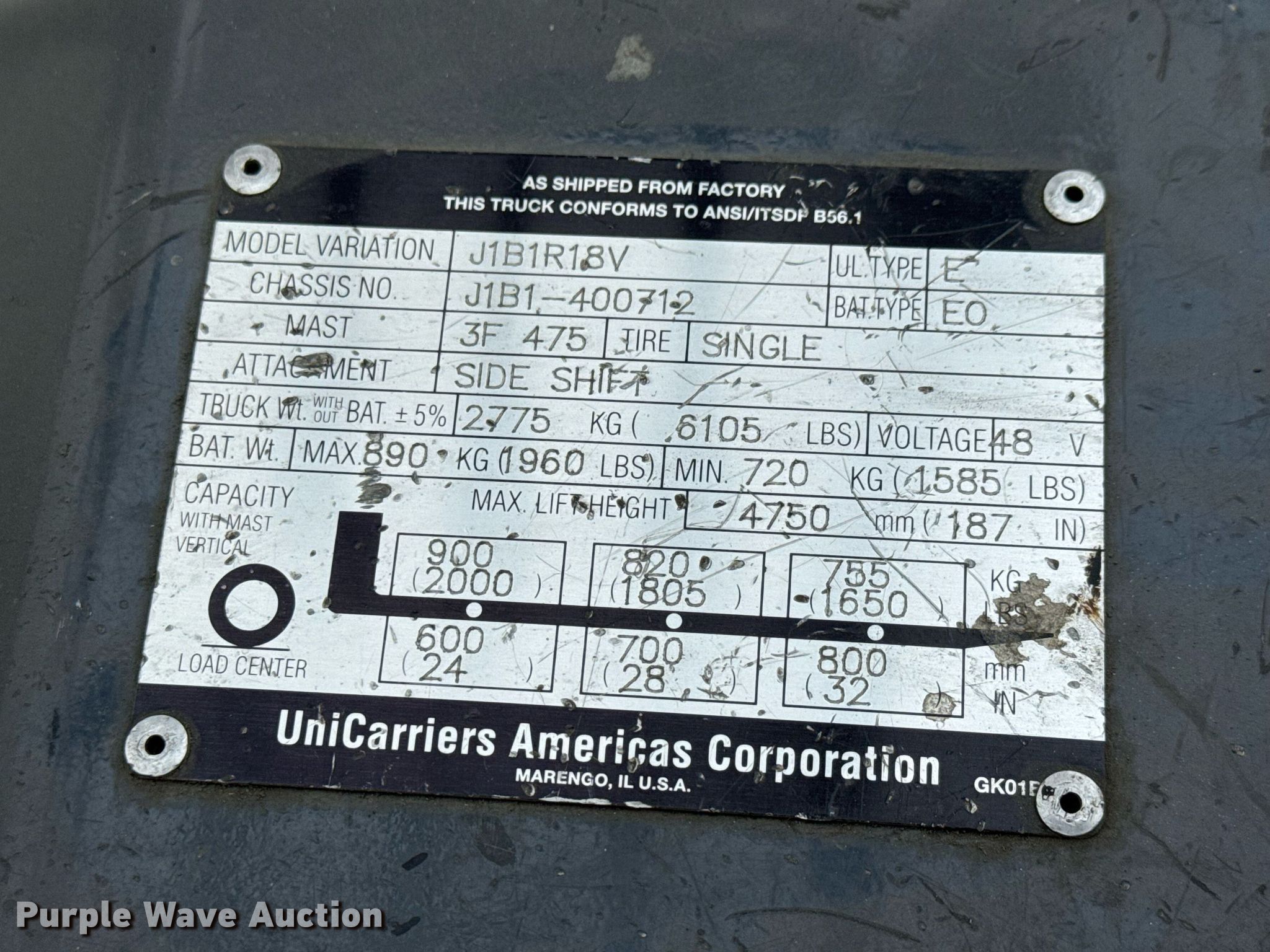 2015 Nissan BXP35 forklift. Hours: 2,578 on meter, Serial: J1B1-400712, Unit #: SFS2089. Electric Motor Volts: 48, Charger: Single phase. Transmission Electric drive. Operators station OROPS. Features Maximum lift capacity: 2,000 lbs, Maximum lift height: 187", Collapsed mast height: 84", Mast stages: 3, Side shift, Mast tilt, Fork length: 48". Tires Front: 21x8-9/6.00, Rear: 5.00-8/3.00, Solid. Notes Ametek Battery Mate 80 charger. Ferguson. Anchorage, AK 99515