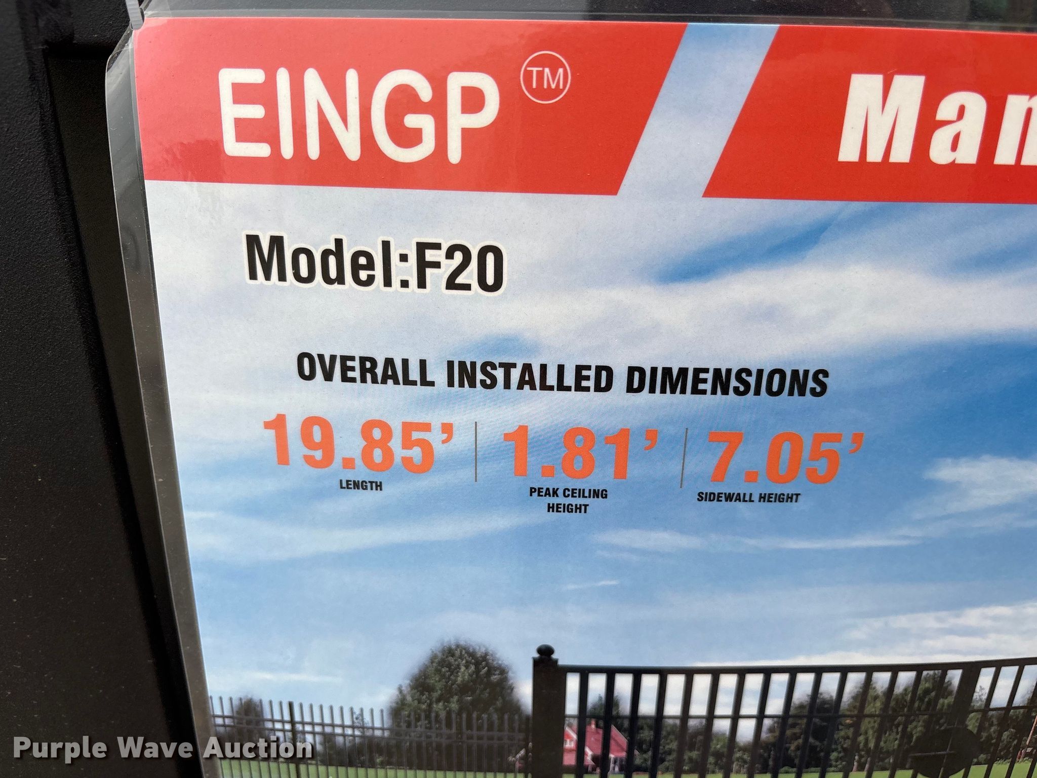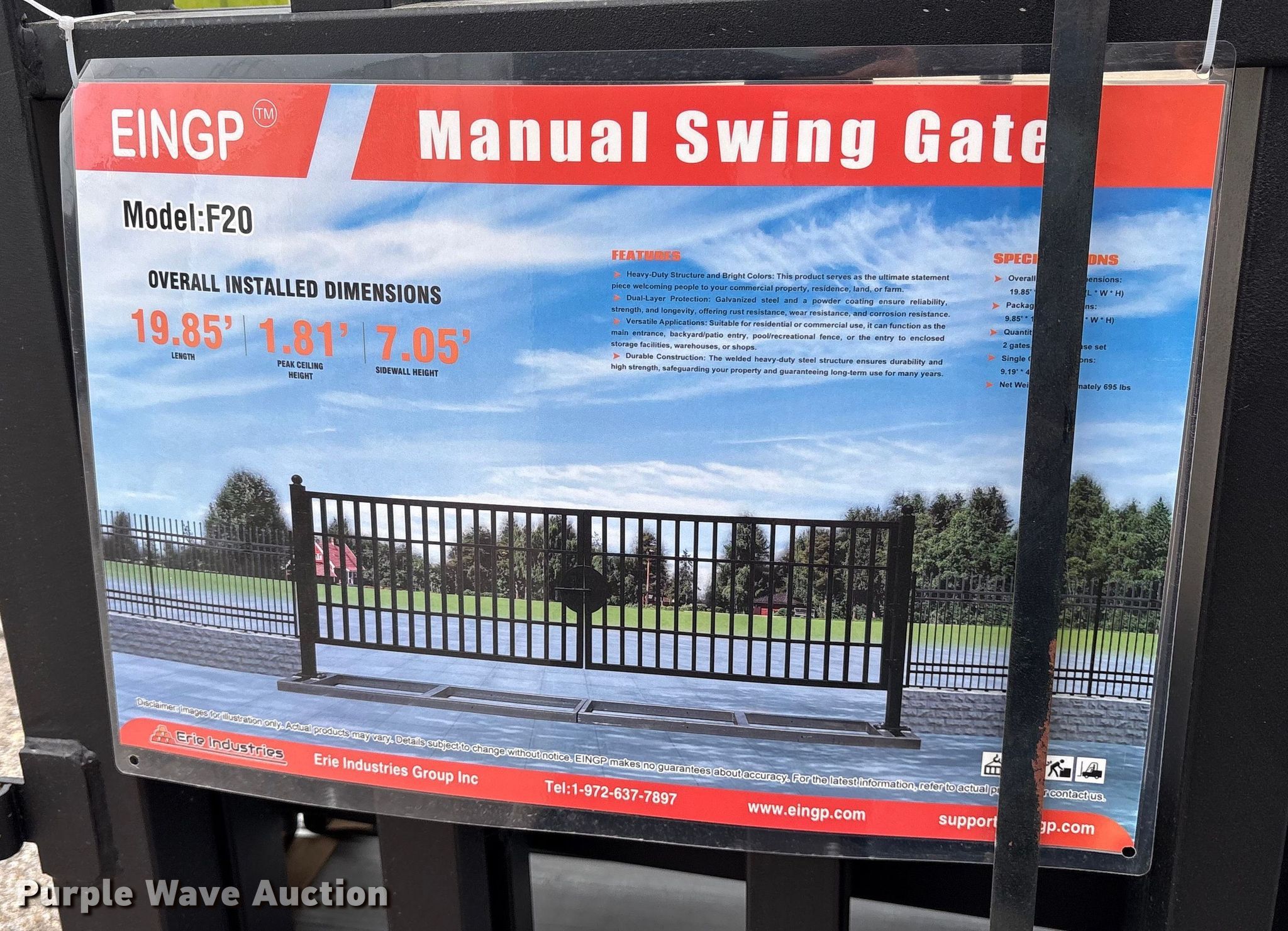 Purple Wave is selling a used Fencing Materials in Texas. This item is a EINGP F20 manual swing gate with the following: Overall installed dimensions: 19.85' x 1.81' x 7.05', Serial: 2408290027