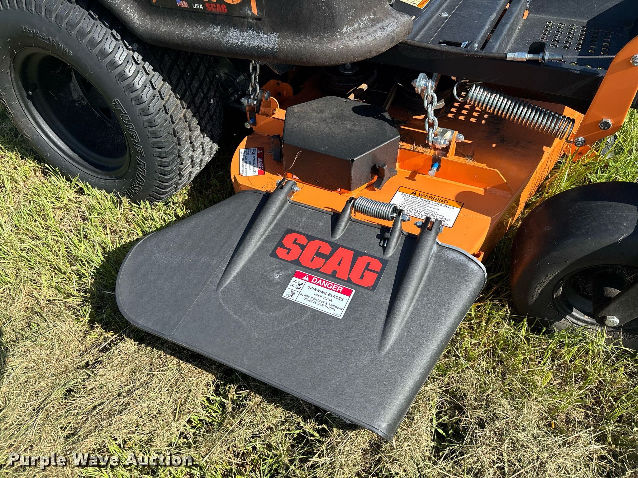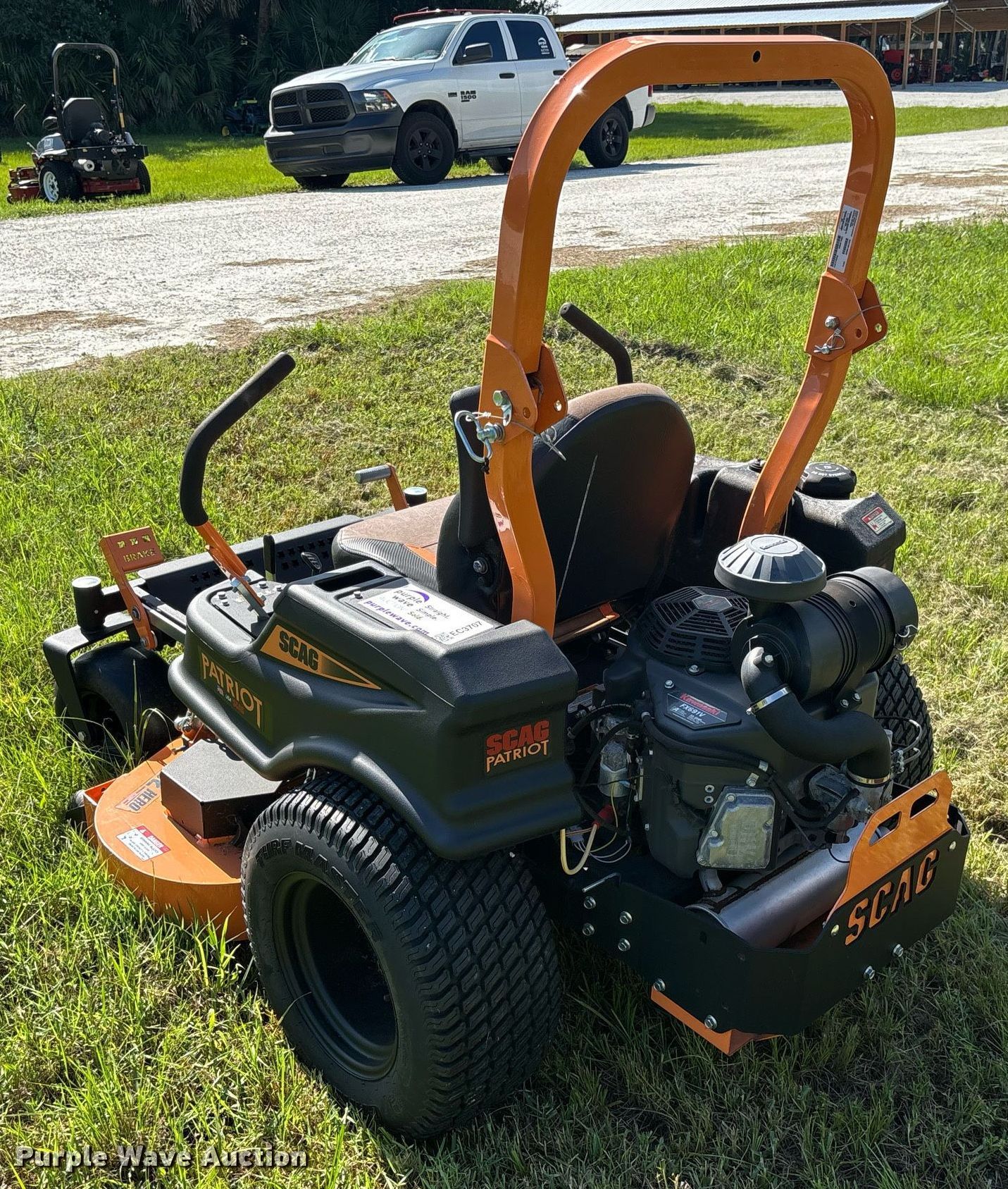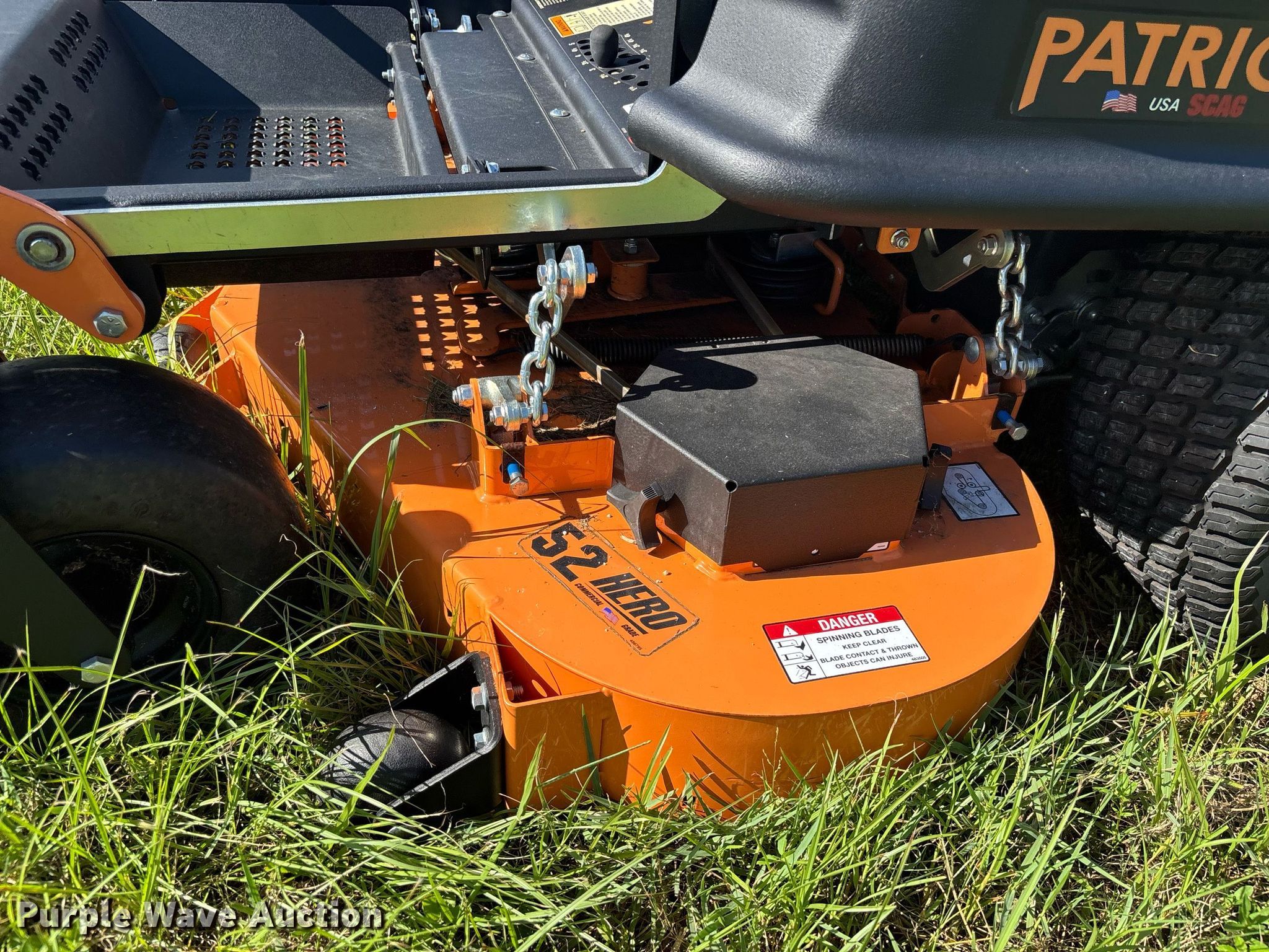 Purple Wave is selling a used Lawn Mower in Florida. This item is a Scag Patriot ZTR lawn mower with the following: Hours: 21 on meter, Cutting width: 52", Serial: V3601902