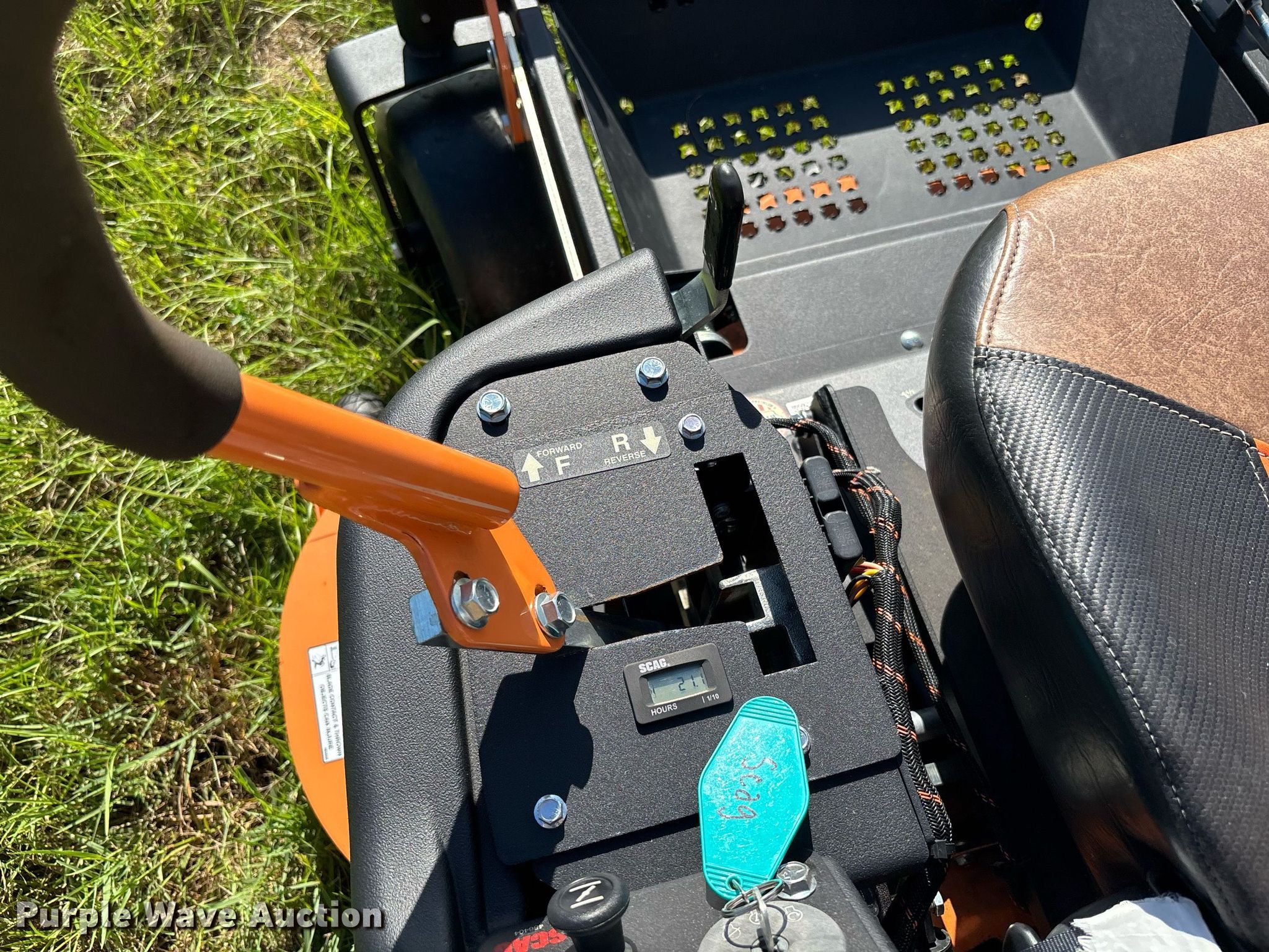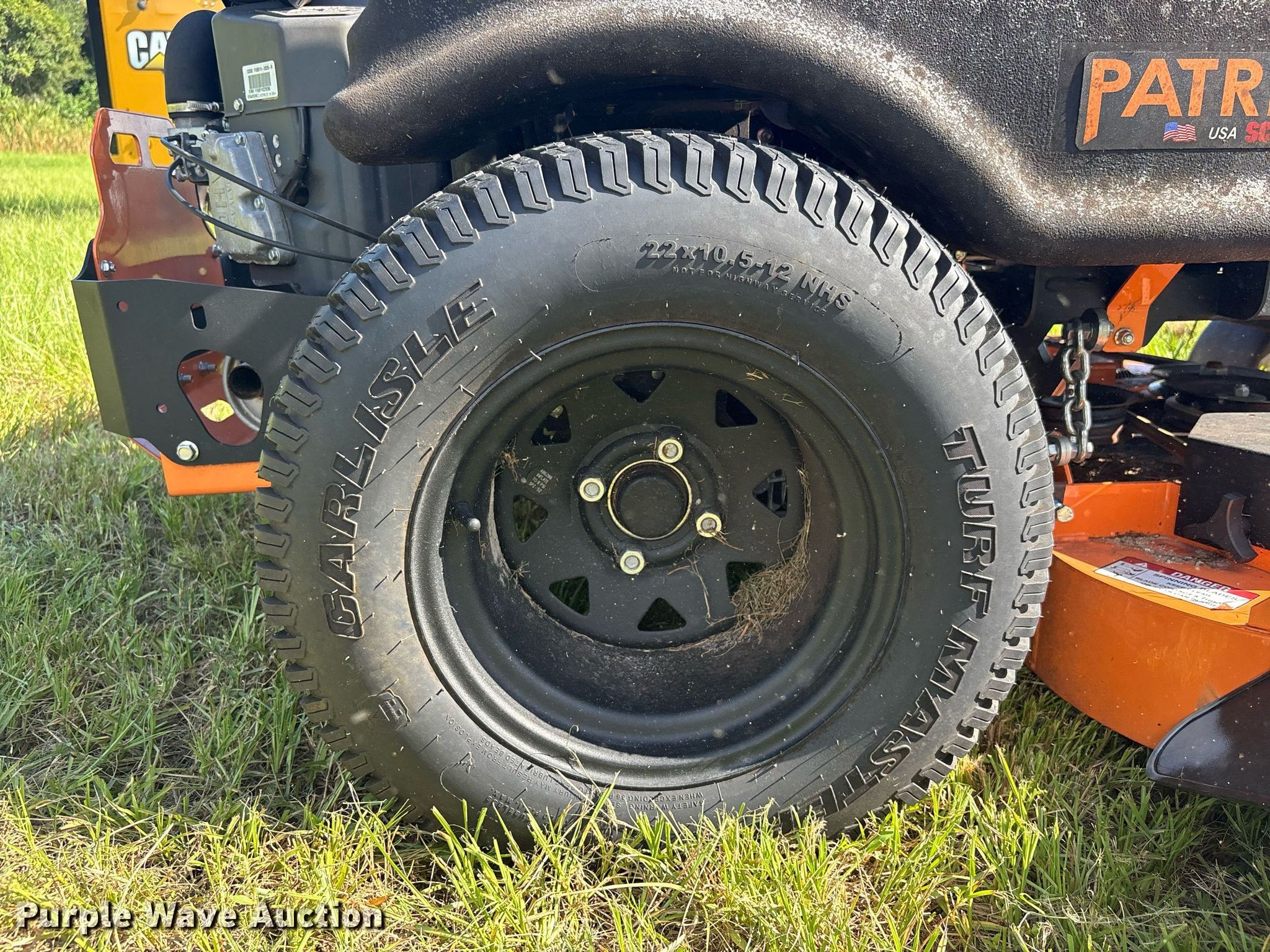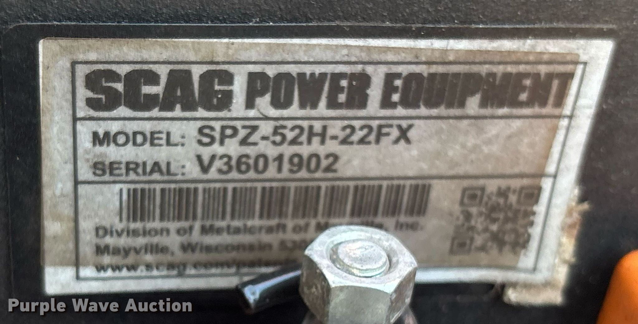 Scag Patriot ZTR lawn mower. Hours: 21 on meter, Cutting width: 52", Serial: V3601902. Engine Kawasaki FX691V, Serial: FX691VC29268, Displacement: 726 cc, Cylinders: 2, Fuel type: Gas. Transmission Hydrostatic. Operators station OROPS. Tires Front: 13x6.50-6, Rear: 22x10.5-12. Mark Hampton. Fort Pierce, FL 34945