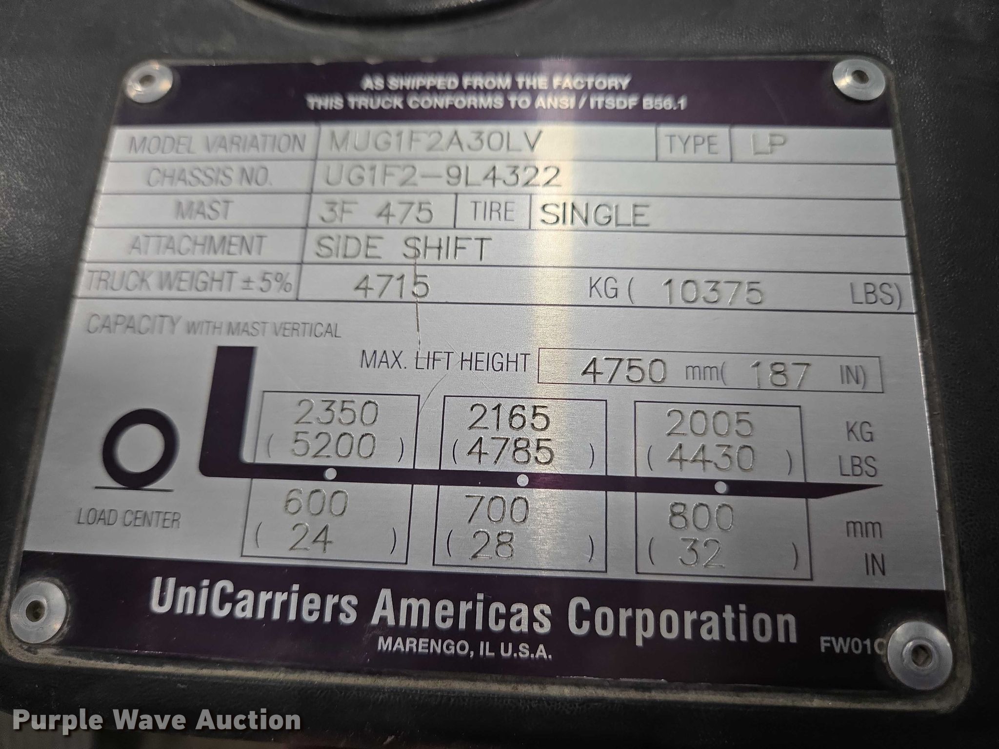 Purple Wave is selling a used Cushion Tire or Pneumatic Forklift in Ohio. This item is a 2015 Nissan PF30LP forklift with the following: Hours: 3,161 on meter, Serial: UG1F2-9L4322, Unit #: SFS2253