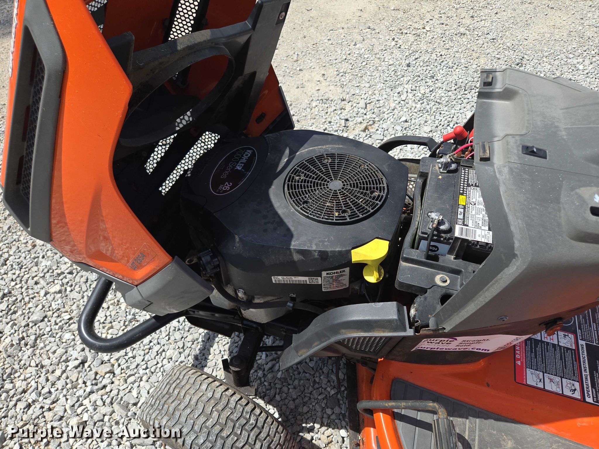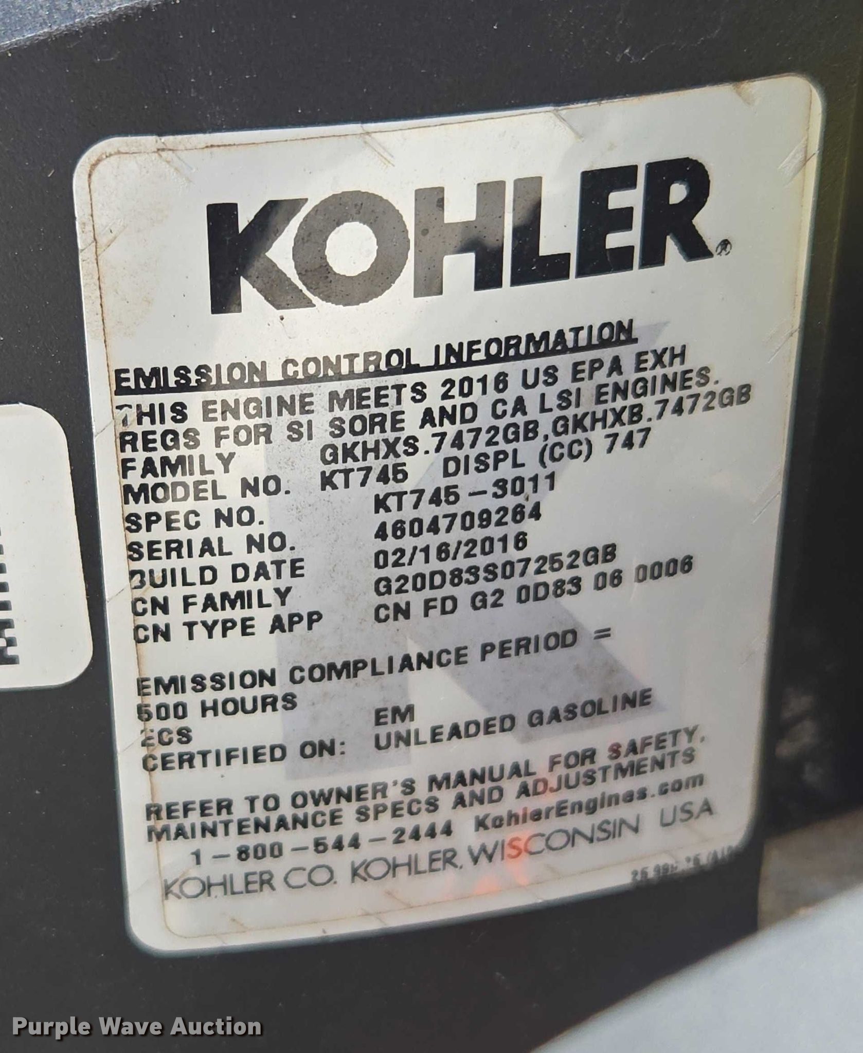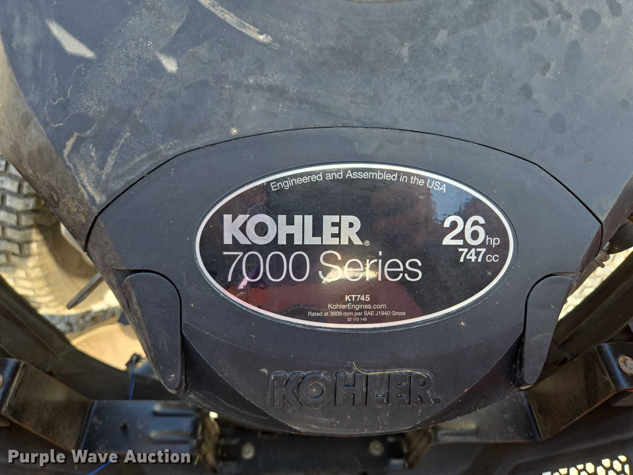 Husqvarna LGT2654 lawn mower. Hours: 242 on meter, Cutting width: 54", Serial: 031816A035352. Engine Kohler 7000 Series, Displacement: 747 cc, Cylinders: 2, Fuel type: Gas, HP: 26. Transmission Hydrostatic. Tires Front: 16x6.50-8, Rear: 22x9.50-12. Notes Battery charging issue. Greenscapes Lawn and Garden, LLC. Warrensburg, MO 64093