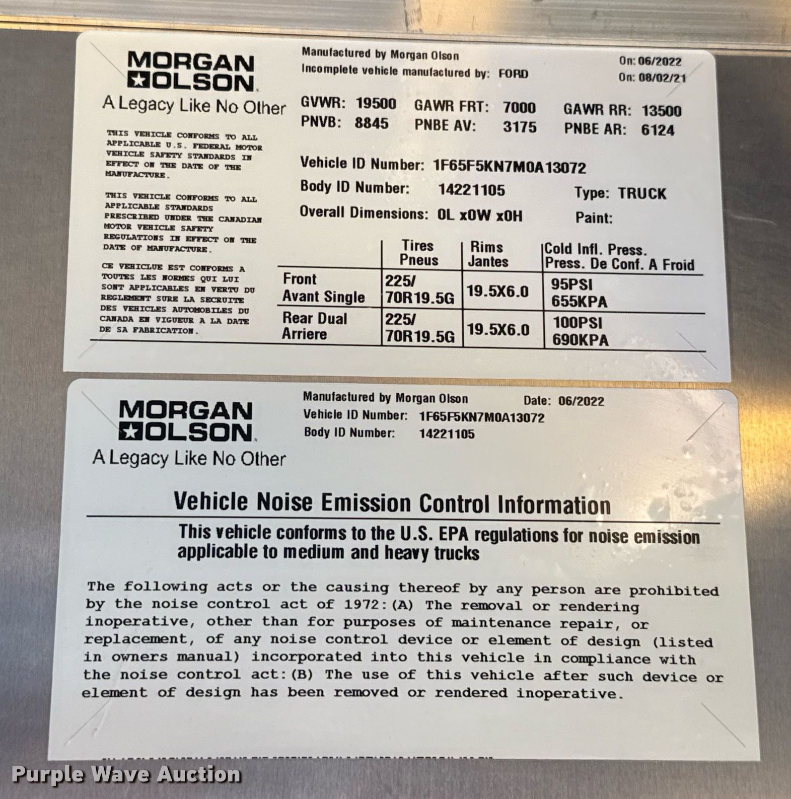 2021 Ford F59 delivery truck. Miles: 1,395 on odometer, VIN: 1F65F5KN7M0A13072, Unit #: A13072. Engine Ford, Displacement: 7.3L, Cylinders: 8, Fuel type: Gas. Transmission Automatic. Chassis Axles: Single, Suspension: Spring, Brakes: Hydraulic, GVWR: 19,500 lbs, Wheelbase: 178". Interior AC, Heat, Cruise control, Auxiliary controls, Backup camera. Features Box bed Morgan Olson, 18' L x 96" W x 96" H, Floor: Aluminum. Tires Size: 225/70R19.5. Notes Dash warning indicator: Check engine. Oklahoma title. Title distribution may be delayed up to 30 days from verification of funds. Gemini Motor Transport. 10220 W Reno Ave. Oklahoma City, OK 73127