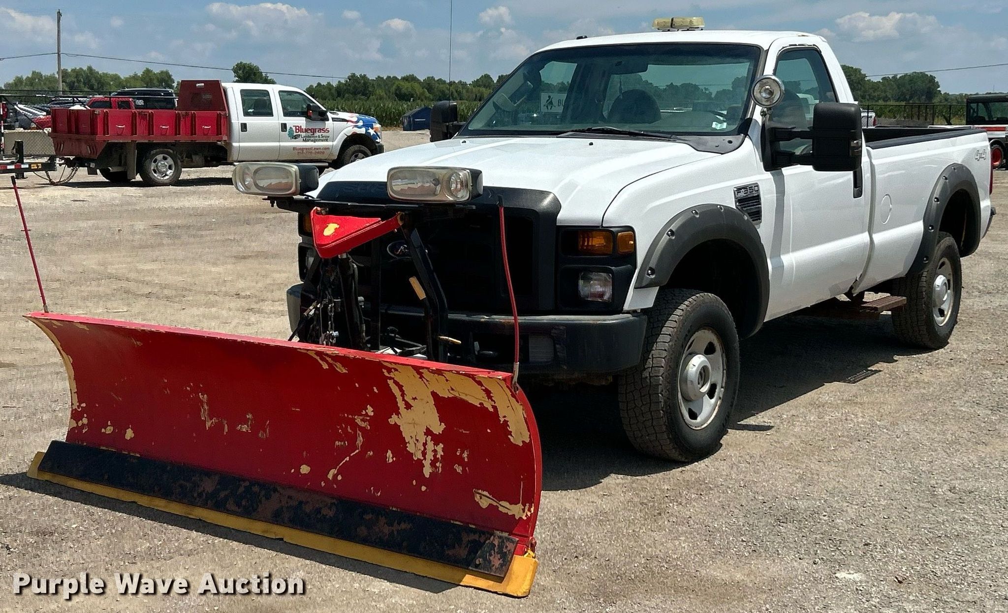 2008 Ford F350 Super Duty XL pickup truck. Miles: 129,490 on odometer, VIN: 1FTSF31508EE36364. Engine Displacement: 5.4L V8 OHV, Cylinders: 8, Fuel type: Gas. Transmission Automatic, Four wheel drive. Interior AC, Heat, Cruise control, Brake controller. Features Snow plow Width: 96". Tires Size: 265/70R17. Notes Dash warning indicator: Check engine, TPMS, Non-operational four wheel drive Front drive shaft missing, Brake issues, soft , Possible AC issues, may need charged, Rust damage. Missouri title. Title distribution may be delayed up to 14 days from verification of funds. Bluegrass Landscape & Snow Management. Bridgeton, MO 63044