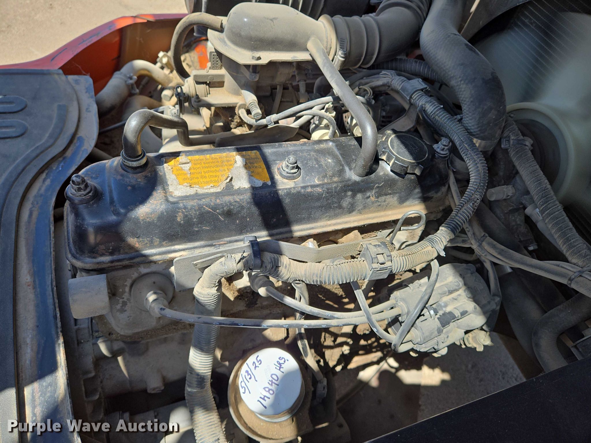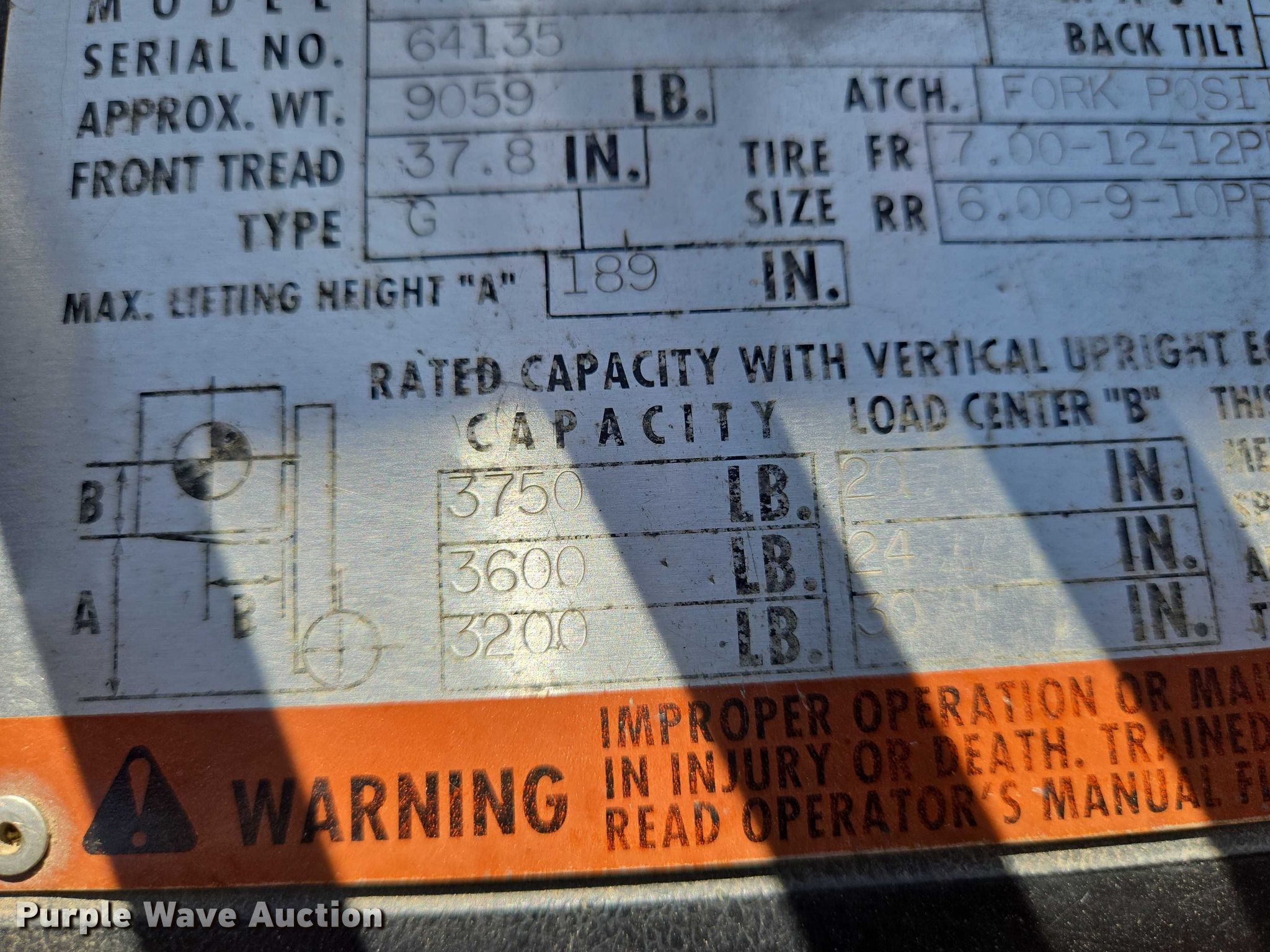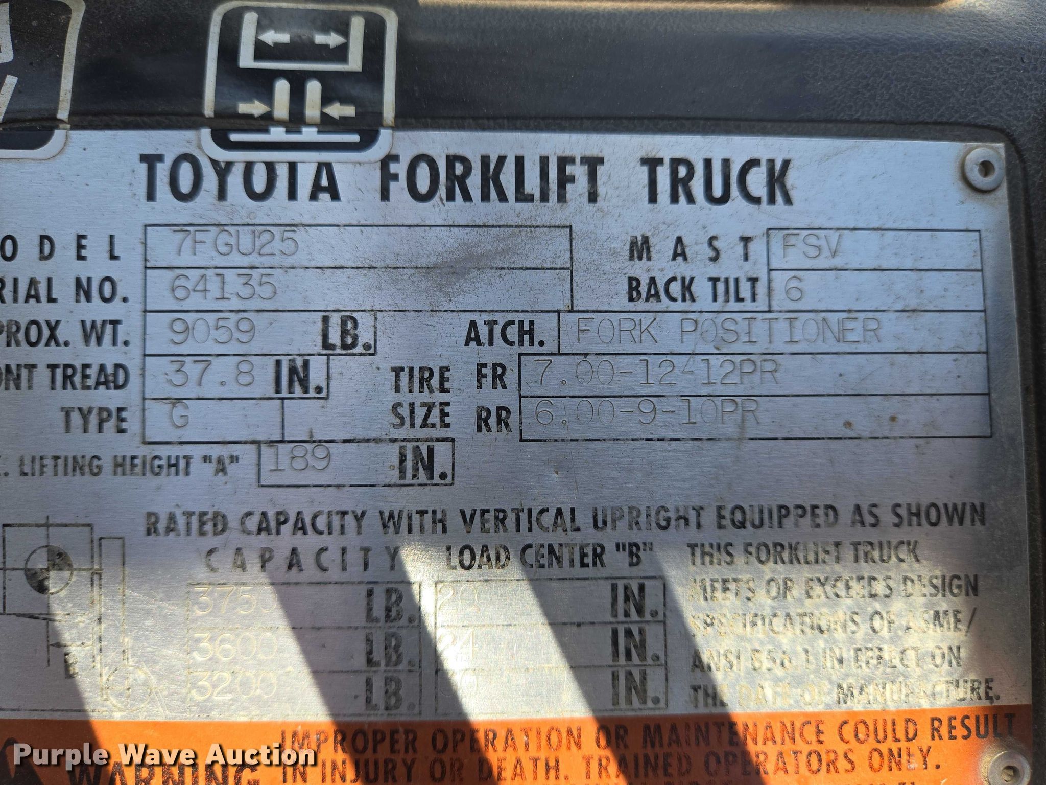 2001 Toyota 7FGU25 forklift. Hours: 14,841 on meter, Serial: 64135. Engine Cylinders: 4, Fuel type: LPG LP bottle: Not included. Transmission Powershift. Features Maximum lift capacity: 3,750 lbs, Maximum lift height: 189", Mast stages: 3, Mast tilt, Fork positioner, Fork length: 48". Tires Front: 7.00-12, Rear: 6.00-9, Solid. South Hutchinson, KS 67505