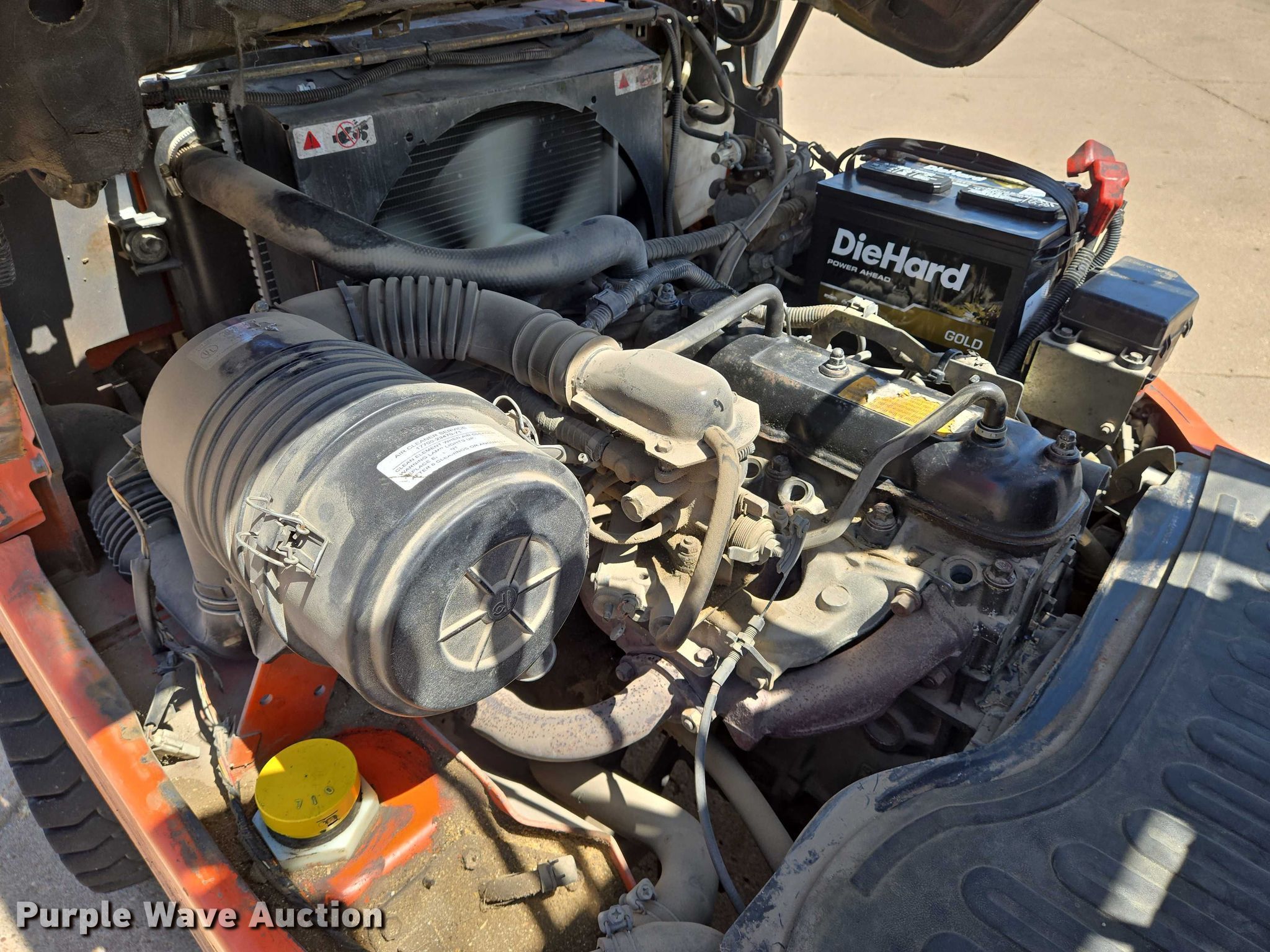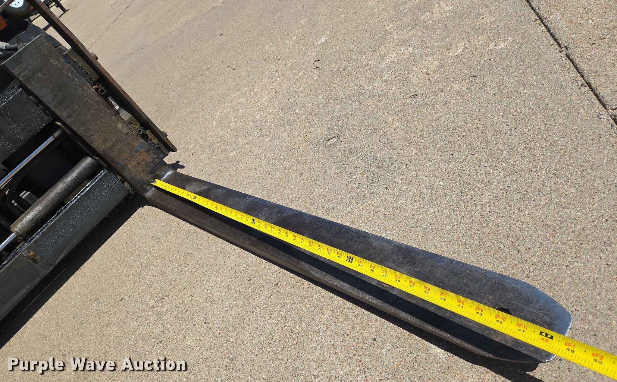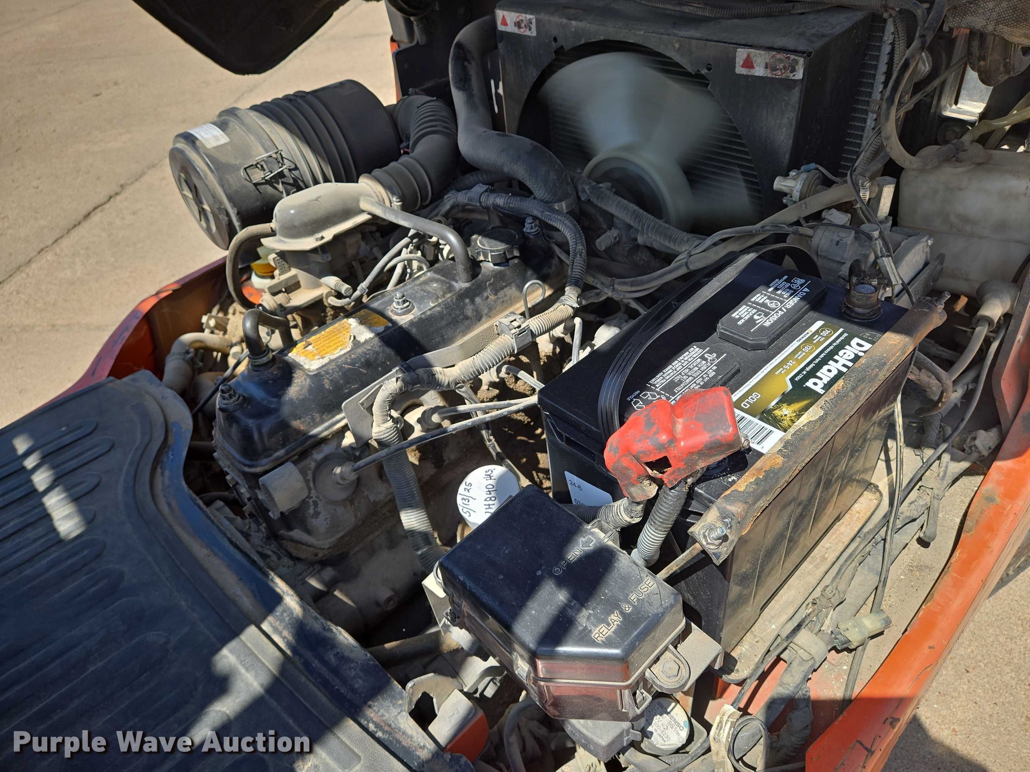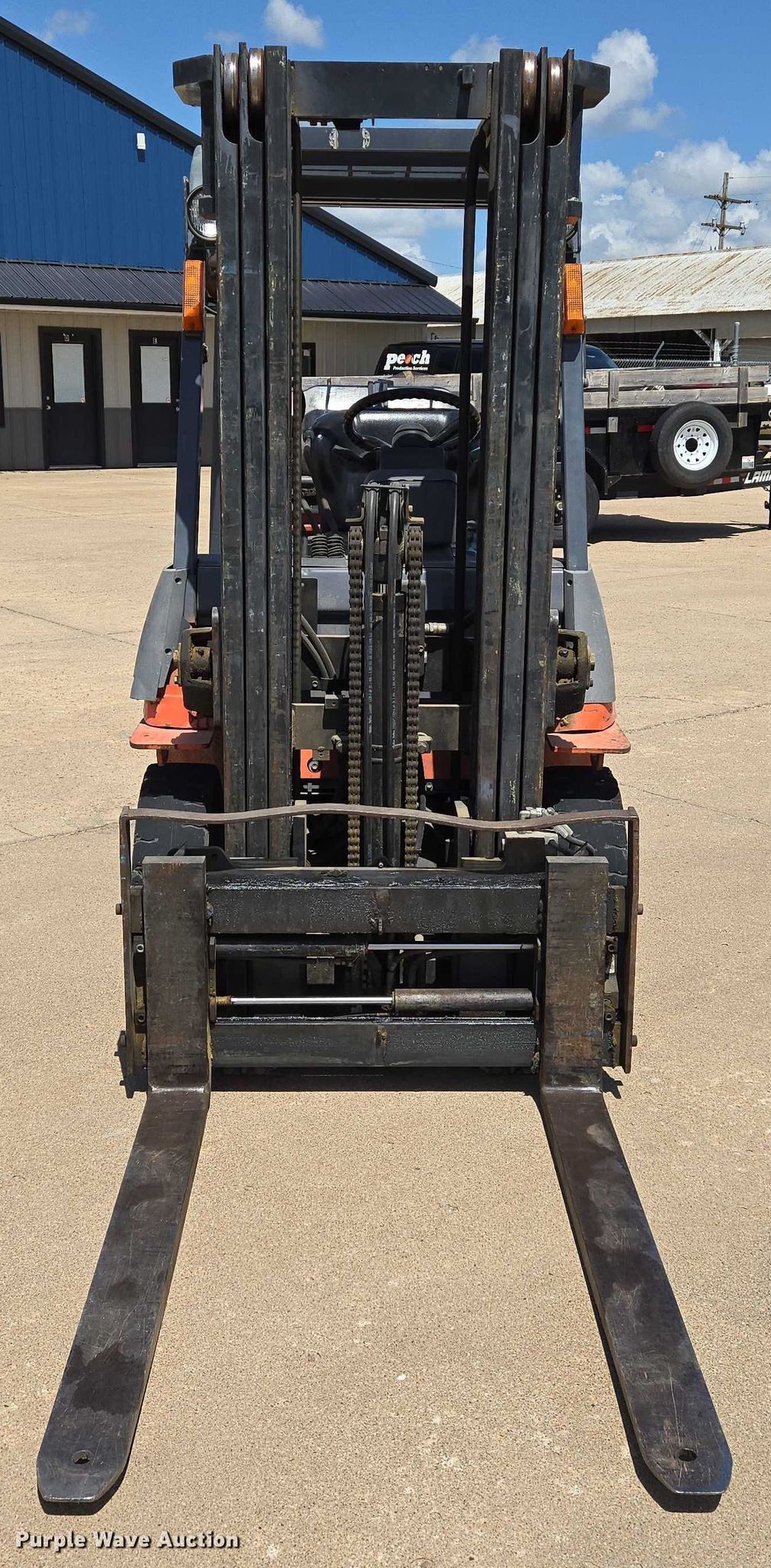 2001 Toyota 7FGU25 forklift. Hours: 14,841 on meter, Serial: 64135. Engine Cylinders: 4, Fuel type: LPG LP bottle: Not included. Transmission Powershift. Features Maximum lift capacity: 3,750 lbs, Maximum lift height: 189", Mast stages: 3, Mast tilt, Fork positioner, Fork length: 48". Tires Front: 7.00-12, Rear: 6.00-9, Solid. South Hutchinson, KS 67505