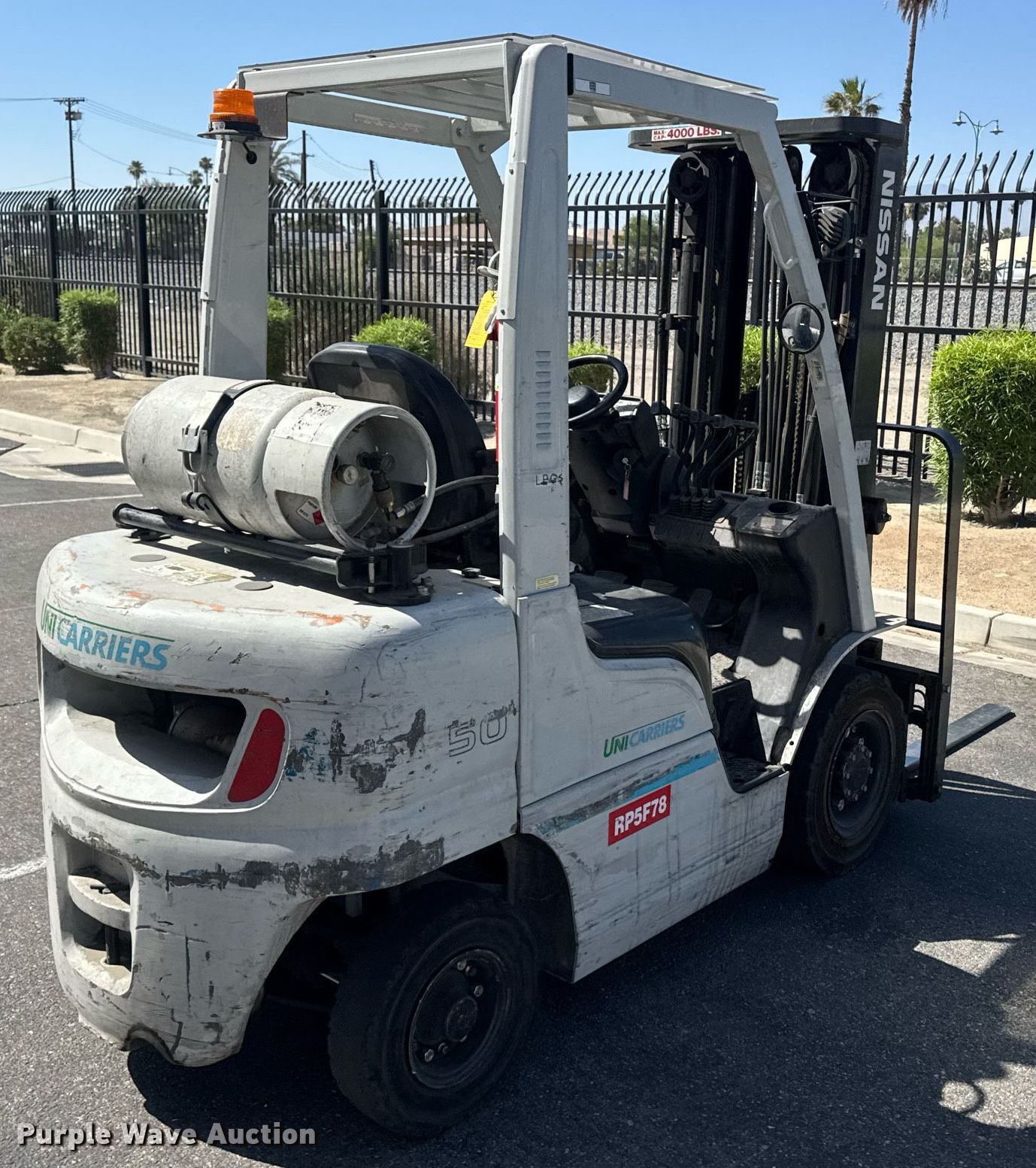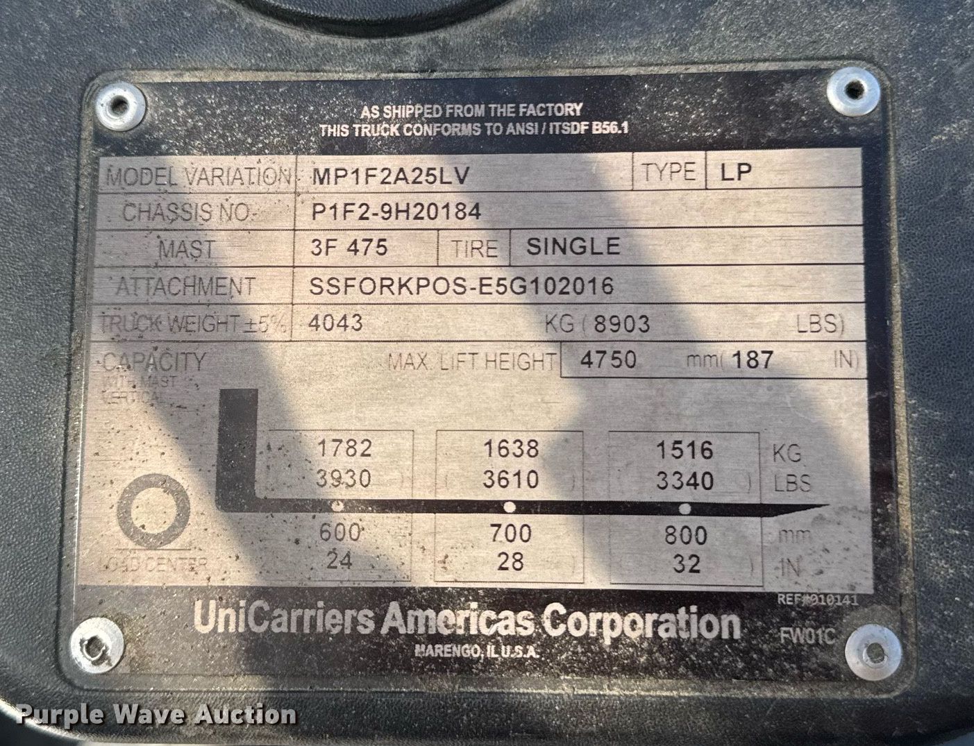 2015 UniCarriers PF50 forklift. Hours: 4,108 on meter, Serial: P1F2-9H20184, Unit #: SFS2282. Engine Cylinders: 4, Fuel type: LPG LP bottle: Not included. Transmission Automatic. Operators station OROPS, Canopy. Features Maximum lift capacity: 3,930 lbs, Maximum lift height: 187", Collapsed mast height: 83", Mast stages: 3, Side shift, Mast tilt, Fork positioner, Fork length: 48". Tires Front: 7.00-12, Rear: 6.00-9, Solid. Ferguson. Indio, CA 92201
