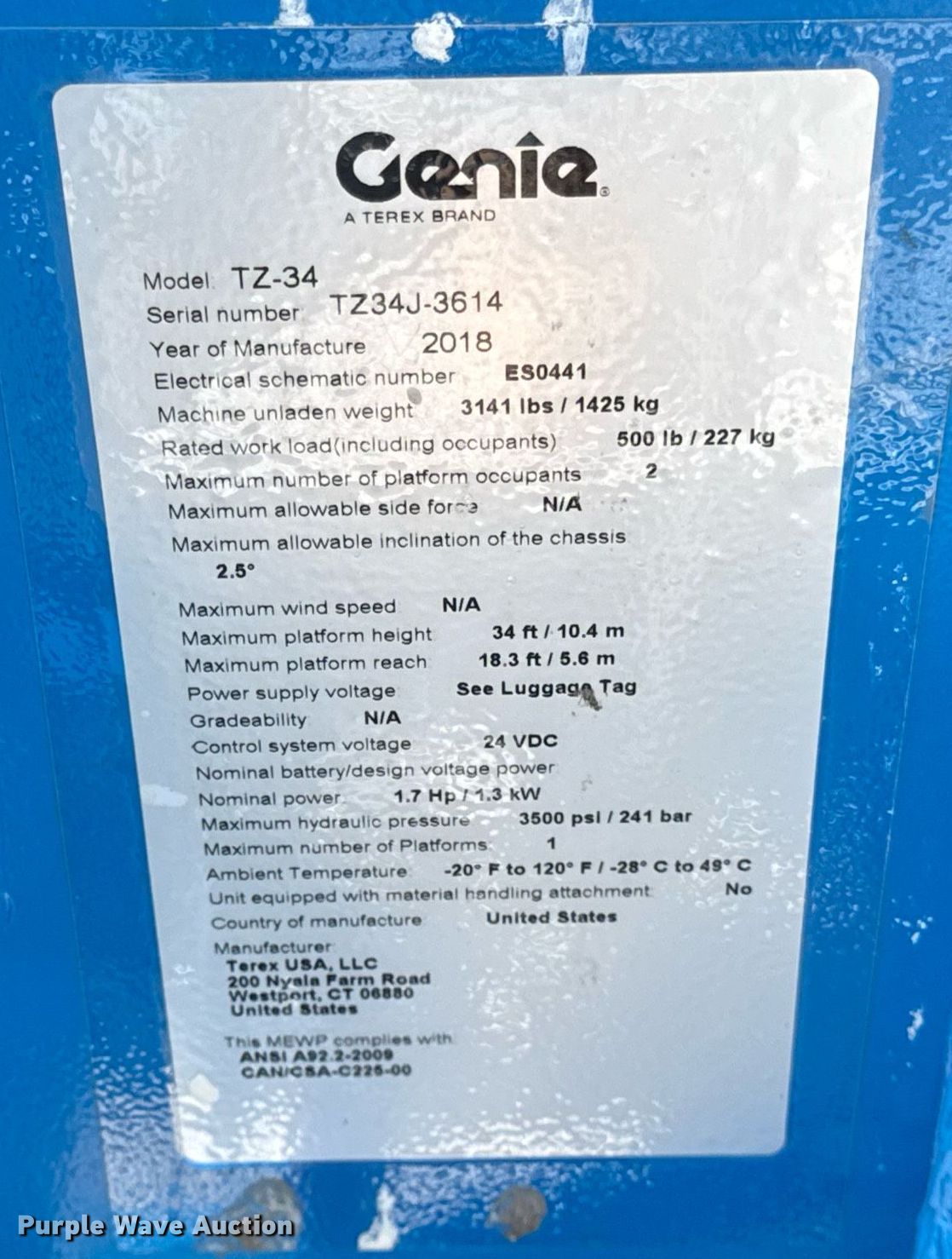 2018 Genie TZ34/20 boom lift. Hours: 26 on meter, Serial: TZ34J-3614. Electric Motor Volts: 24. Features Tow behind, Boom type: Articulating, Maximum lift capacity: 500 lbs, Maximum reach length: 18' 4", Maximum lift height: 34', Hydraulic outriggers, Hydraulic leveling, Platform: 46" L x 29" W, AC power outlet, Controls: Platform, Ground. Tires Tire size: 205/75R14. This is worksite support equipment and will not come with a title. Transfer of ownership documentation will be a bill of sale. Grubaugh Contracting. Vandalia, IL 62471