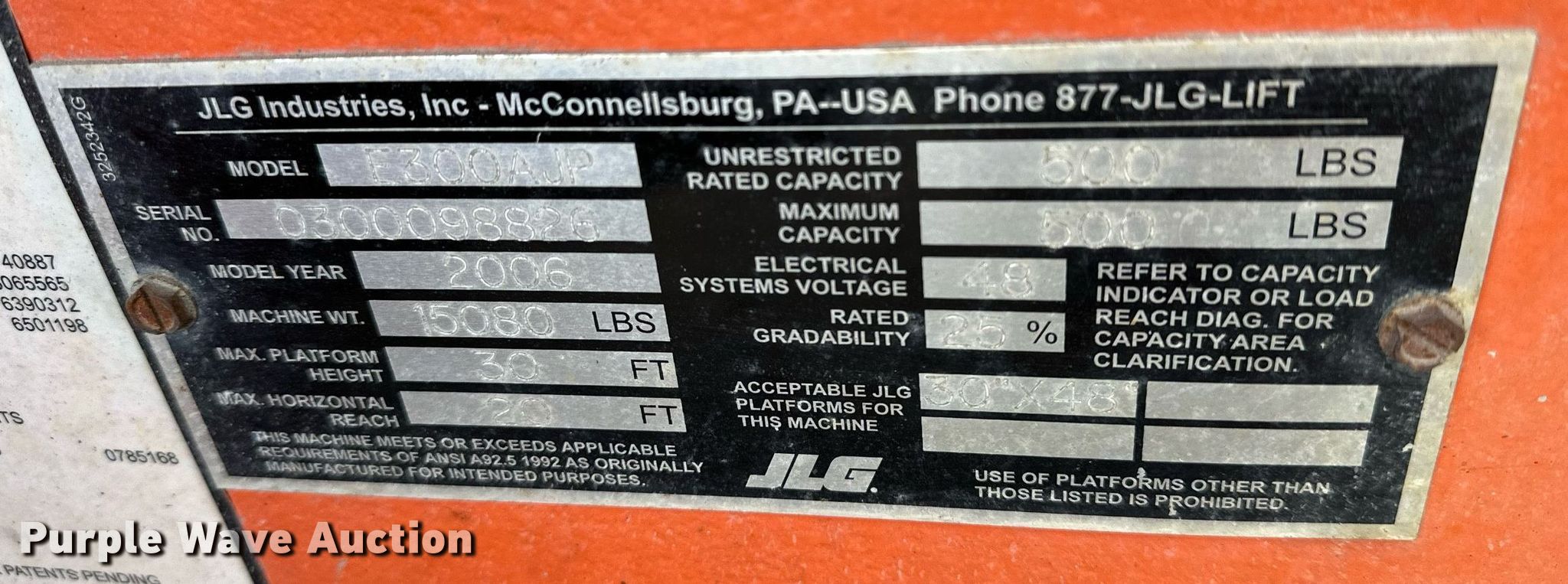 2006 JLG E300AJP boom lift. Hours: 1,411 on meter, Serial: 0300098826, Unit #: 2468. Electric Motor Volts: 48. Chassis Steering: Crab, Four wheel. Features Boom type: Telescopic, Maximum lift capacity: 500 lbs, Maximum reach length: 20', Maximum lift height: 30', Hydraulic extendable jib, Hydraulic leveling, Platform: 30" L x 48" W, AC power outlet, Controls: Platform, Ground, Platform rotation: Hydraulic. Tires Tire size: 25x7-12, Solid. Neuvirth Construction. Crescent, IA 51526
