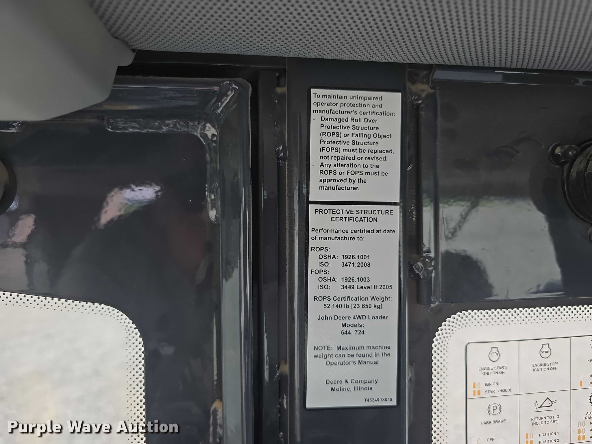 2021 John Deere 644 P-Tier wheel loader. Hours: 2,267 on meter, Serial: 1DW644PAPMLZ11802, Unit #: 2695. Engine John Deere 6068HDW99, Serial: PE6068U093195, Displacement: 6.7L, Cylinders: 6, Fuel type: Diesel. Transmission Powershift, 4F - 3R. Chassis Differential lock. Operators station Enclosed cab, AC, Heat, Steering: Combination, Bucket controls: Joystick, Ride control. Features Auxiliary hydraulics: Front, Quick coupler: Hydraulic, Counter weights, Bucket John Deere 644, Capacity: 3.25 cu.yd., Width: 120", Self- leveling bucket, Cutting edge: Bolt-on, Forks JRB, Length: 65.5". Tires Size: 23.5R25, Brand: Bridgestone. Neuvirth Construction. Crescent, IA 51526