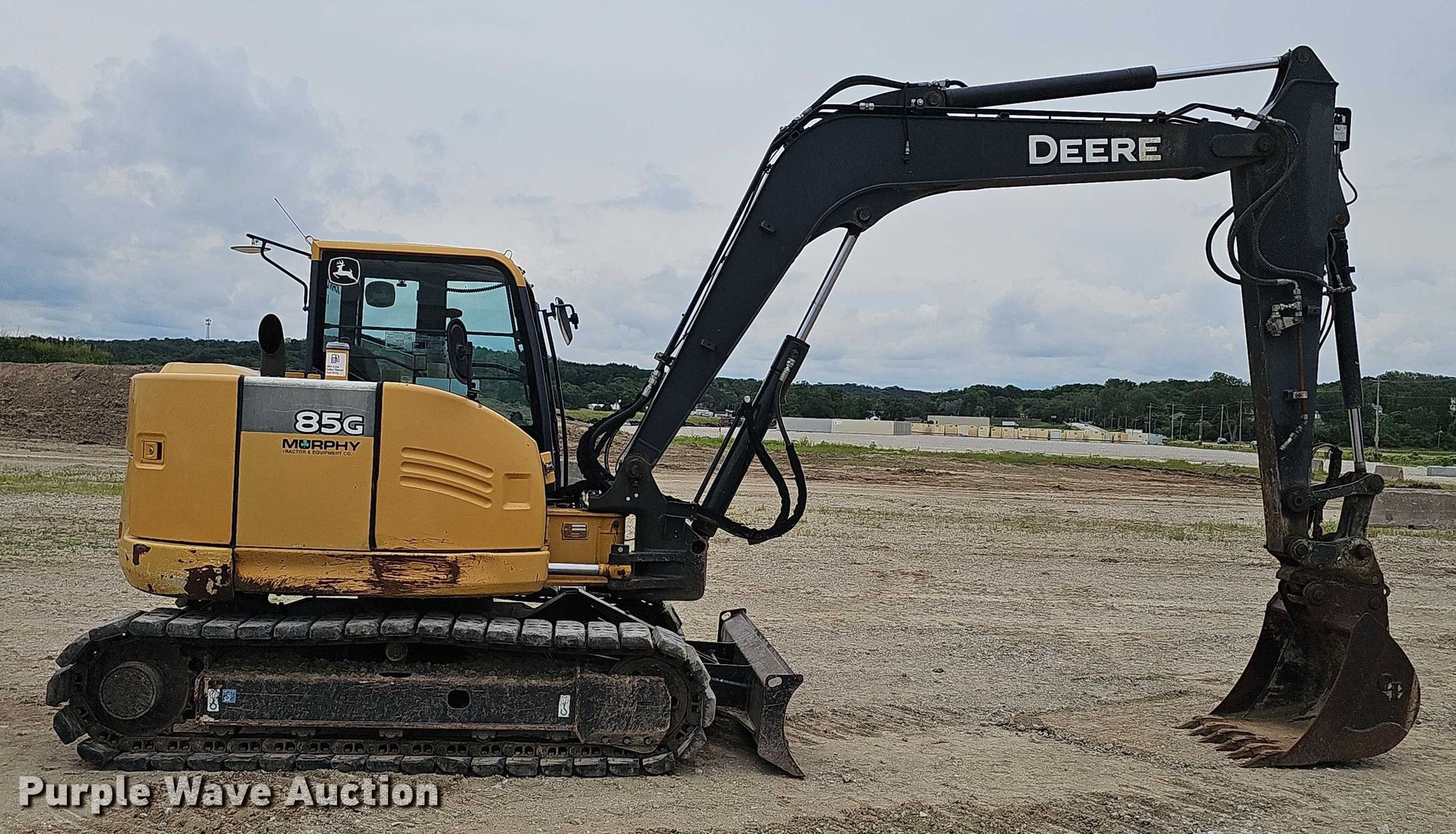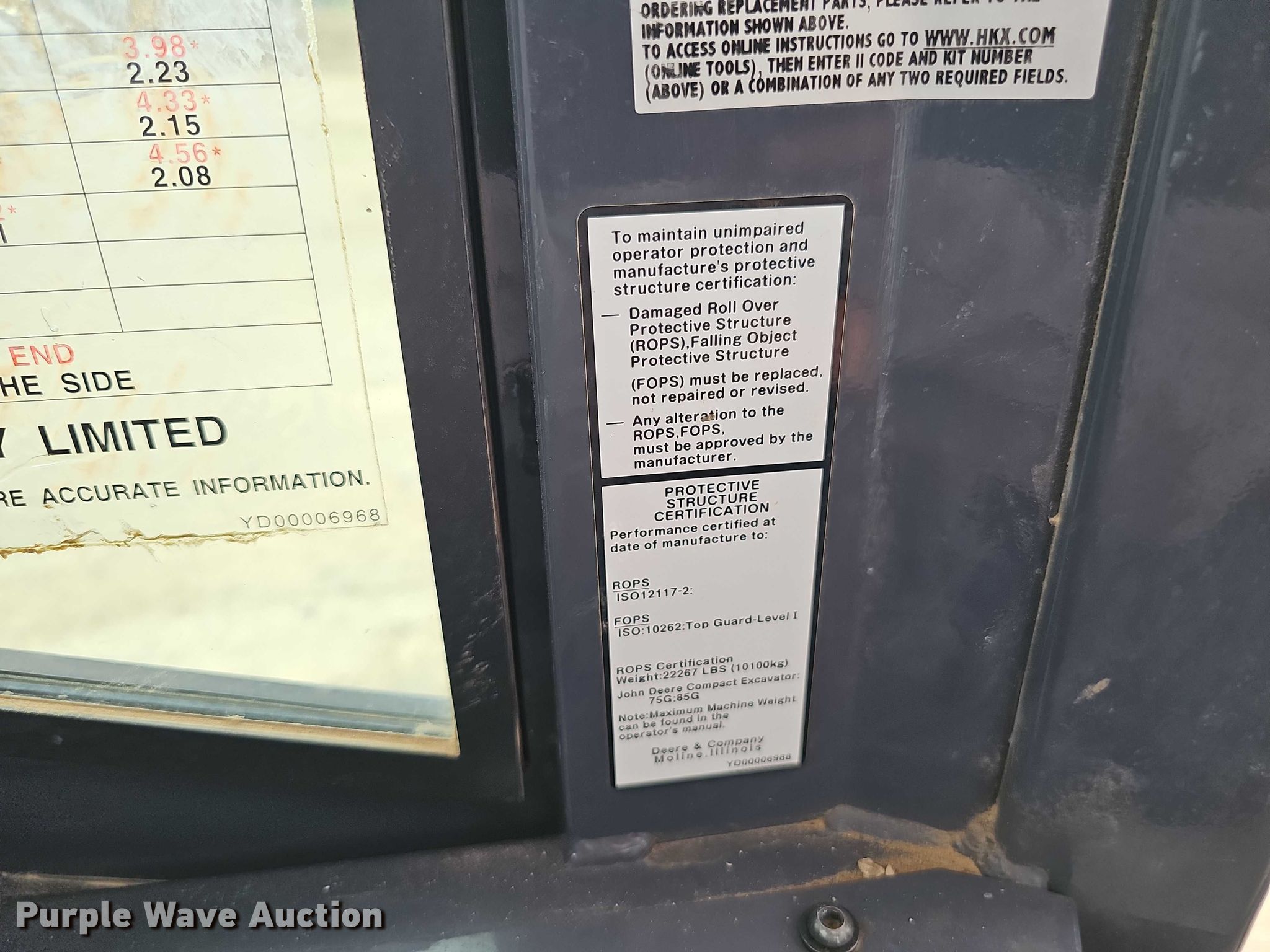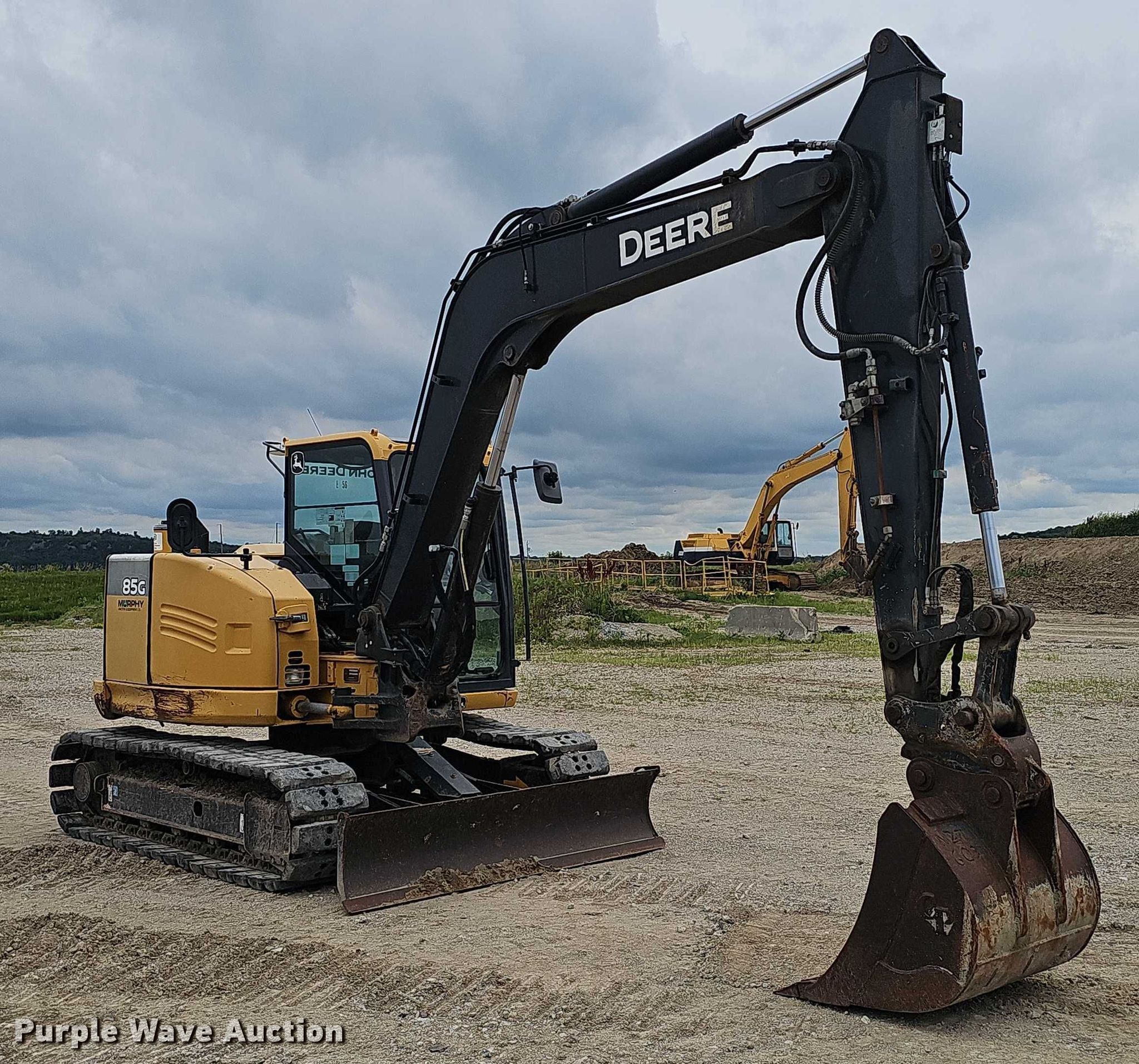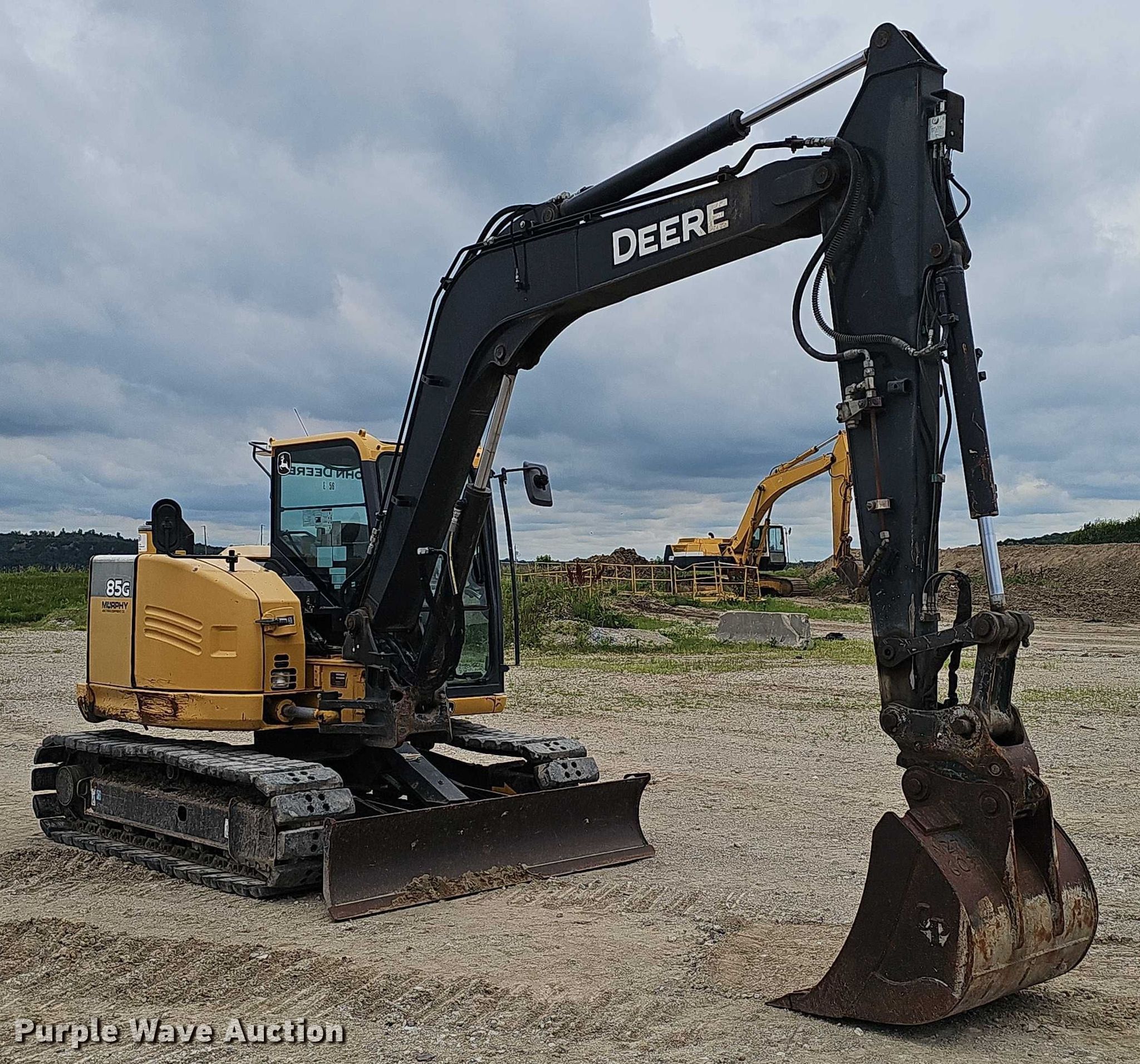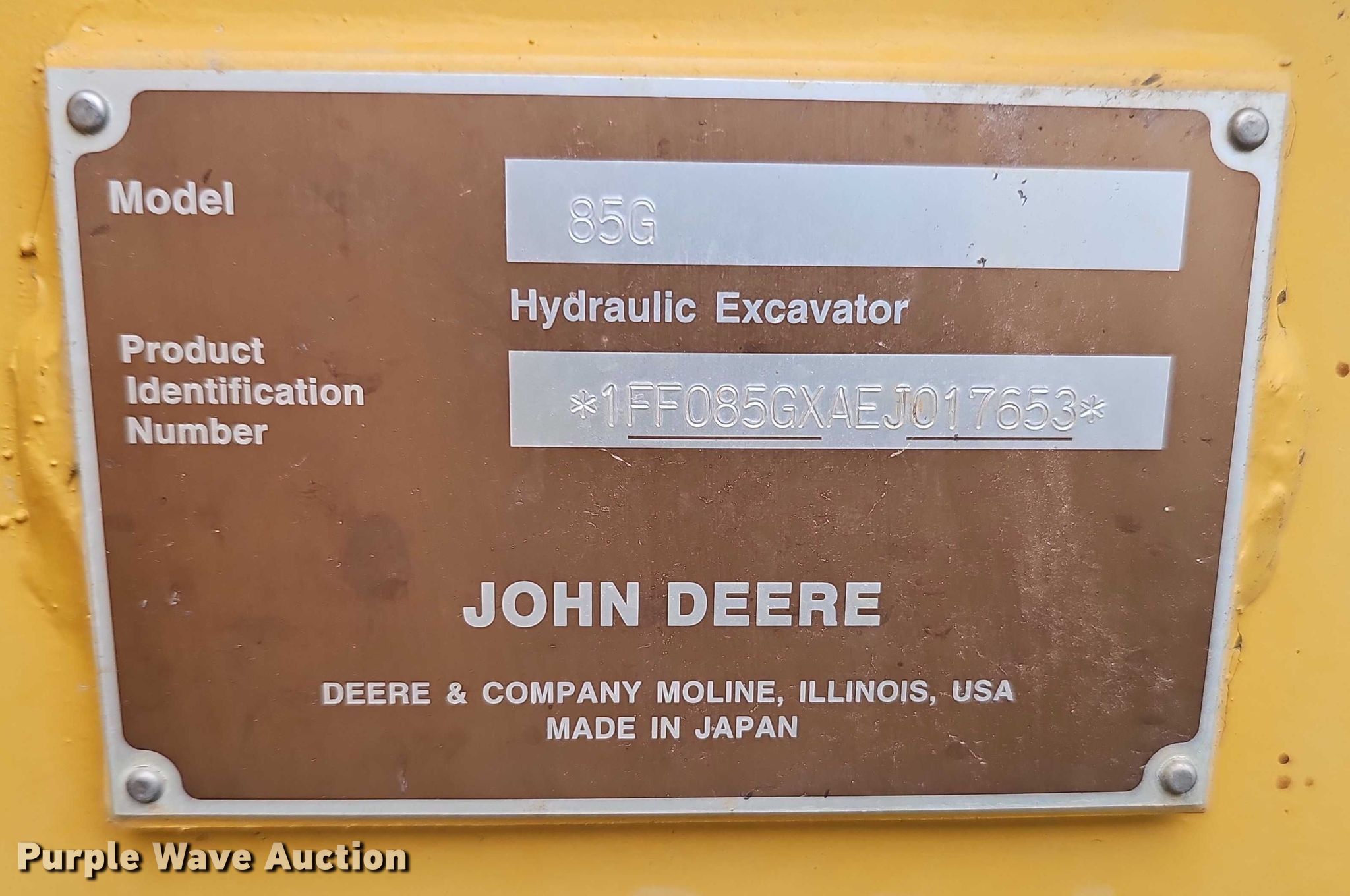 Purple Wave is selling a used Mini Excavator in Iowa. This item is a 2014 John Deere 85G mini excavator with the following: Hours: 3,574 on meter, Serial: 1FF085GXAEJ017653, Unit #: EO56