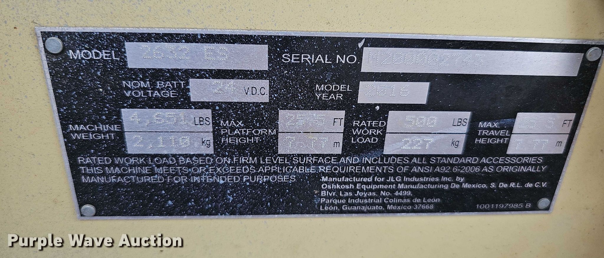 2016 JLG 2632ES scissor lift. Hours: 263 on meter, Serial: M200002743. Electric Motor Volts: 24. Features Maximum lift capacity: 500 lbs, Maximum lift height: 25' 6", Platform: 123" L x 29" W, AC power outlet, Controls: Remote Control, Ground, Platform extensions: Manual. Tires Tire size: 406x125, Solid, Non-marking. Notes Owners manual. Jordan Machinery/ S & N Auto Sales. Waterloo, NE 68069