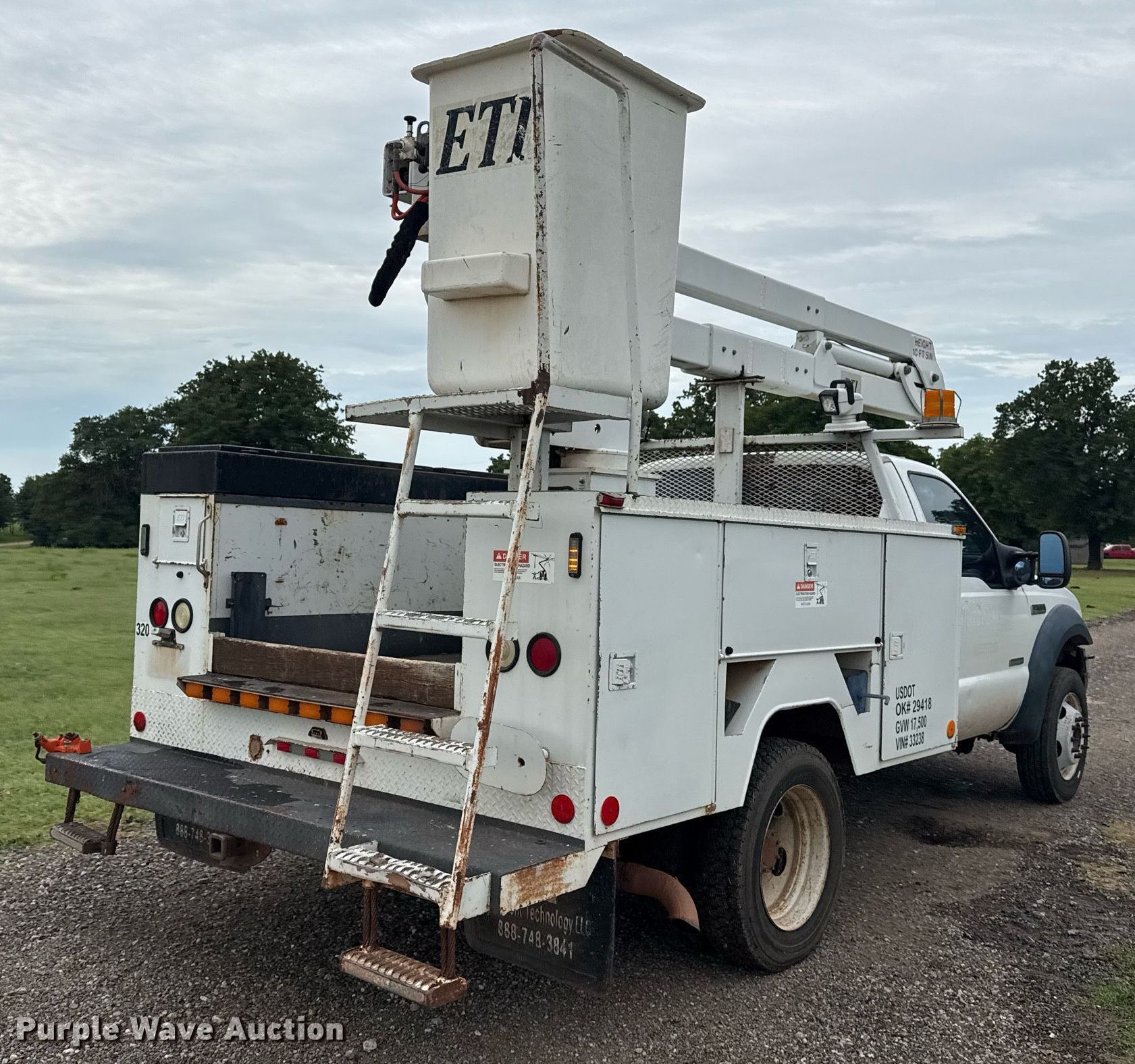 2006 Ford F550 bucket truck. Miles: 183,461 on odometer, VIN: 1FDAF56P46EA33238. Engine Displacement: 6.0L, Cylinders: 8, Fuel type: Diesel. Transmission Automatic. Chassis Axles: Single, Suspension: Spring, Brakes: Hydraulic, PTO, GVWR: 17,950 lbs, Wheelbase: 141". Interior AC, Heat, Cruise control, Auxiliary controls, Brake controller. Features Bed ETI, 9' L x 93" W, Boom ETI ETO37IH, Serial: 0705073510, Maximum lift capacity: 300 lbs, Maximum lift height: 37', Boom type: Articulating, Insulated, Man basket, Boom controls Platform/ basket.. Tires Size: 225/70R19.5. Notes Windshield chipped or cracked. Oklahoma title. Title distribution may be delayed up to 14 days from verification of funds. Jackson Electrical Construction. Wellston, OK 74881