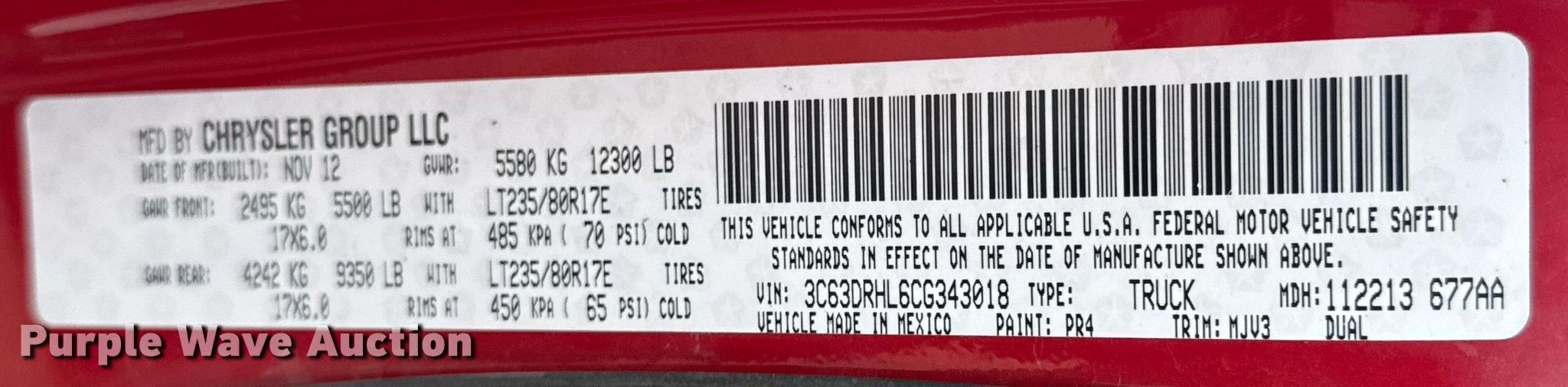 This 2012 Dodge Ram 3500 Crew Cab pickup truck will sell to the highest bidder regardless of price.