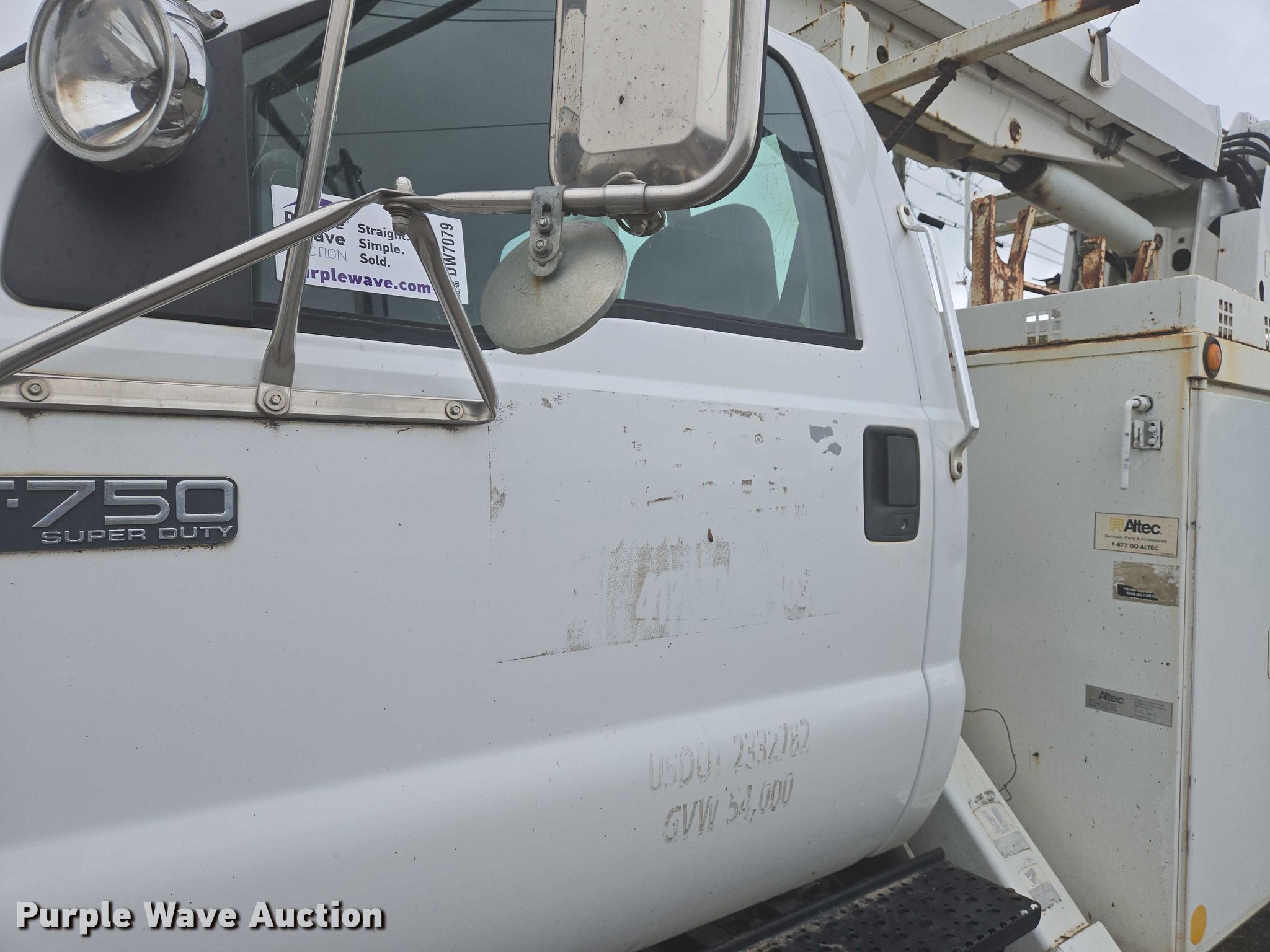 2004 Ford F750 Super Duty digger derrick truck. Miles: 120,662 on odometer, VIN: 3FRXF75P24V689468. Engine Caterpillar Assert C7, Displacement: 7.2L, Cylinders: 6, Fuel type: Diesel. Transmission Manual, Speed: 7. Chassis Axles: Single, Suspension: Spring, Brakes: Air, PTO. Interior AC, Heat, Cruise control, Brake controller. Features Bed Altec, 15' L x 96" W, Boom Altec DM47 TR, Maximum lift capacity: 12,000 lbs, Maximum lift height: 35', Boom type: Articulating, Boom controls Platform/ basket, Pole guide, Auger Diameter: 9".. Tires Size: 11R22.5. Notes Windshield chipped or cracked, Holding tank issues, hose fitting leaks. Tennessee title. Title distribution may be delayed up to 30 days from verification of funds. Utility Solutions- TN. Fayetteville, TN 37334