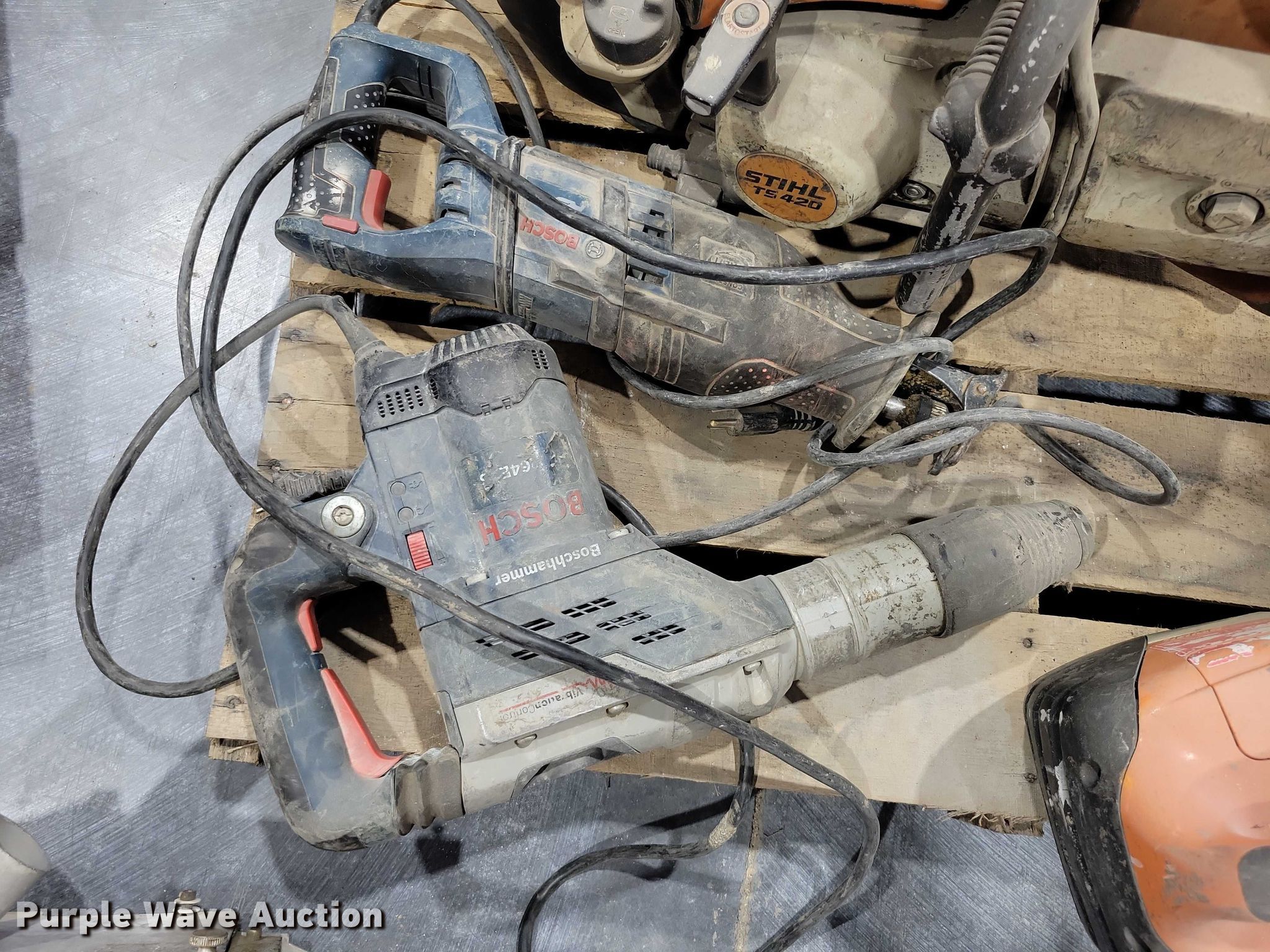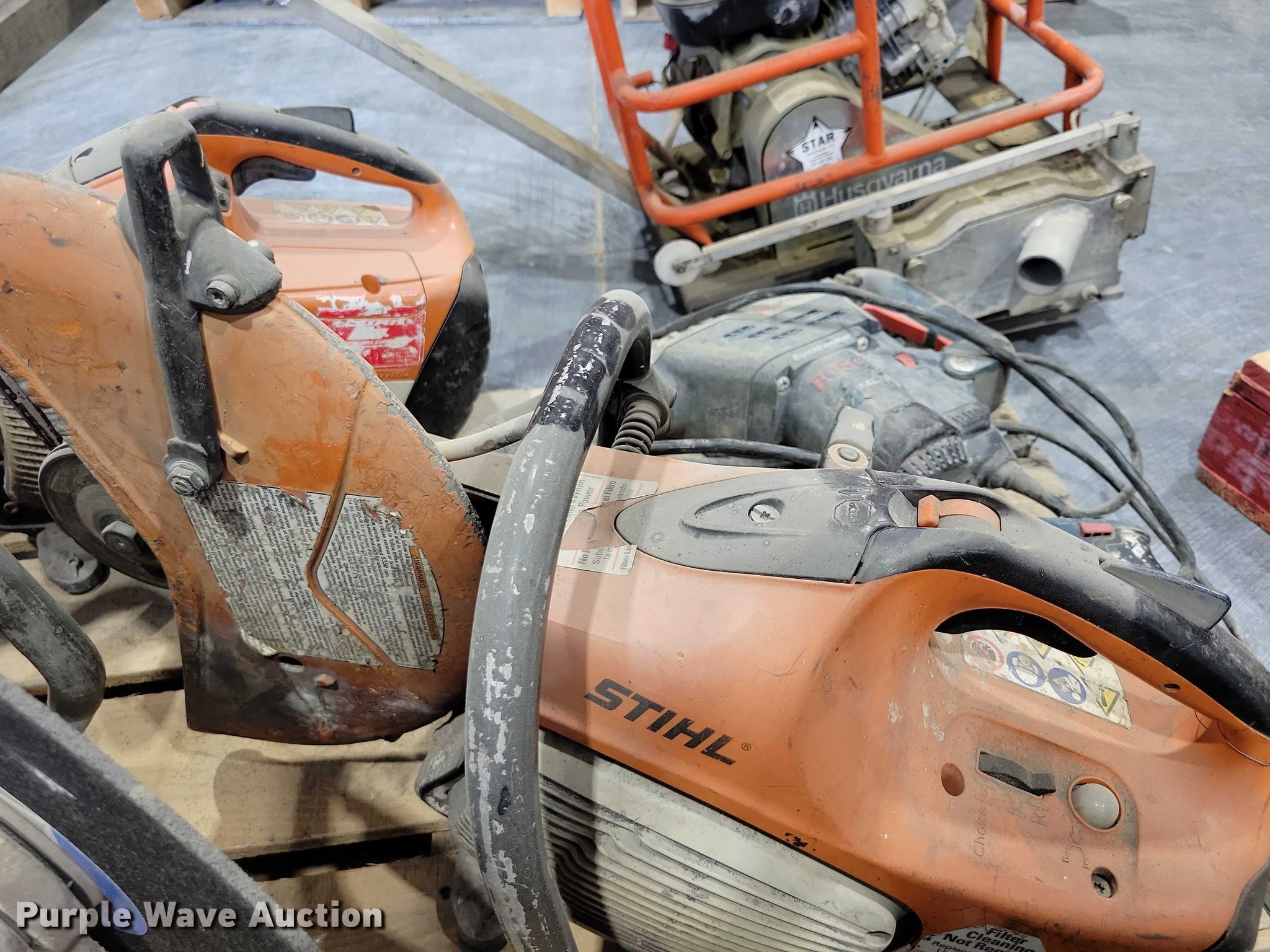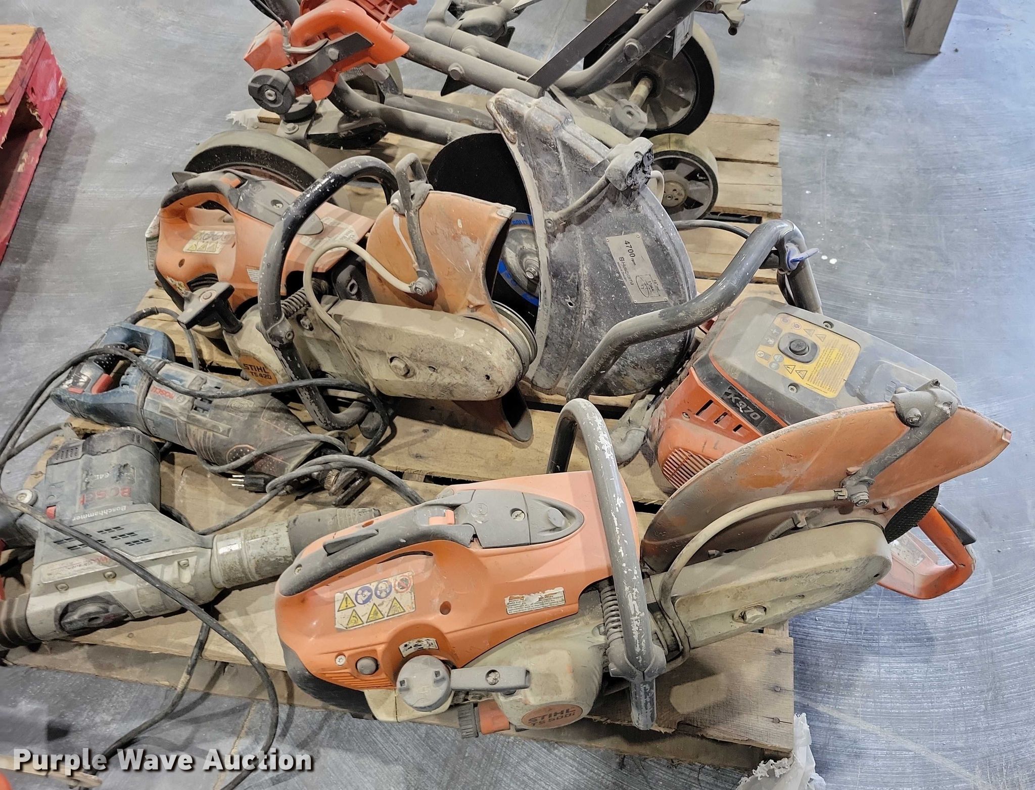 Tools. (2) saw carts, (2) Stihl concrete saws, (2) Husqvarna concrete saw, Bosch hammer drill, Bosch sawzall, Unknown operating condition of units. JAS Concrete. Bondurant, IA 50035
