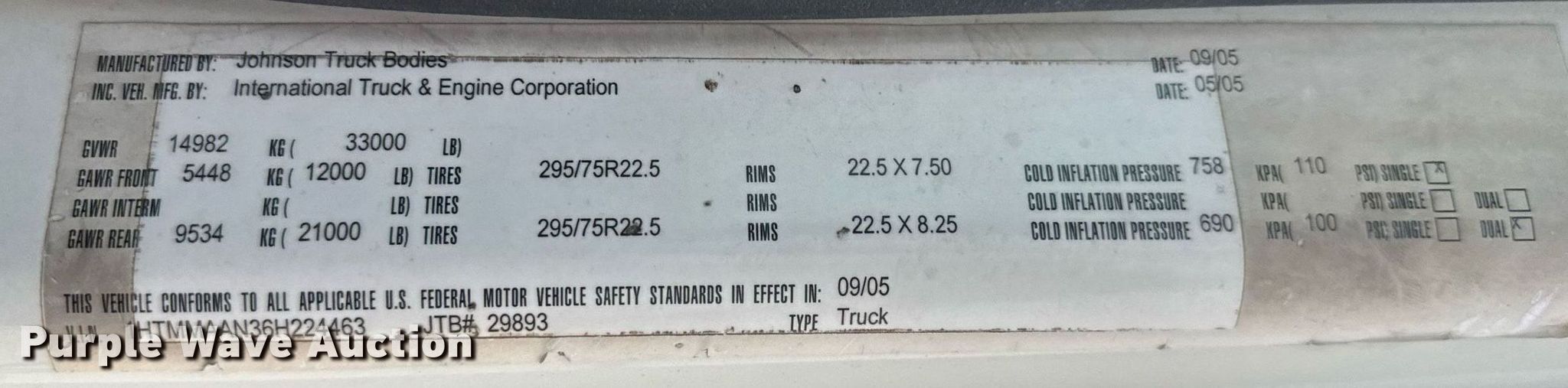 2006 International 4300 SBA water truck. Miles: 203,753 on odometer, Hours: 7,508 on meter, VIN: 1HTMMAAN36H224463. Engine International D245CFF, Serial: 466HM2U2069749, Displacement: 7.6L, Cylinders: 6, Fuel type: Diesel, HP: 245. Transmission Allison, Automatic. Chassis Axles: Single, Suspension: Spring, Brakes: Air, PTO, GVWR: 33,000 lbs, Wheelbase: 600". Interior AC, Heat, Heated mirrors, Cruise control, Auxiliary controls. Features Bed / tank Rosco DS2000, Serial: 98242, Capacity: 2,000 gallons, 10' L x 84" W, Spray bar: Front, Rear, Side discharge, Top fill. Tires Size: 295/75R22.5. Notes AC issues, needs charged, Dash warning indicator: Check AC. Colorado title. Title distribution may be delayed up to 14 days from verification of funds. American Enterprises LTD. Strasburg, CO 80136