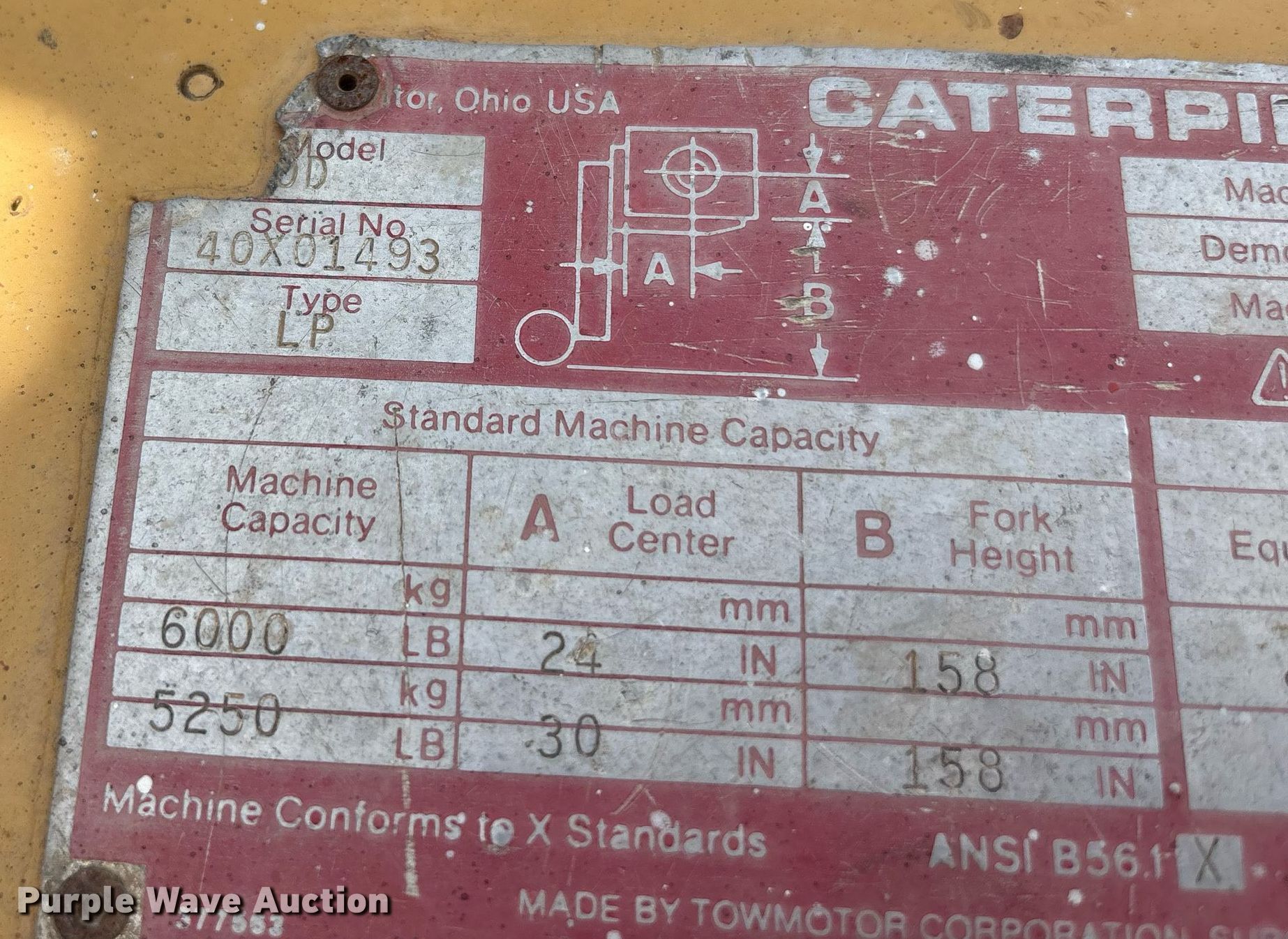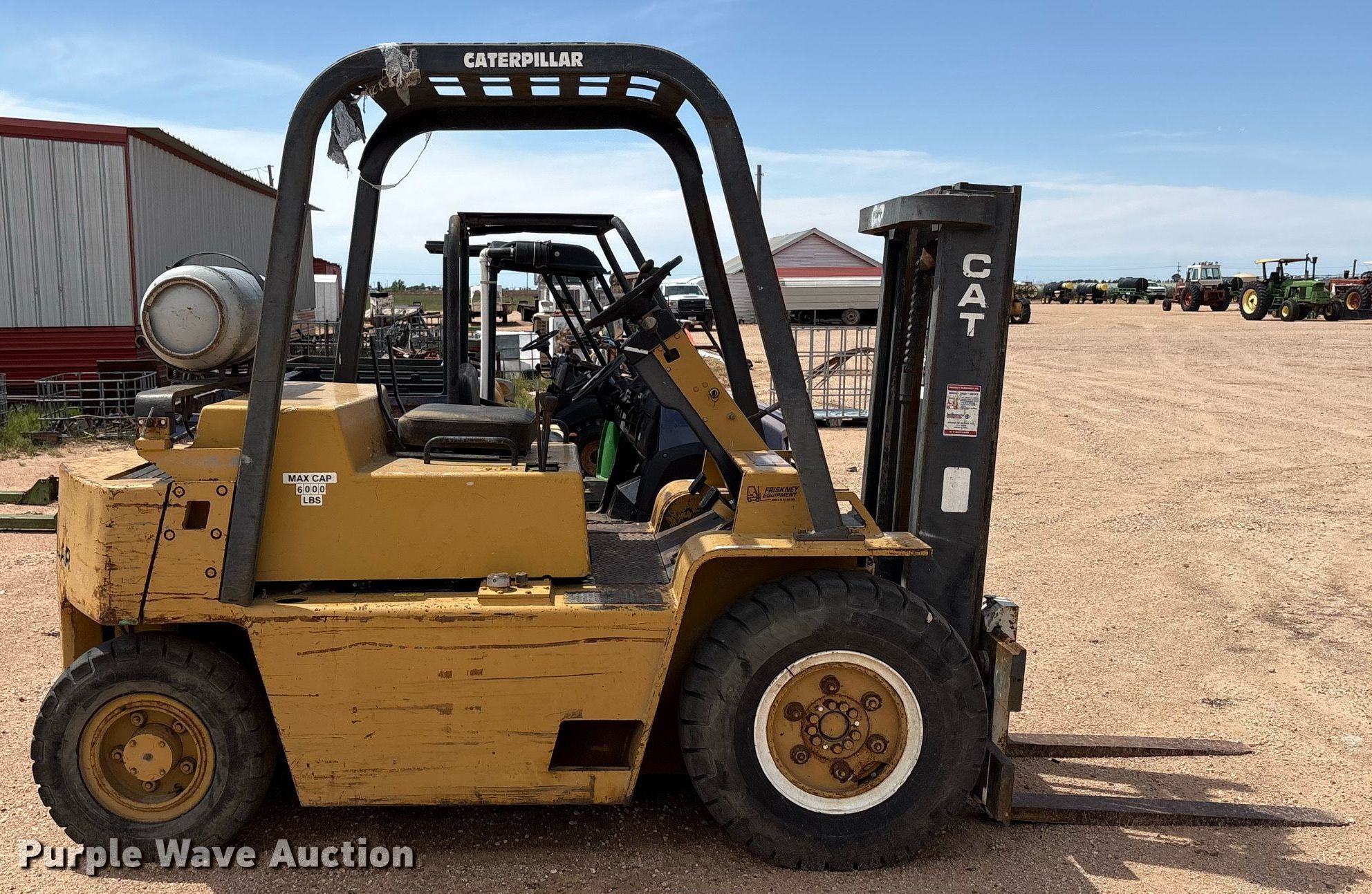 Caterpillar forklift. Hours: 3,642 on meter, Serial: 40X01493. Engine Cylinders: 4, Fuel type: LPG LP bottle: Not included. Transmission Powershift. Operators station Canopy. Features Maximum lift capacity: 6,000 lbs, Maximum lift height: 158", Collapsed mast height: 74", Mast stages: 2, Mast tilt, Fork length: 40". Tires Front: 8.25-15, Rear: 7.00-12. Notes Fuel leak , Unknown operating condition. Harmon Farms. Lubbock, TX 79403