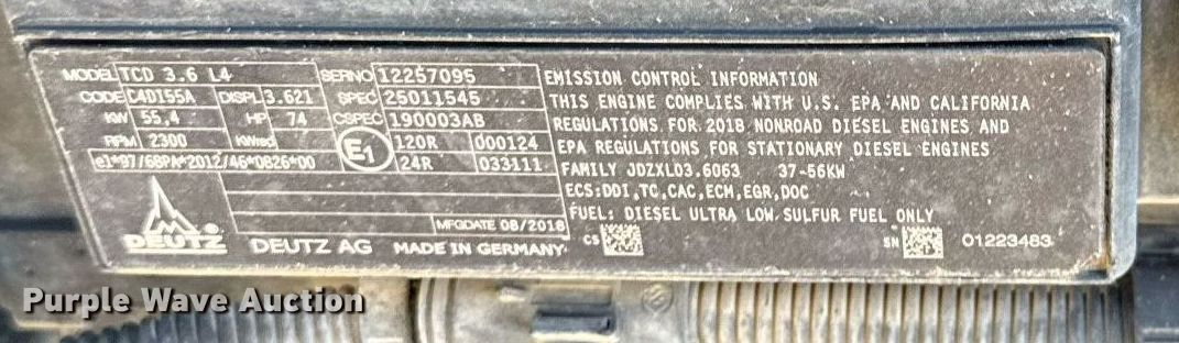 2018 Skyjack SJ1056TH telehandler. Hours: 3,282 on meter, Serial: 87311071. Engine Deutz, Displacement: 3.6L, Cylinders: 4, Fuel type: Diesel. Transmission Hydrostatic, Four wheel drive. Operators station OROPS, Steering: Crab, Four wheel. Features Maximum lift capacity: 10,000 lbs, Maximum lift height: 56', Boom stages: 4, Fork length: 60", Auxiliary hydraulics, Hydraulic outriggers, Hydraulic leveling, Quick attach: Manual. Tires Size: 17.5-25. HME, Inc.. Topeka, KS 66618