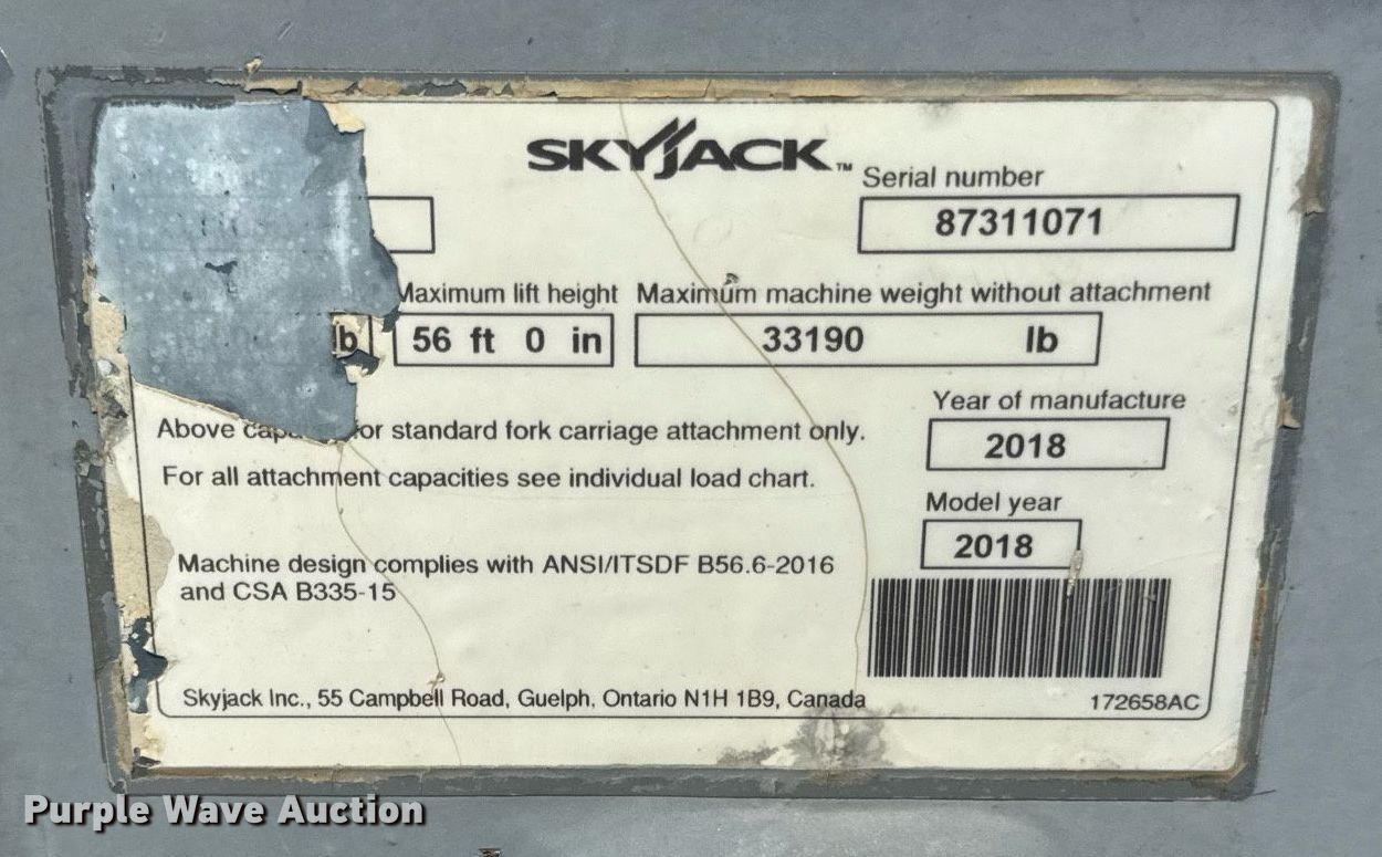 Purple Wave is selling a used Telehandler in Kansas. This item is a 2018 Skyjack SJ1056TH telehandler with the following: Hours: 3,282 on meter, Serial: 87311071
