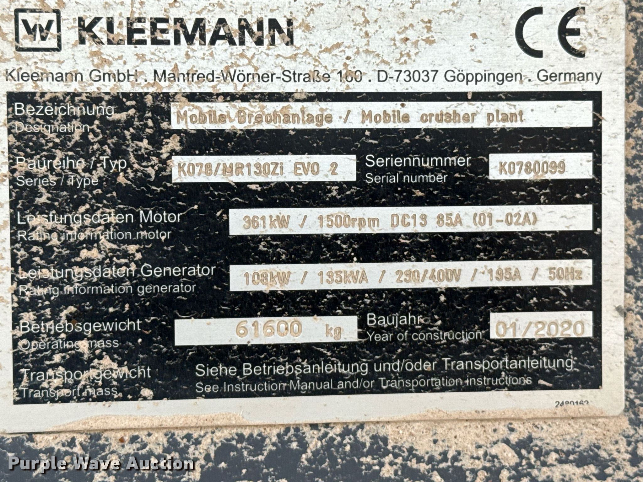 Purple Wave is selling a used Crusher or Crushing Plant in Kansas. This item is a 2020 Kleemann Mobirex MR 130 Zi EVO2 impact crushing plant with the following: Hours: 5,930 on meter, Serial: K0780099