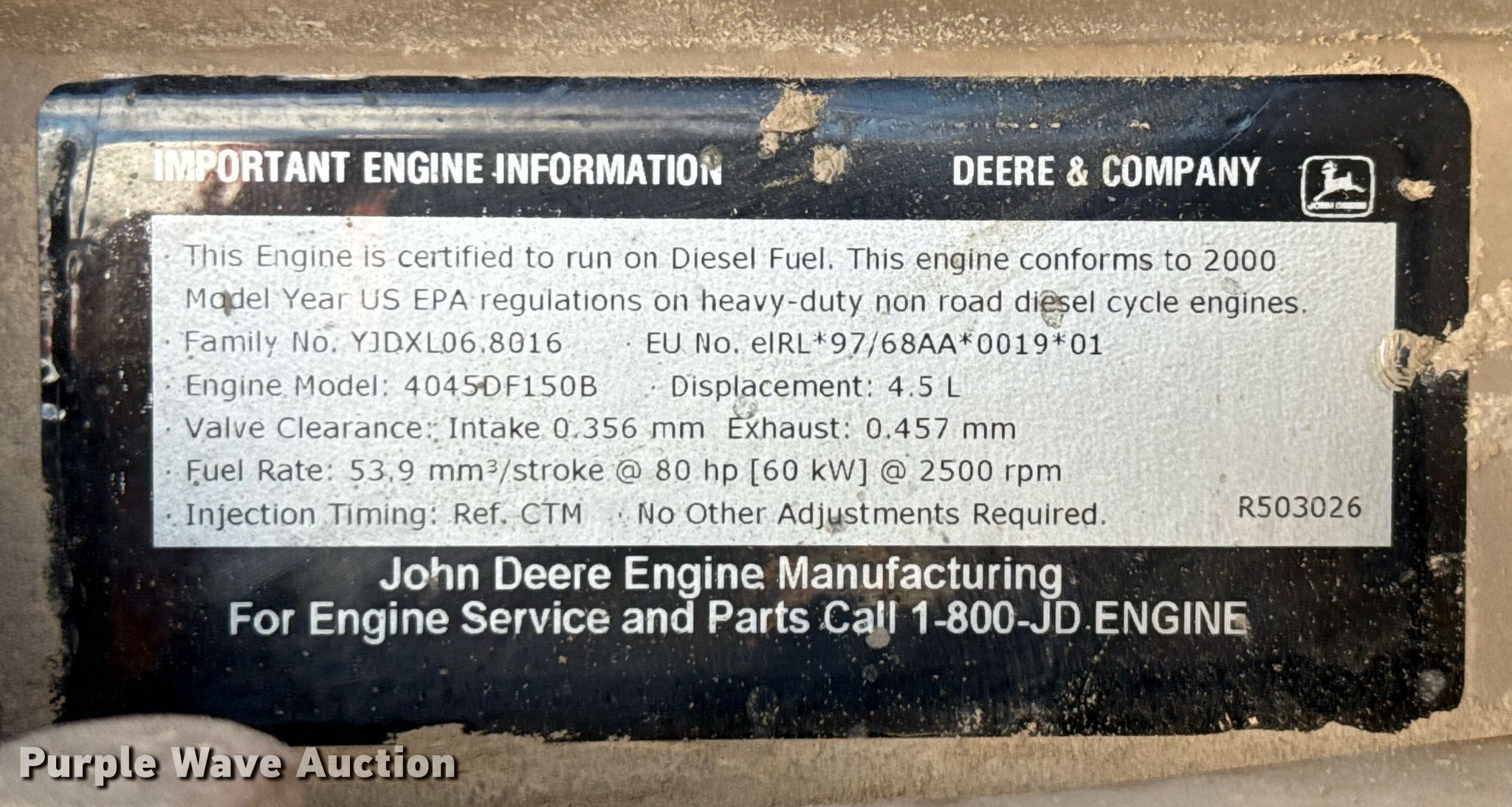 2000 Ingersoll-Rand PT-125R pneumatic roller. Hours: 2,487 on meter, Serial: 162576. Engine John Deere 4045, Displacement: 4.5L, Cylinders: 4, Fuel type: Diesel, HP: 80, kW: 60. Transmission Hydrostatic, Two speed travel. Features Water spray applicator: Front. Tires Size: 7.50-15, Quantity: 9. Notes Non-operational water spray applicator. SB Contractors, LLC. New Braunfels, TX 78132