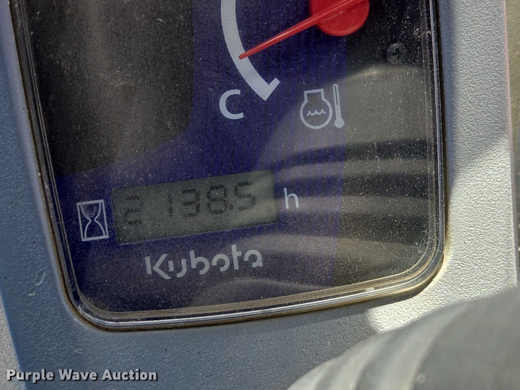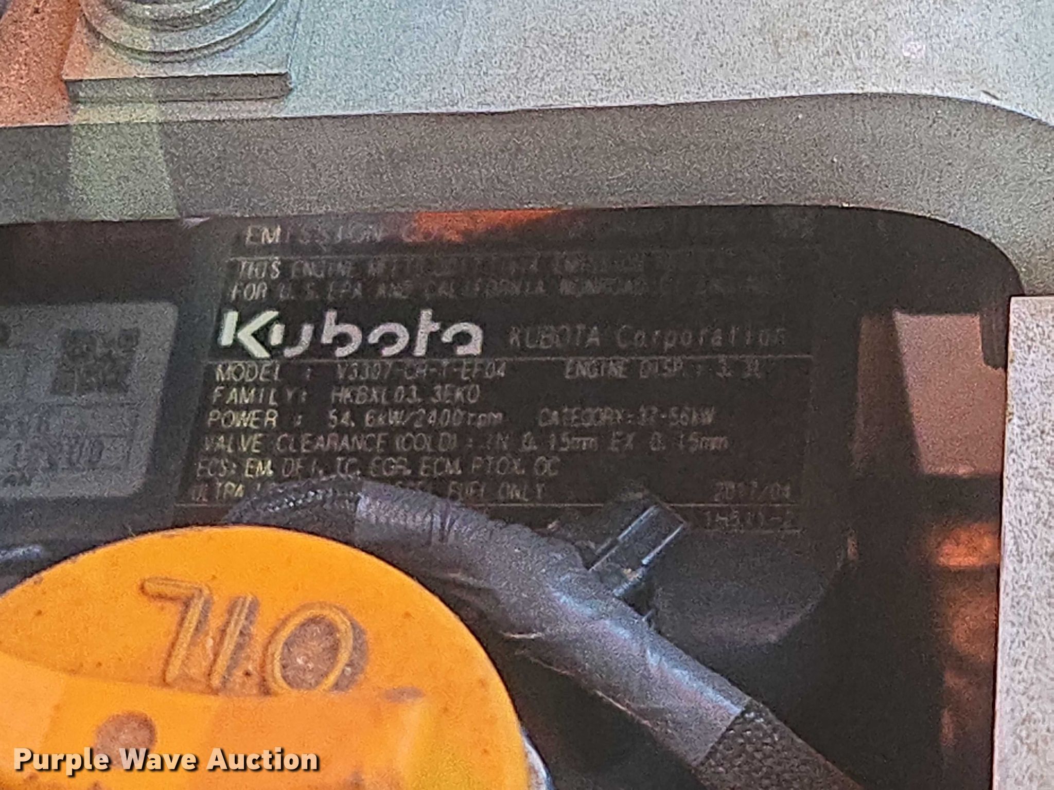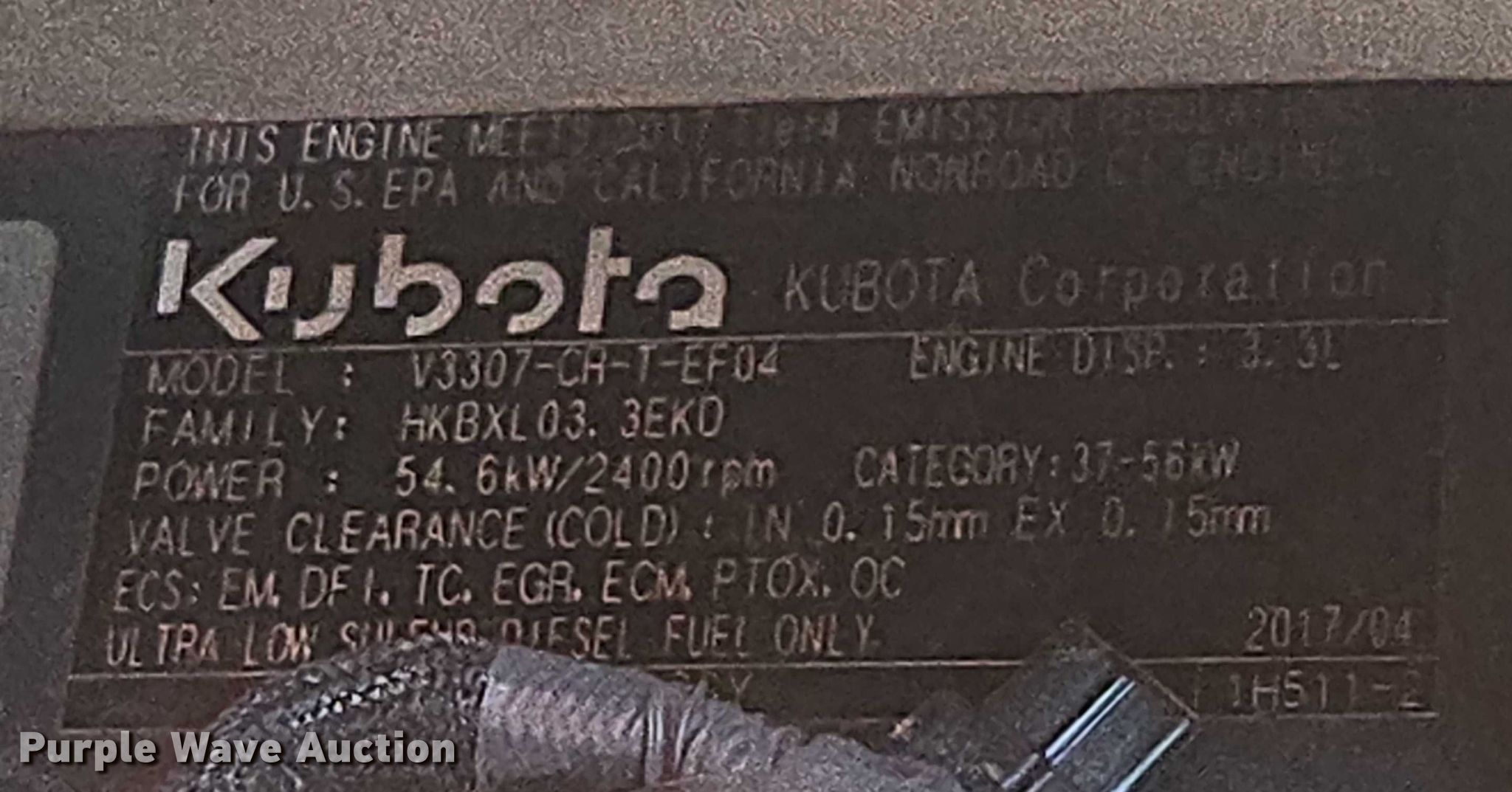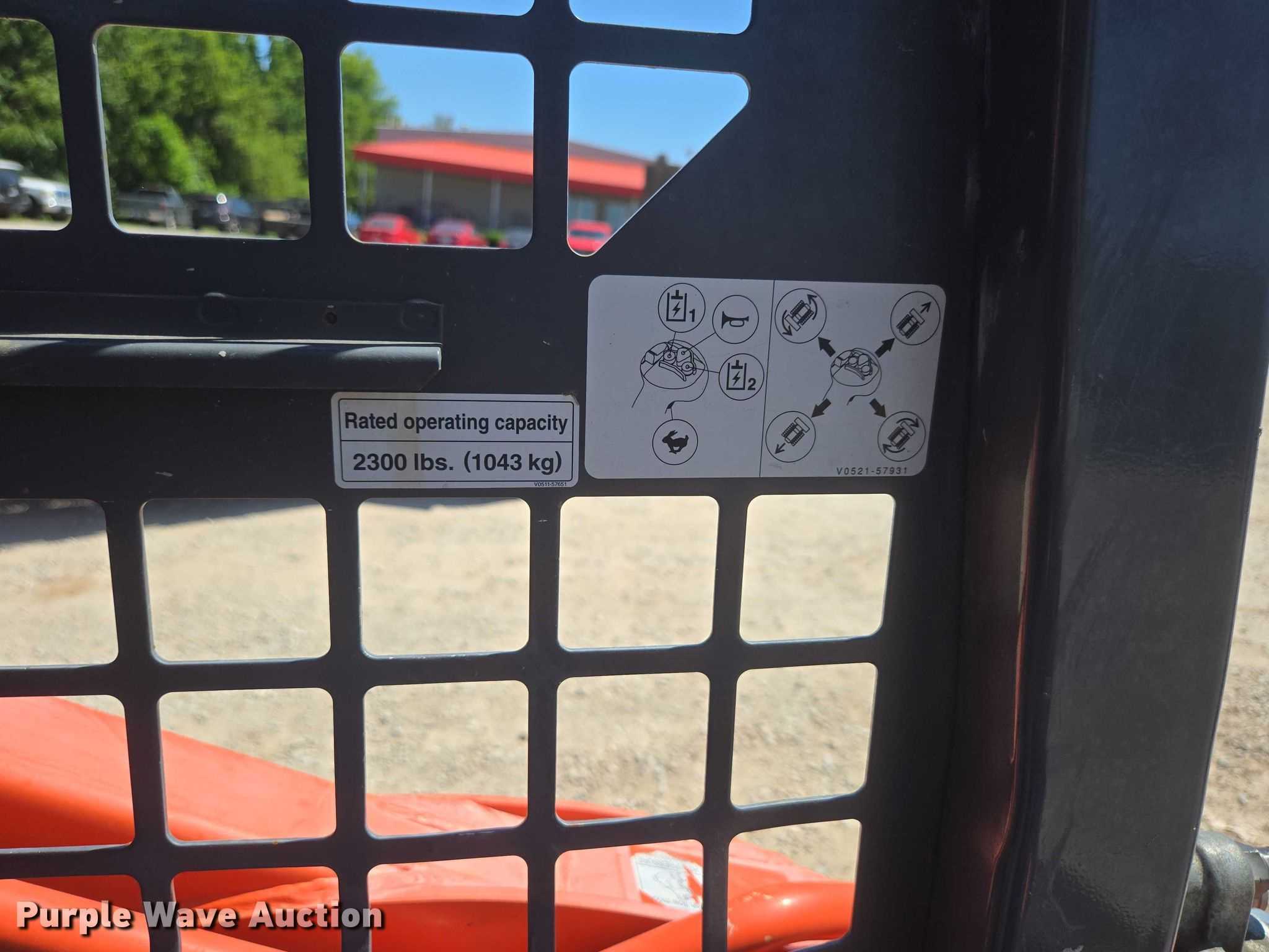 Kubota SVL 75-2 tracked skid steer loader. Hours: 2,139 on meter. Engine Kubota V3307-CR-T-EF04, Serial: 8HG5598, Displacement: 3.3L, Cylinders: 4, Fuel type: Diesel, kW: 54.6. Transmission Hydrostatic. Operators station OROPS, Bucket control: Hand. Features Auxiliary hydraulics, Quick coupler: Manual, Bucket Width: 65", Teeth: Weld-on. Tracks Width: 15". Superior Rents. Springfield, MO 65803