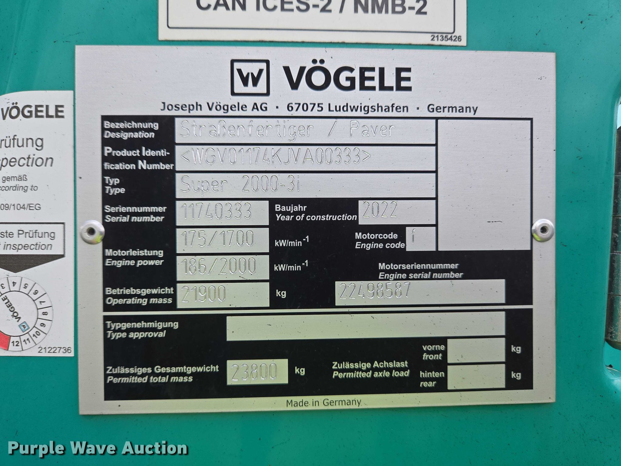 Purple Wave is selling a used Paver or Screed in Ohio. This item is a 2022 Vogele Super 2000-3i paver with the following: Hours: 774 on meter, Serial: WGV01174KJVA00333, Unit #: 60171375