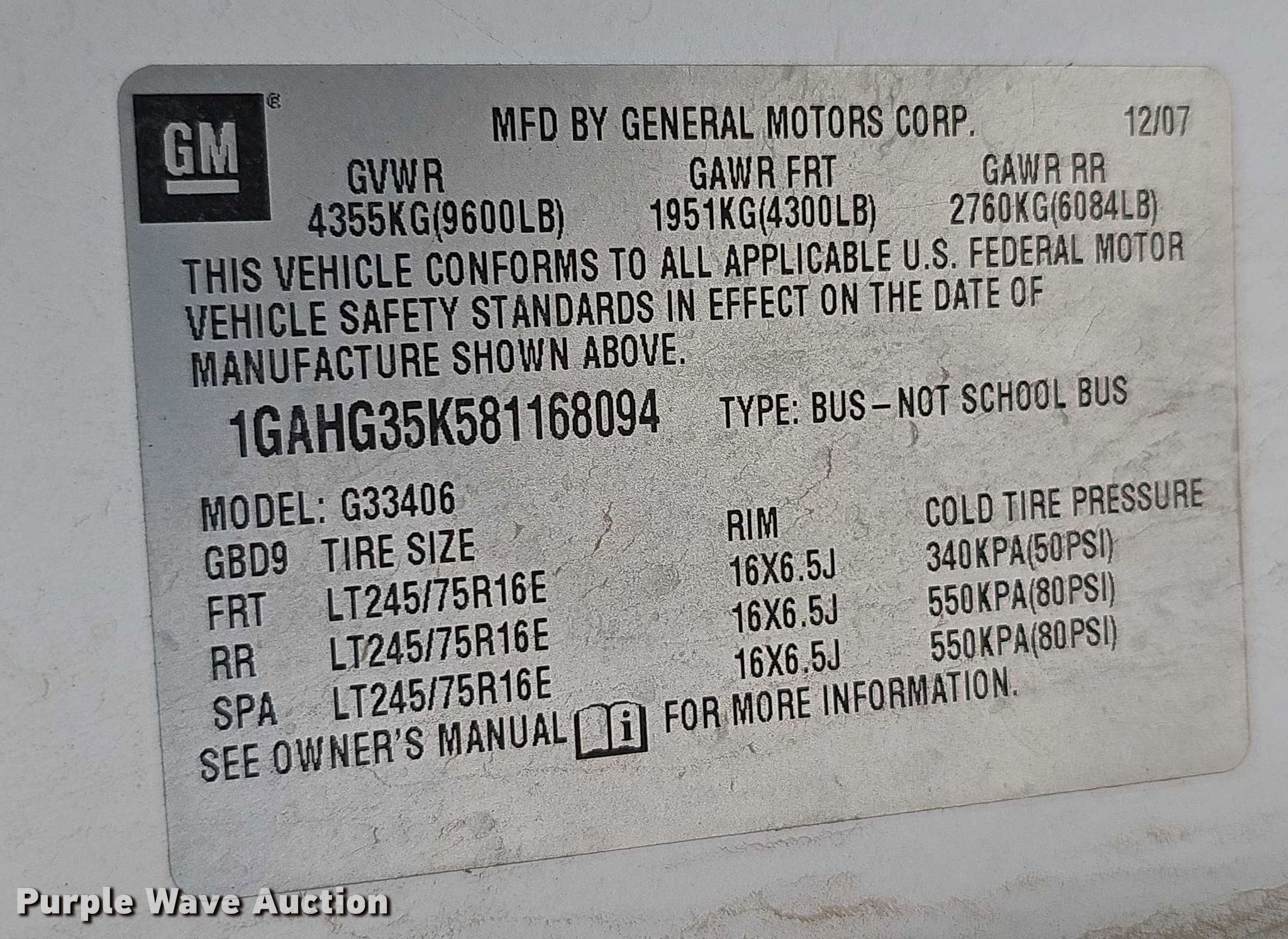 Purple Wave is selling a used Passenger Vehicle in Nebraska. This item is a 2008 Chevrolet Express 3500 van with the following: Miles: 136,363 on odometer, Hours: 5,540 on meter, VIN: 1GAHG35K581168094, Unit #: 8