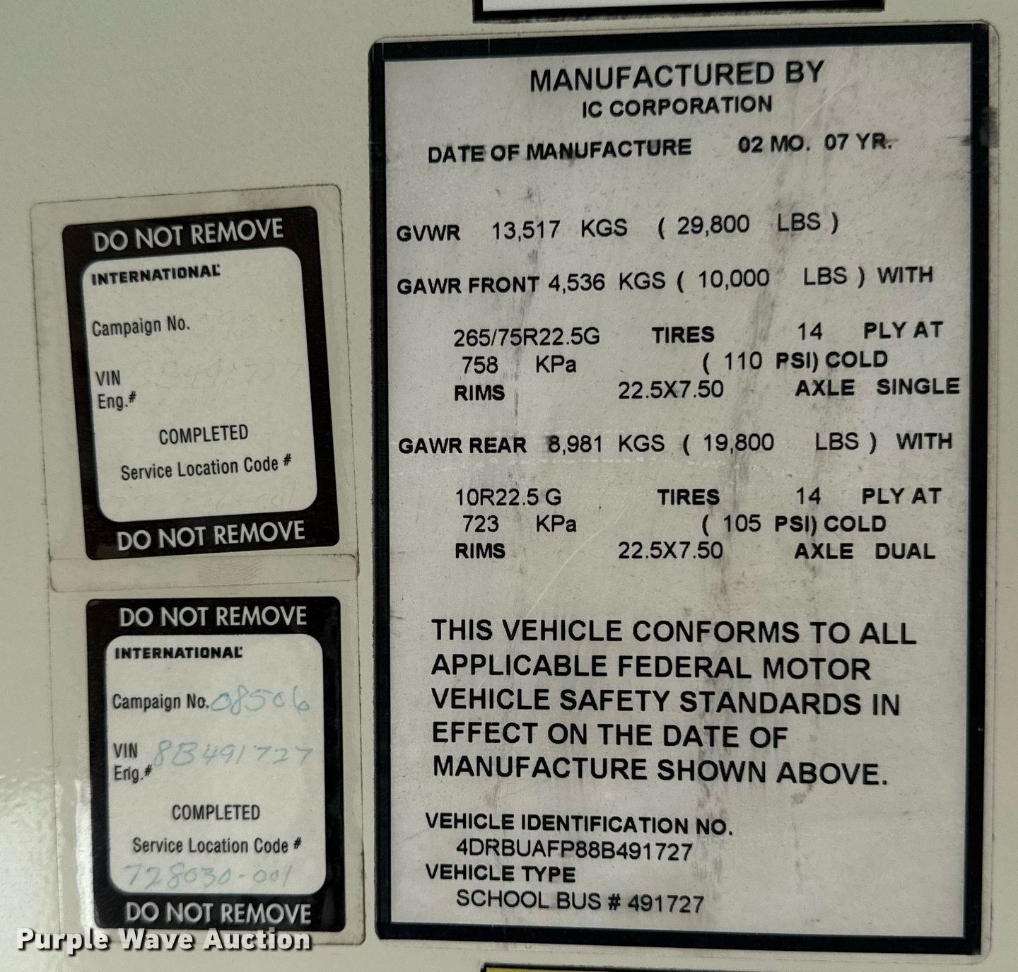 Purple Wave is selling a used Bus in Kansas. This item is a 2008 IC CE200 school bus with the following: Miles: 120,373 on odometer, Hours: 7,411 on meter, VIN: 4DRBUAFP88B491727