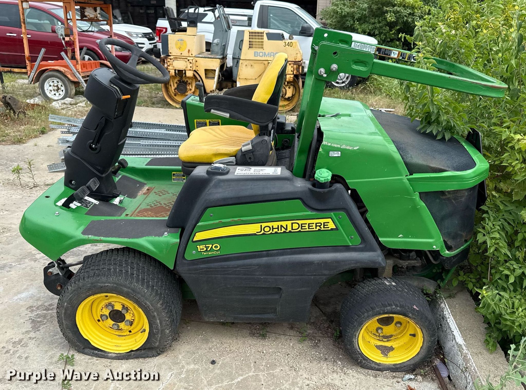 Purple Wave is selling a used Commercial Turf Mower in Kansas. This item is a John Deere 1570 ZTR lawn mower with the following: Cylinders: 3, Fuel type: Diesel