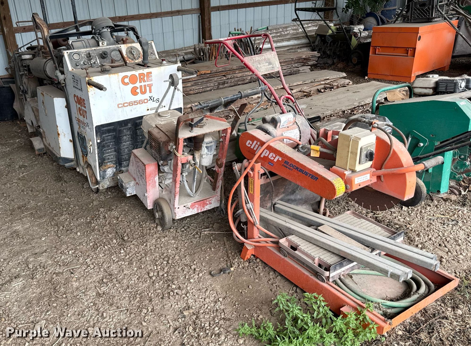 Purple Wave is selling a used Concrete Equip. or Acces. in Kansas. This item is a (4) concrete saws with the following: Clipper Blockbuster, Core Cut 1300, Core Cut CC6560, Target