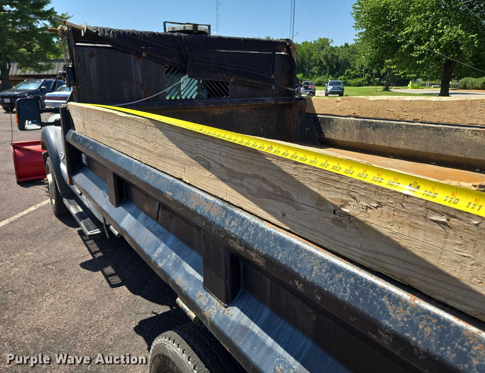 2014 Ford F450 Super Duty XL dump truck. Miles: 97,912 on odometer, VIN: 1FDUF4HT7EEA04414. Engine Displacement: 6.7L, Cylinders: 8, Fuel type: Diesel. Transmission Automatic. Chassis Axles: Single, Suspension: Spring, Brakes: Hydraulic, GVWR: 16,500 lbs FAWR: 7,000 lbs, RAWR: 12,000 lbs. Interior AC, Heat, Heated mirrors, Power windows, Cruise control, Brake controller. Features Dump bed TBEI, 11' L x 96" W, Bed type: Steel, Roll tarp, Ram: Single, End gate: Manual, Plow Boss, Width: 108". Tires Size: 225/70R19.5. Notes Hail damage, Side dump switch issues, ceased, Snow plow mount bracket issues, welds cracking. Kansas title. Title distribution may be delayed up to 14 days from verification of funds. City of Edwardsville, KS. 690 S 4th St. Kansas City, KS 66111
