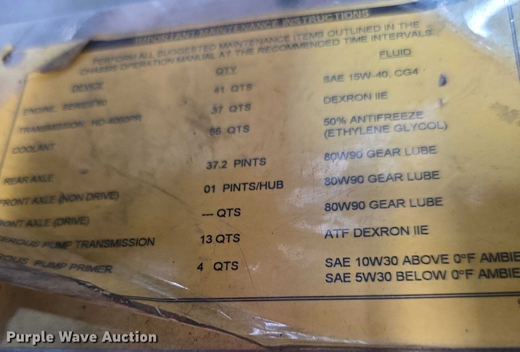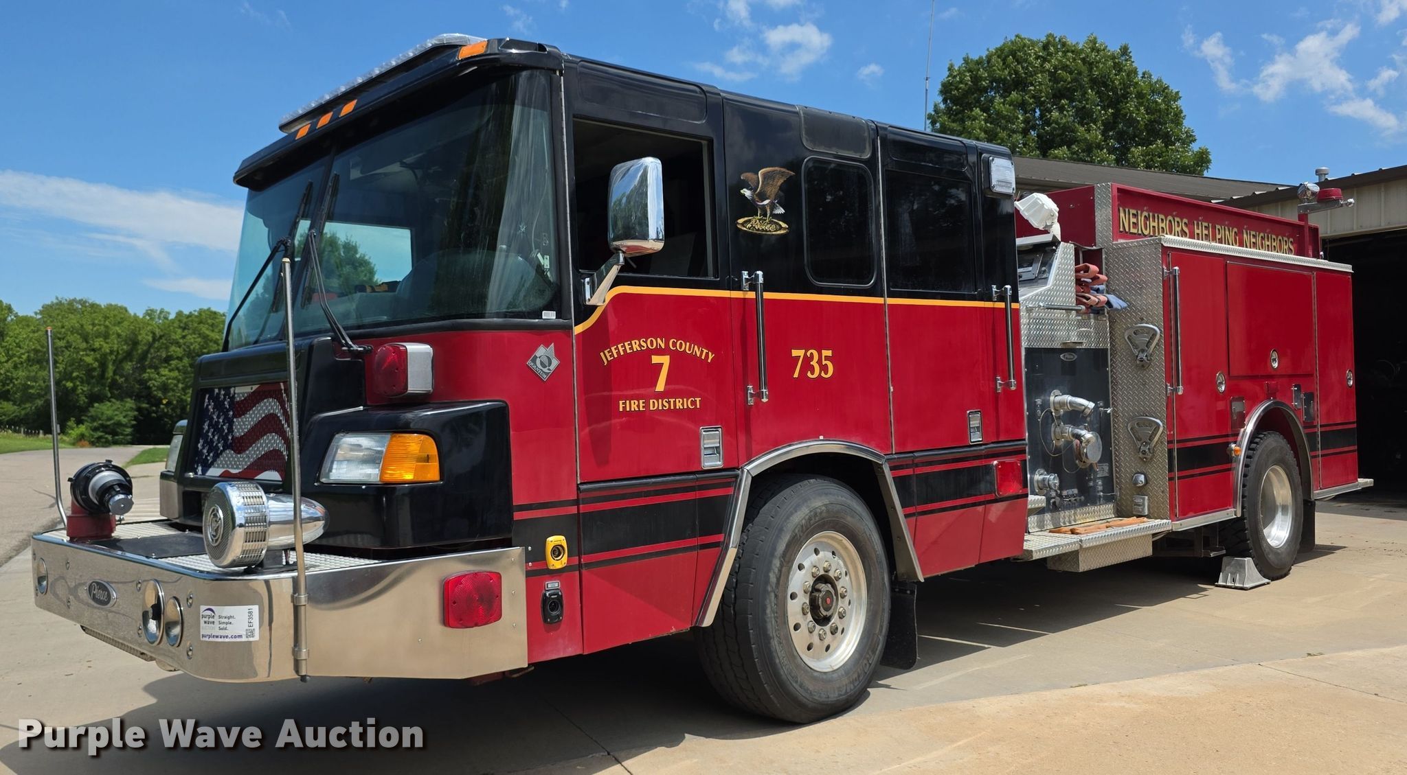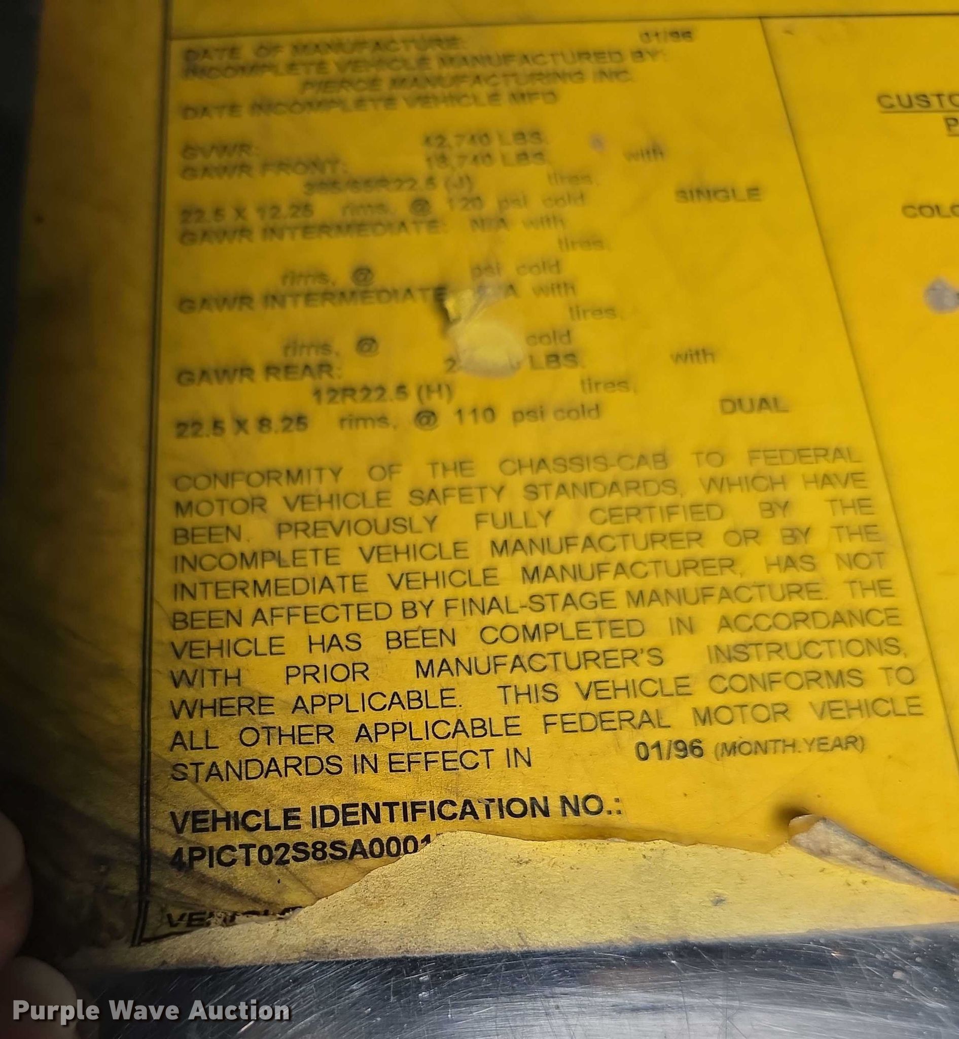 1995 Pierce Quantum pumper fire truck. Miles: 101,777 on odometer, Hours: 6,985 on meter, Hours: 2,909 on second meter, Miles or hours may vary, unit still in use, VIN: 4PICT02S8SA000173, Unit #: 735. Engine Detroit Diesel, Cylinders: 6, Fuel type: Diesel, HP: 450. Transmission Allison, Automatic. Chassis Axles: Single, Suspension: Spring, Brakes: Air, GVWR: 42,740 lbs, Wheelbase: 198". Interior AC, Heat. Features Fire truck body Certification valid through: 11/2025, Elevated deck gun 1,250 gpm, Tank Capacity: 1,000 gallons, Pump 1,250 gpm, Hose 5" diameter, Generator Honda EM5000S, Fuel type: Gas, Watts: 5,000, PA/ siren controls, Ground ladder, Extension ladder. Tires Front: 385/65R22.5, Rear: 12R22.5. Notes Contents not included, Dash warning indicator: ABS, Windshield chipped or cracked. Kansas title. Title distribution may be delayed up to 14 days from verification of funds. Jefferson County Fire District #7. Ozawkie, KS 66070