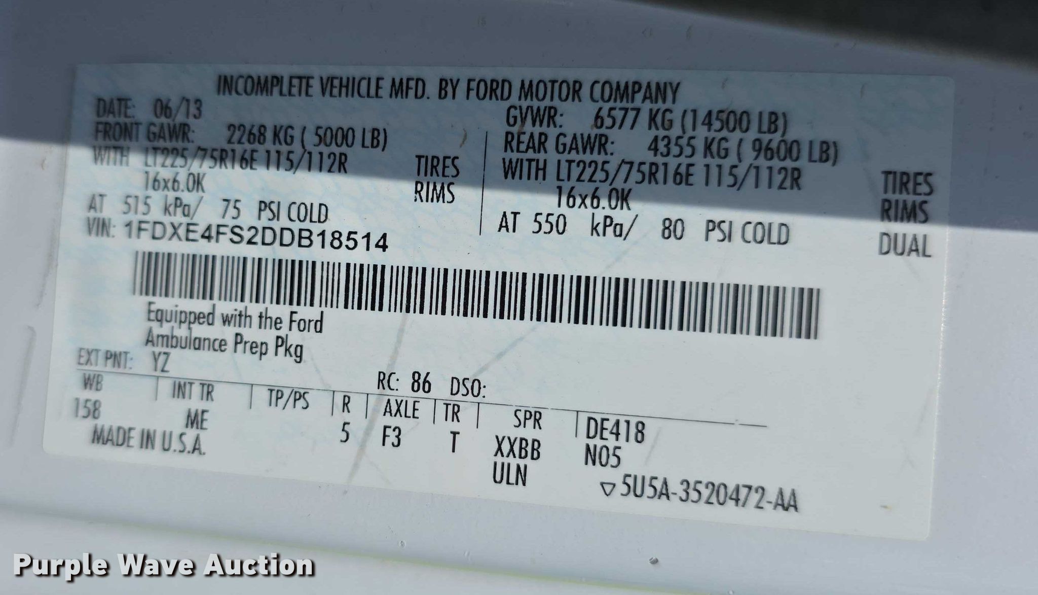2013 Ford E450 ambulance. Miles: 182,207 on odometer, VIN: 1FDXE4FS2DDB18514, Unit #: DES18514. Engine Displacement: 6.8L, Fuel type: Gas. Transmission Automatic. Chassis Axles: Single, Suspension: Spring, Brakes: Hydraulic, GVWR: 14,500 lbs, Wheelbase: 156". Interior Heat, Power windows, Power locks, Cruise control. Features Ambulance body horton 553AIII, PA/ siren controls, Oxygen hookups. Tires Size: 225/75R16, Brand: Bridgestone. Notes Decals will be removed prior to auction, Electrical issues, Possible engine issues, will not stay running while in gear , Unit must be towed or hauled, Dead battery. Kansas title. Title distribution may be delayed up to 14 days from verification of funds. Johnson County, KS. Olathe, KS 66061