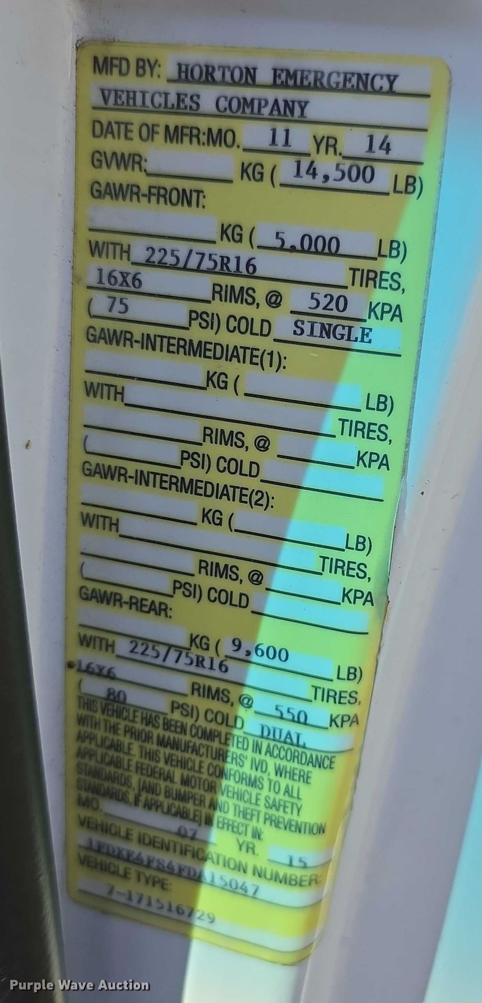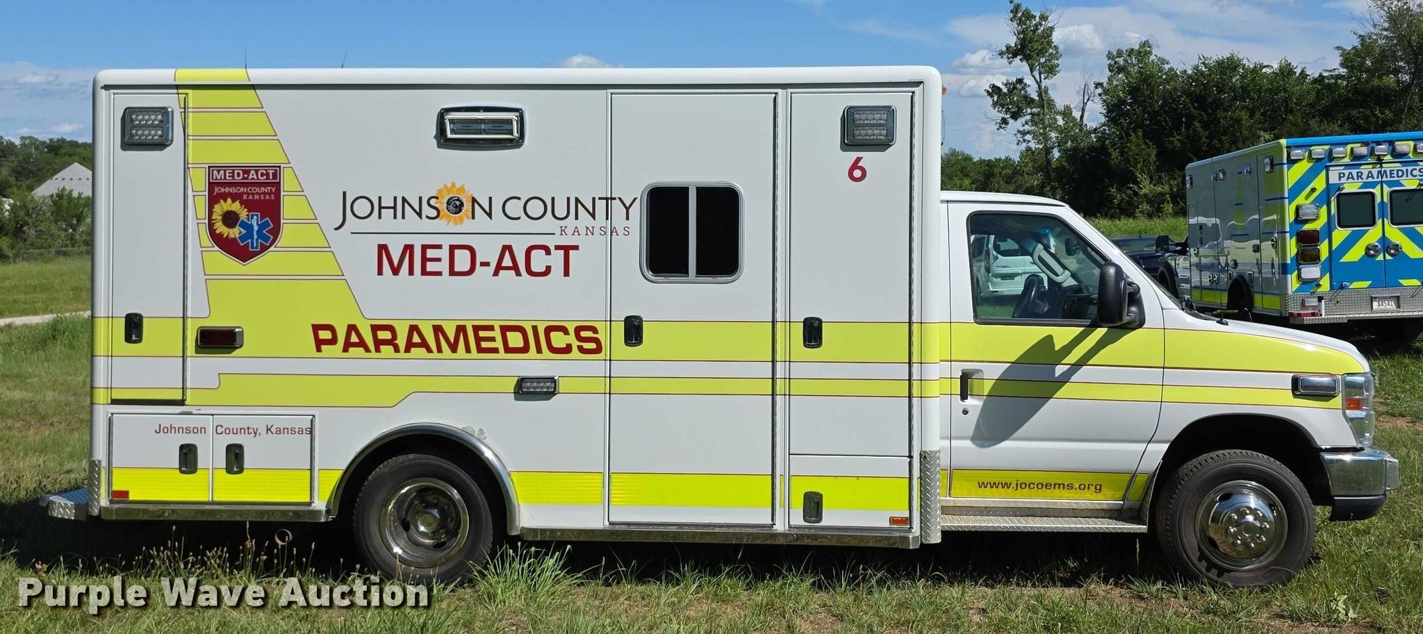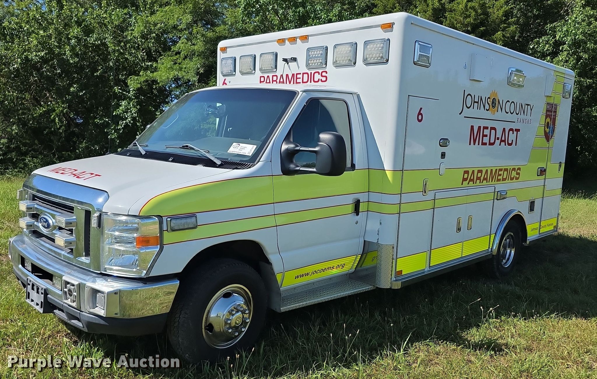 2015 Ford E450 ambulance. Miles: 205,927 on odometer, VIN: 1FDXE4FS4FDA15047, Unit #: DES15047. Engine Displacement: 6.8L, Fuel type: Gas. Transmission Automatic. Chassis Axles: Single, Suspension: Spring, Brakes: Hydraulic, GVWR: 14,500 lbs, Wheelbase: 164". Interior AC, Heat, Power windows, Power locks, Cruise control. Features Ambulance body Horton 553AIII, PA/ siren controls, Oxygen hookups. Tires Size: 225/75R16, Brand: Bridgestone. Notes Decals will be removed prior to auction, Dead battery. Kansas title. Title distribution may be delayed up to 14 days from verification of funds. Johnson County, KS. Olathe, KS 66061