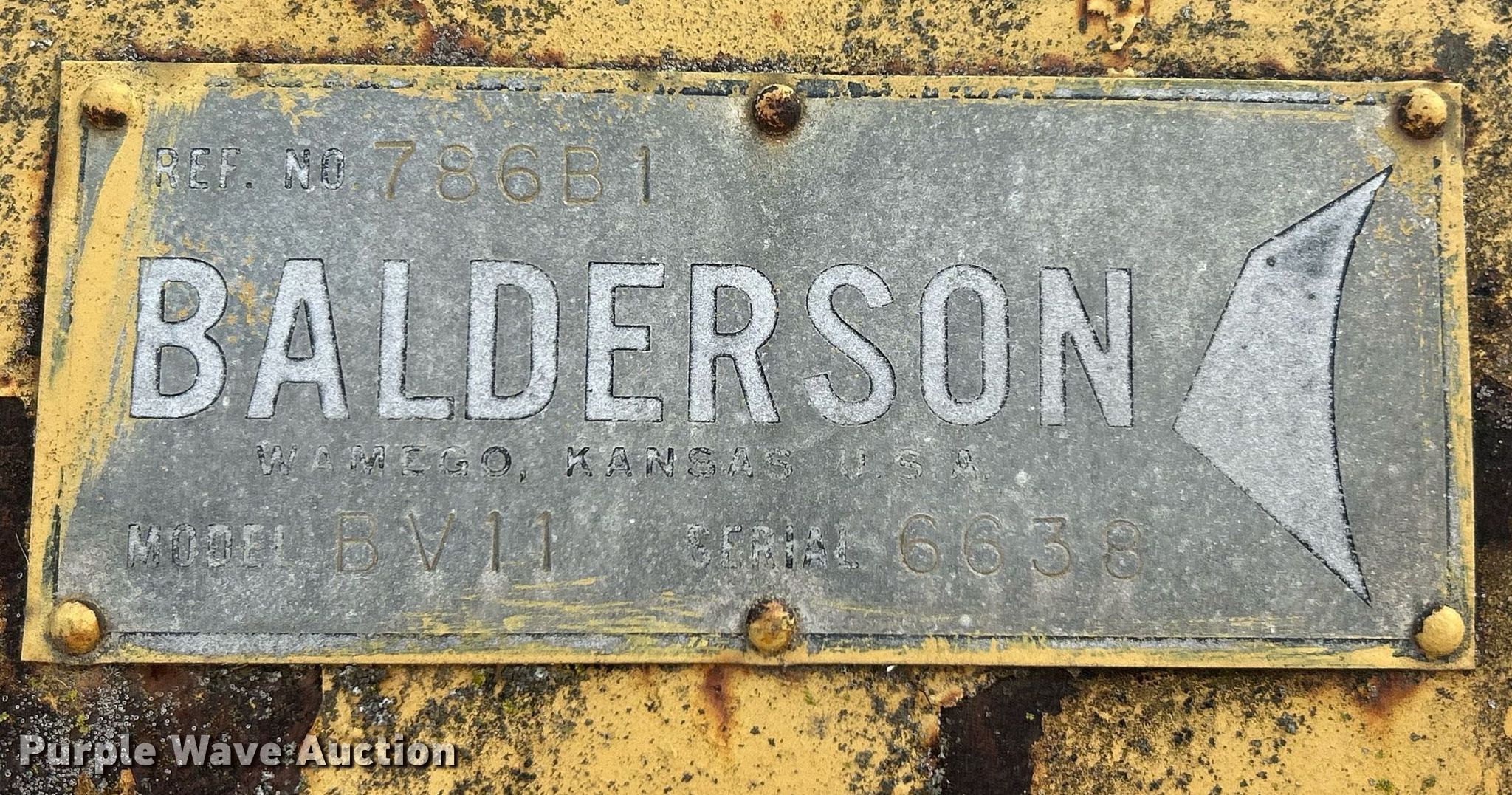 Purple Wave is selling a used Motor Grader Attach. in Illinois. This item is a Balderson BV11 snow plow with the following: Serial: 6638, Width: 11'