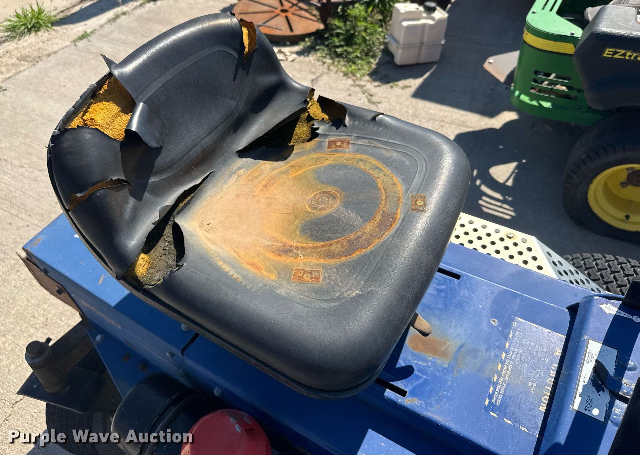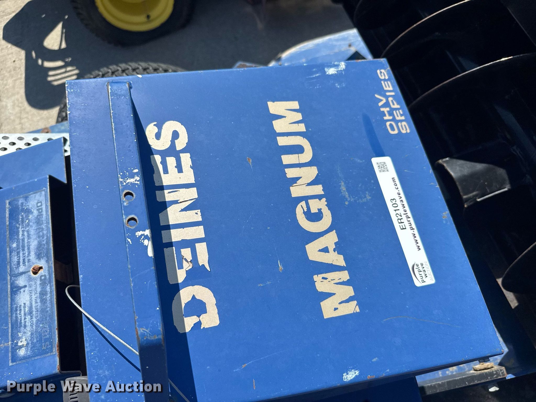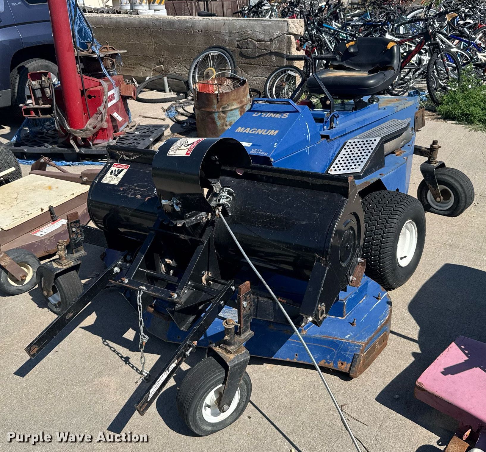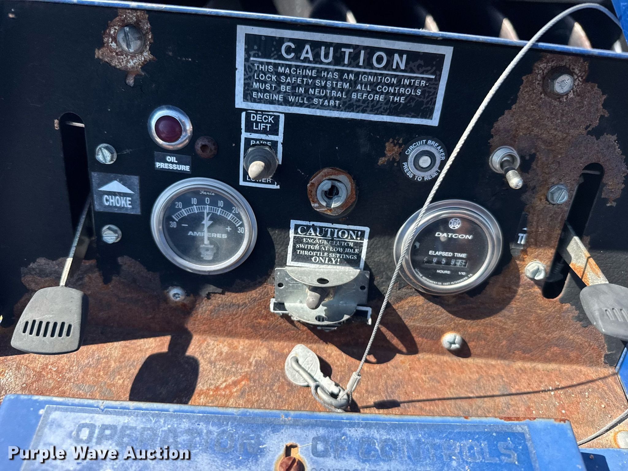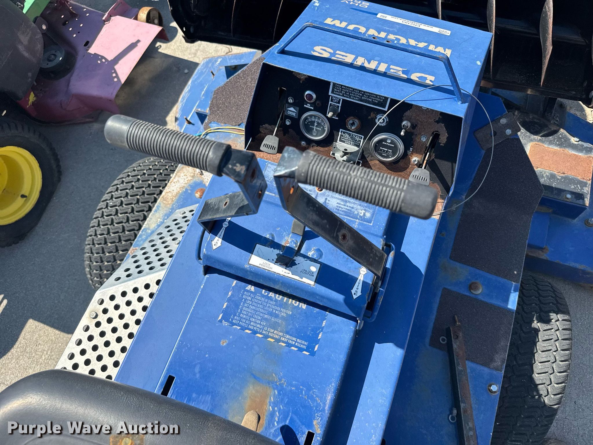 Deines 2000 lawn mower. Hours: 2,060 on meter, Cutting width: 60". Engine Cylinders: 2, Fuel type: Gas. Transmission Hydrostatic. Features Snow blower Width: 48". Tires Front: 15x6-6, Rear: 20x10.00-8. Notes Flat tires, Tire off bead, Non-operational unit. Norton, KS 67654