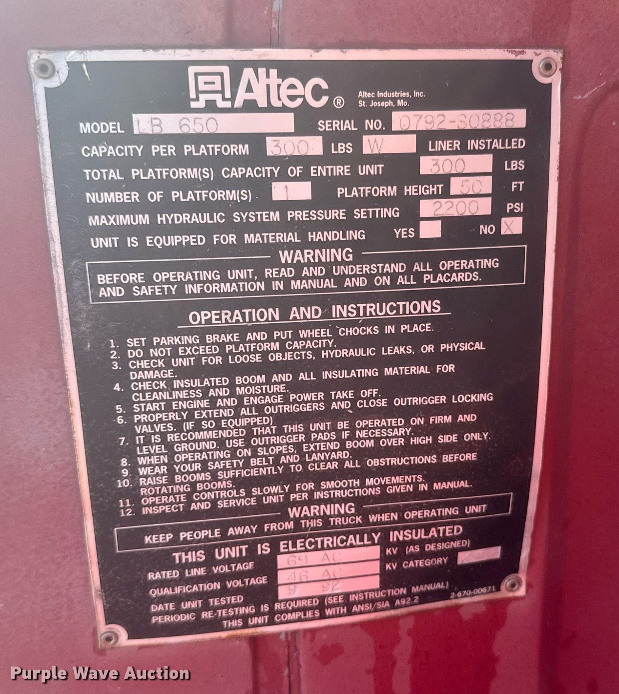 1992 Chevrolet Kodiak C6500 forestry bucket truck. Miles: 92,898 on odometer, Hours: 4,592 on meter, VIN: 1GBL7H1J5NJ107517. Engine Caterpillar, Displacement: 6.6L, Cylinders: 6, Fuel type: Diesel. Transmission Manual, Speed: 6. Chassis Axles: Single, Suspension: Spring, Brakes: Hydraulic, PTO, GVWR: 31,000 lbs. Interior Heat. Features Bed 17' 11" L x 96" W, Chip bed 12' L x 96" W x 59" H, Boom Altec LB650, Serial: 0792-S0888, Maximum lift capacity: 300 lbs, Maximum lift height: 50', Boom type: Articulating, Insulated, Man basket, Boom controls Ground, Platform/ basket.. Tires Size: 10.00-20. Notes Dash warning indicator: Check gages. Kansas title. Seller is a government entity who will be assigning and distributing the title. Please contact the seller for distribution questions. Title distribution may be delayed up to 14 days from verification of funds. Norton, KS 67654