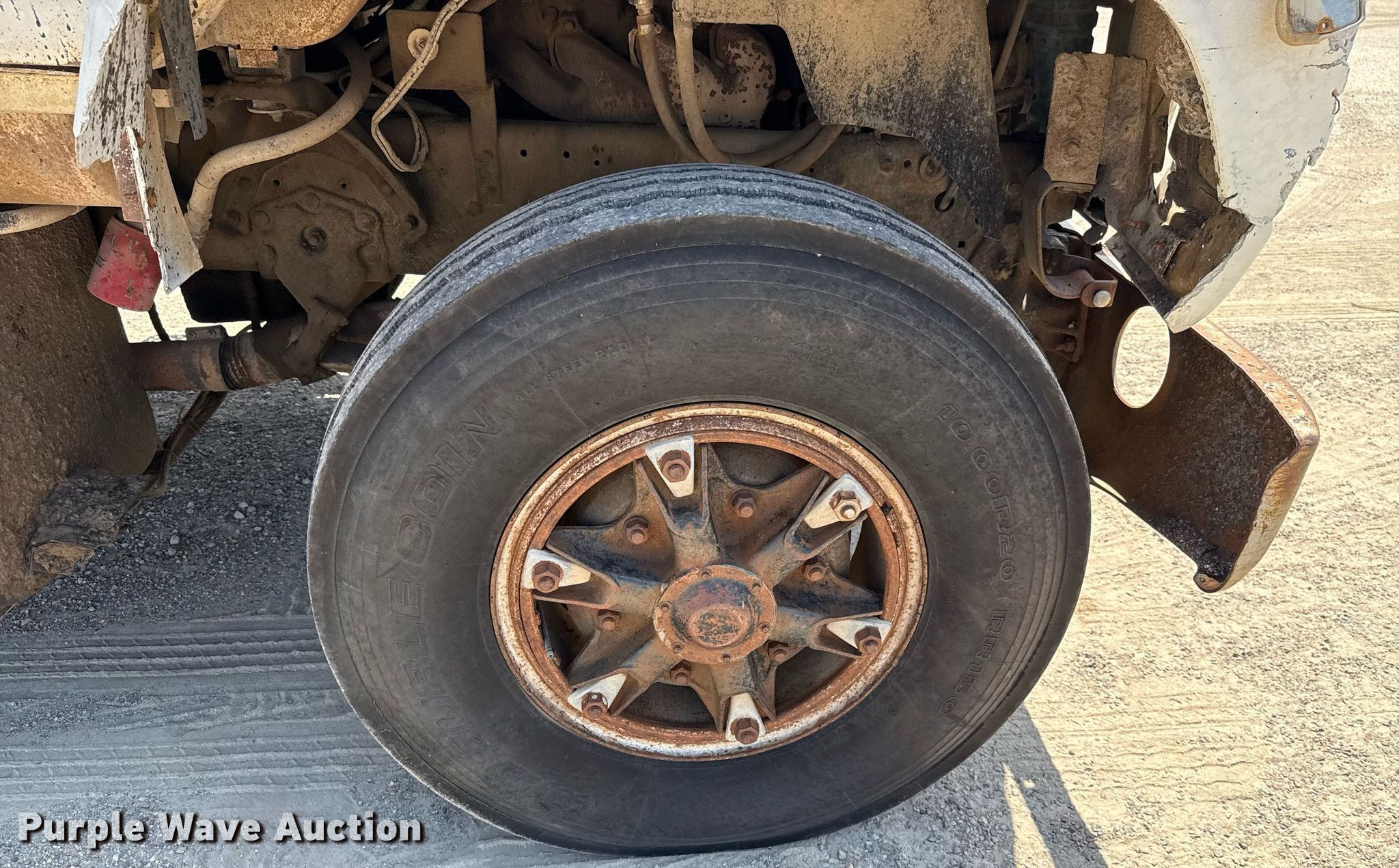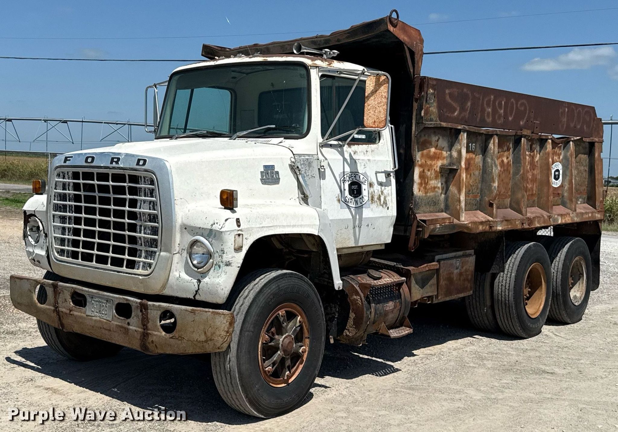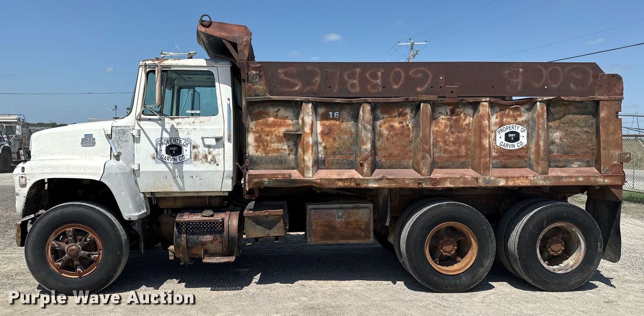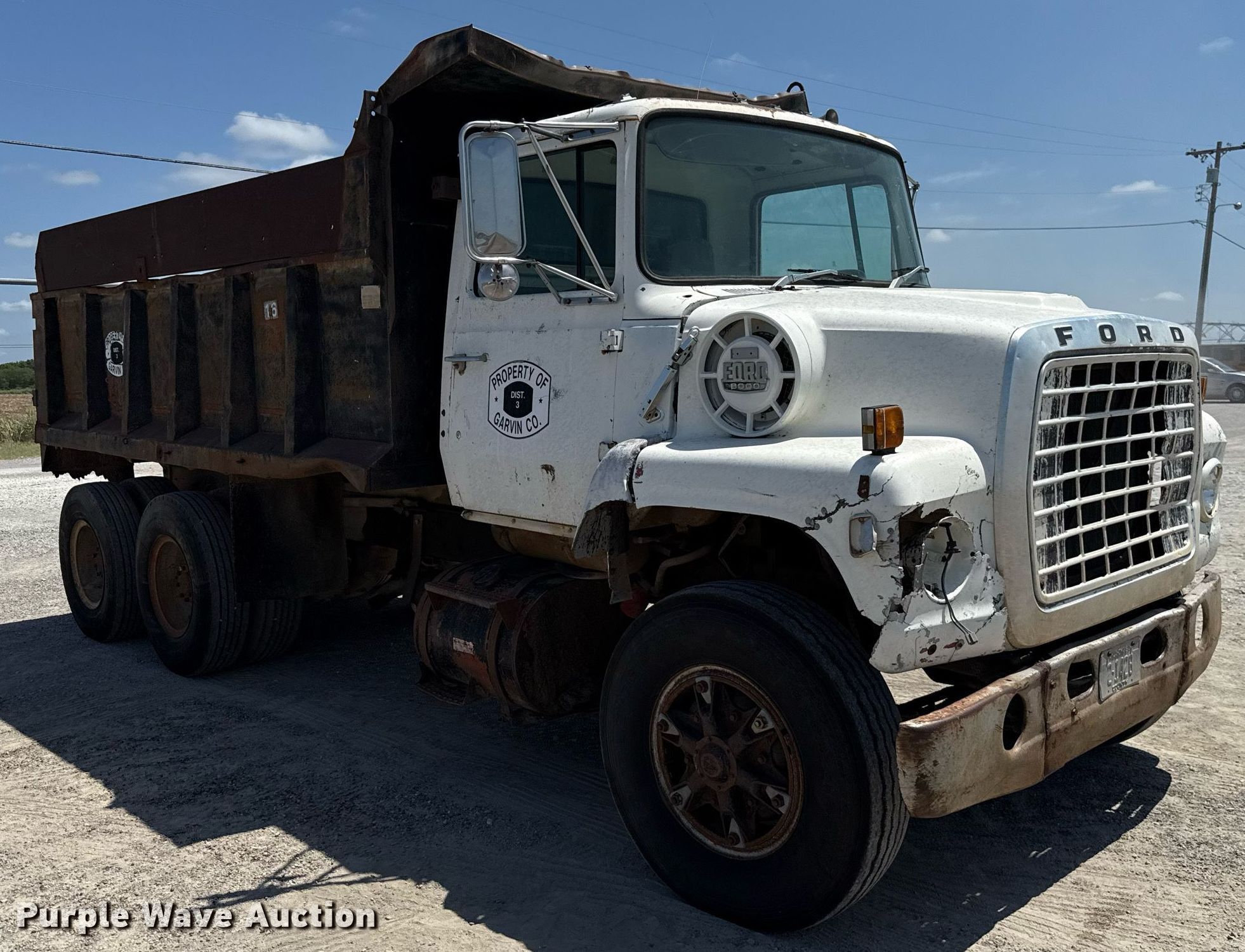 1980 Ford 8000 dump truck. Miles: 56,681 on odometer, VIN: W81UVJA9998. Engine Cylinders: 8, Fuel type: Diesel. Transmission Automatic. Chassis Axles: Tandem, Differential lock: Inter-axle, Suspension: Spring over walking beam, Brakes: Air, PTO, GVWR: 44,800 lbs FAWR: 10,860 lbs, IAWR: 19,000 lbs, RAWR: 19,000 lbs, Wheelbase: 186". Features Bed Dump bed, Peabody Galion, Serial: 872644, Length: 14', Width: 94", Capacity: 12 cu.yd., Side height: 54", Bed type: Steel, Ram: Single. Tires Size: 10.00R20. Notes Air leak, Passenger side head light missing, Dash warning indicator: Brake, Windshield chipped or cracked, Dead battery. Oklahoma title. Title distribution may be delayed up to 30 days from verification of funds. Garvin County District 3. Stratford, OK 74872