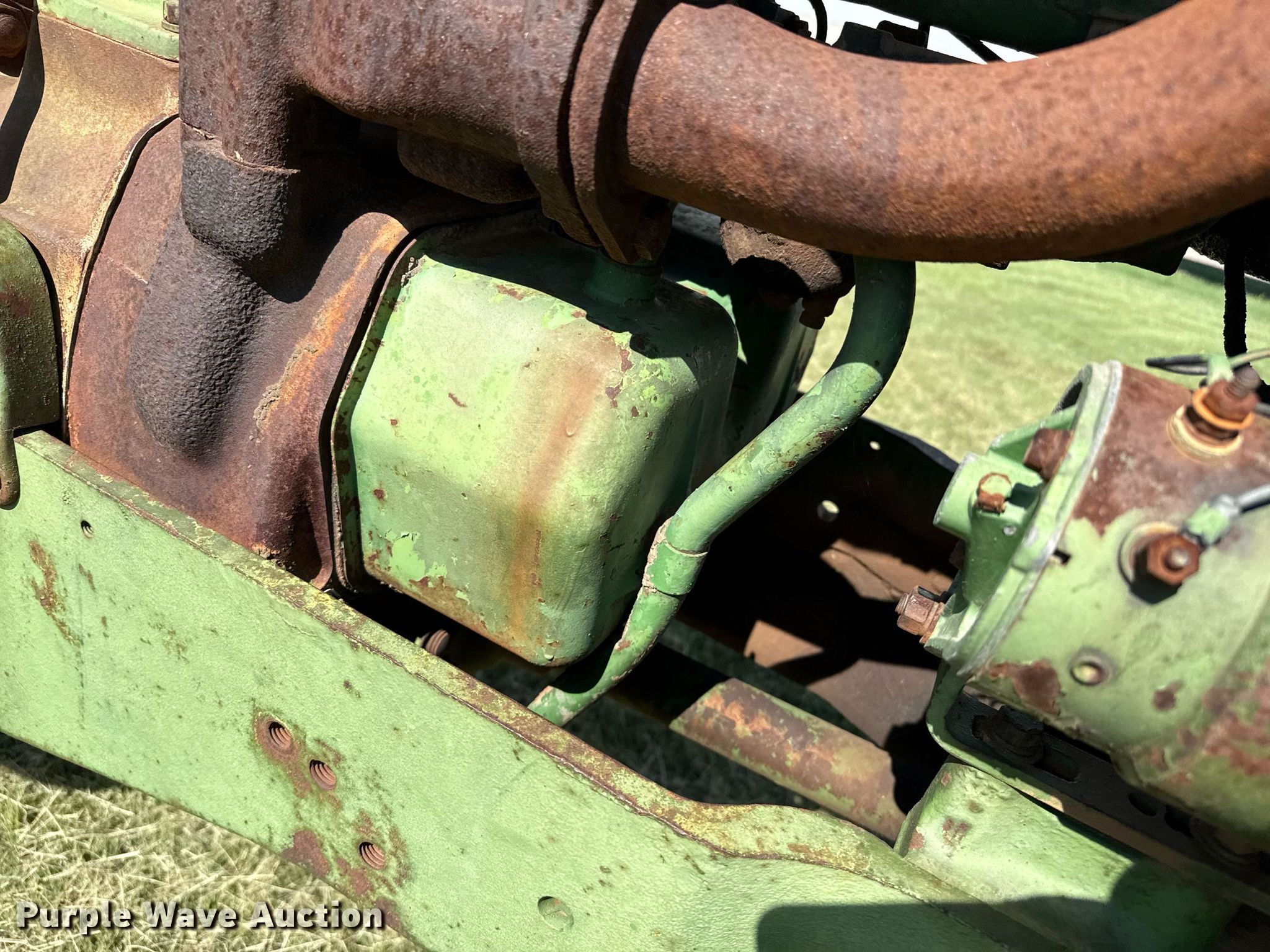 John Deere 70 tractor. Serial: 7000501. Engine Cylinders: 2, Fuel type: Gas. Transmission Manual, 6F - 2R. Features PTO: 540, Hydraulic remote sets Rear: 1. Tires Front: 6.00-16, Rear: 14.9-38. Notes Unknown operating condition. God Will Provide, LLC. Leedey, OK 73654