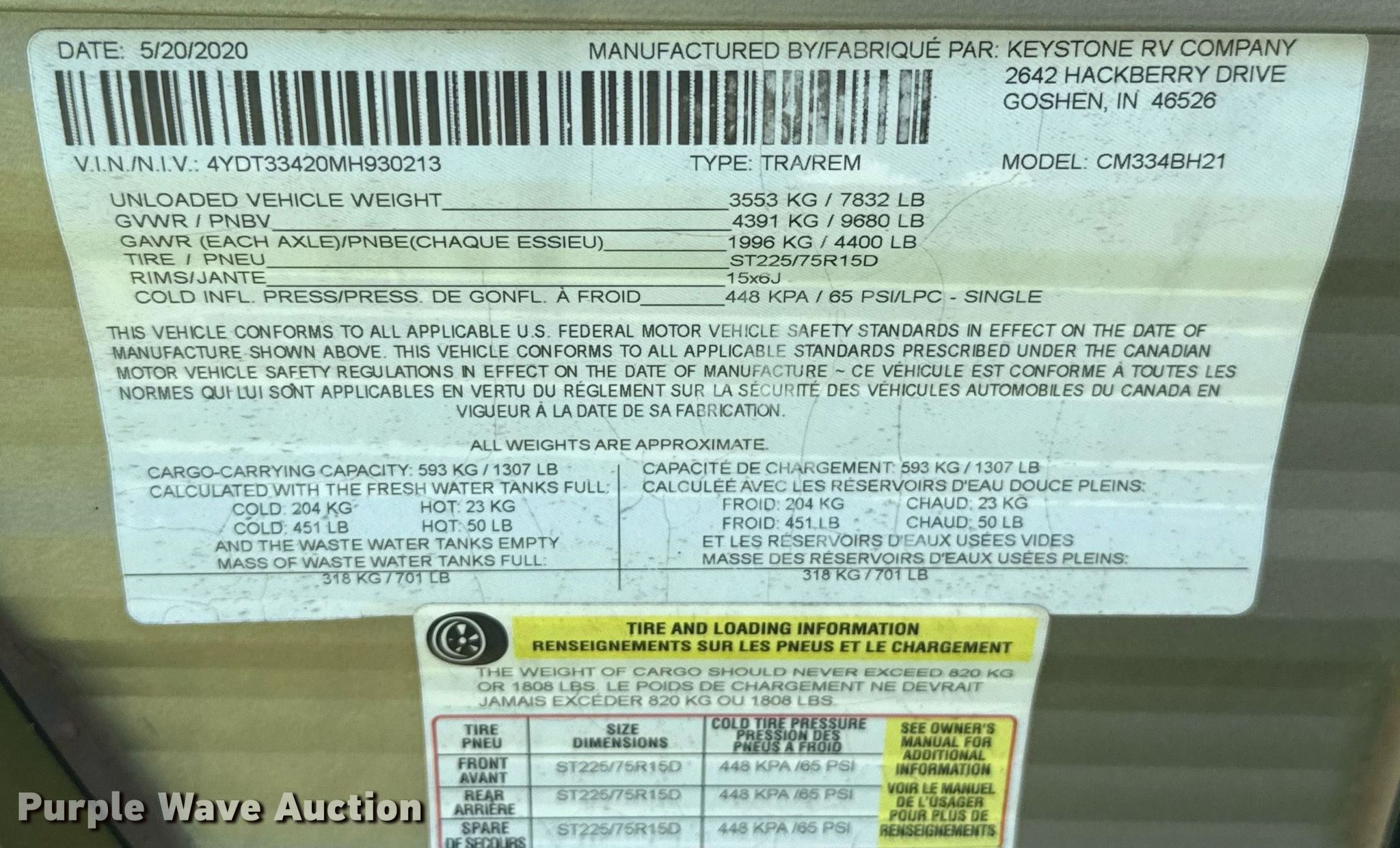 Purple Wave is selling a used RV or Camper in Oklahoma. This item is a 2021 Coleman Keystone CM334BH21 camper with the following: Camper length: 34', VIN: 4YDT33420MH930213, Insurance salvage unit claim #: 5-805894