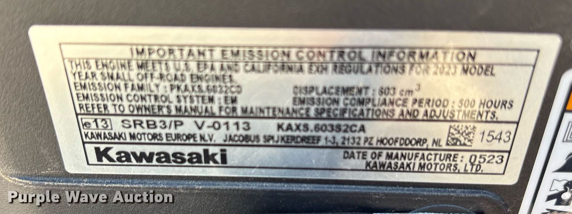2023 Kubota WHF15-48-2 lawn mower. Hours: 3 on meter, Cutting width: 48", Serial: 14756. Engine Kawasaki FS541V, Displacement: 603 cc, Cylinders: 2, Fuel type: Gas, HP: 15. Transmission Hydrostatic. Features Self- propelled. Tires Front: 11x6.00-5/3.00, Rear: 20x8.00-10 NHS. Notes No manufacturer's warranty. Kubota Tractor Corp. Grapevine, TX 76051