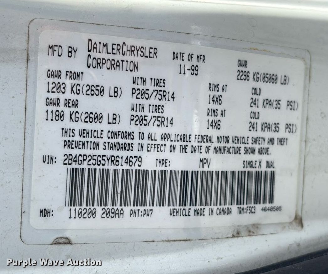Purple Wave is selling a used Passenger Vehicle in North Carolina. This item is a 2000 Dodge Caravan van with the following: Miles: 144,689 on odometer, VIN: 2B4GP25G5YR614679