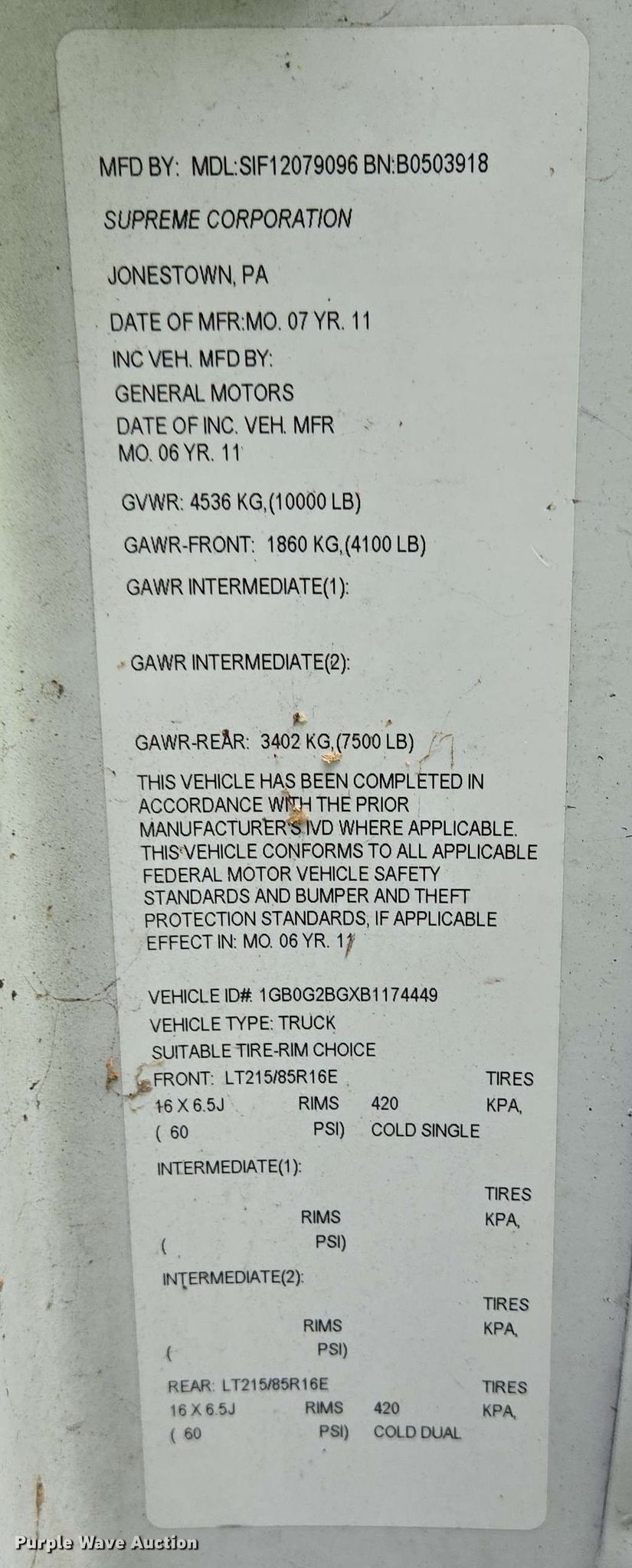 2011 Chevrolet Express 3500 box truck. Miles: 197,480 on odometer Actual milage unknown, VIN: 1GB0G2BGXB1174449. Engine Displacement: 6.0L, Cylinders: 8, Fuel type: Gas. Transmission Automatic. Chassis Axles: Single, Suspension: Spring, Brakes: Hydraulic, GVWR: 10,000 lbs. Interior AC, Heat. Features Box bed Supreme SIF12079096, Serial: B0503918, 12' L x 96" W x 79" H, Floor: Wood. Tires Size: 215/85R16. Notes Dash warning indicator: Airbag. Delaware title. Mileage has not been verified. Odometer discrepancy will be marked on the title. Title distribution may be delayed up to 14 days from verification of funds. Delmar, DE 19940