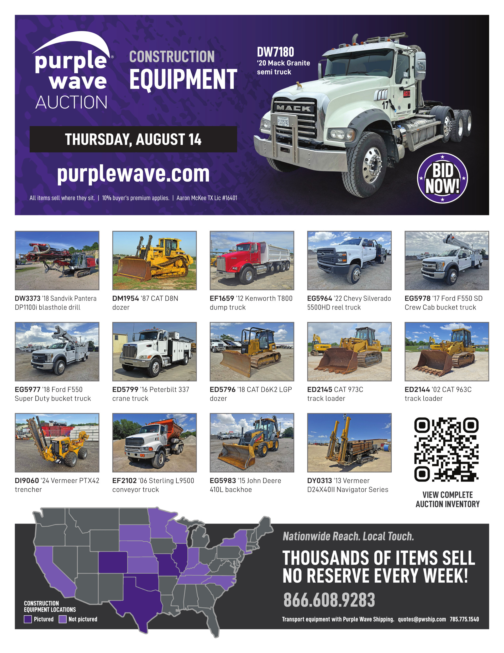 This auction is conducted by Purple Wave, Inc., whose home office is 825 Levee Drive, Manhattan, Kansas. Aaron McKee, Texas auctioneer license # 16401, operates Purple Wave, Inc. Complaints against us may be directed to the Texas Department of Licensing and Regulation, P.O. Box 12157, Austin, Texas 78711, (512) 463-6599. For additional required information, see the attached document.