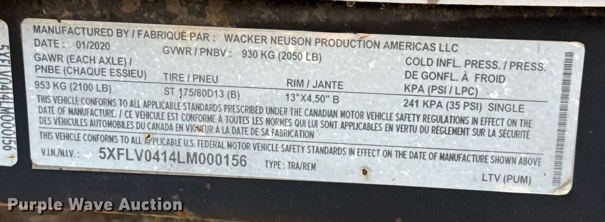 2020 Wacker Neuson LTV6 light plant. Hours: 121 on meter, VIN: 5XFLV0414LM000156. Engine Kohler, Displacement: 1.028L, Cylinders: 3, Fuel type: Diesel. Features Generator Phase: Single, Electric start, Fuel tank, Light plant Bulbs: 4, Hoist: Manual, Stabilizers. Trailer Wacker Neuson LTV, 8' L x 58" W, Ball hitch size: 2", Suspension: Torsion, Axles: Single, Tire size: ST175/80D13, GVWR: 2,050 lbs, GAWR: 2,100 lbs. Notes Brake light issues, adapter missing. Transfer of ownership documentation will be a bill of sale. Hennessey, OK 73742