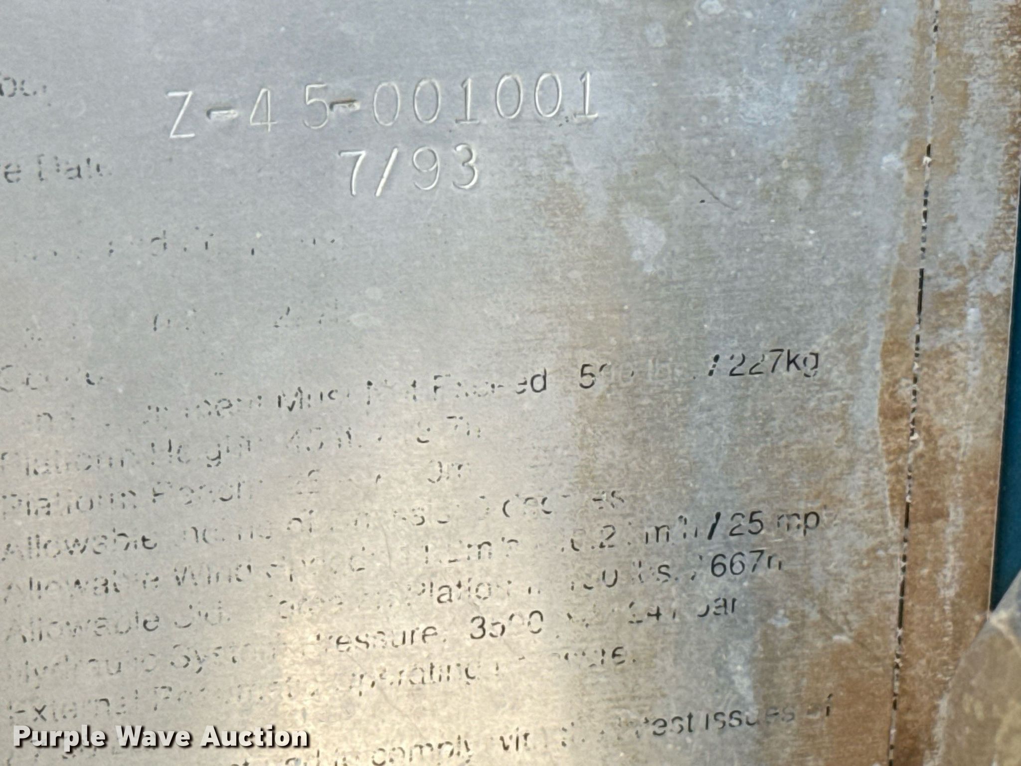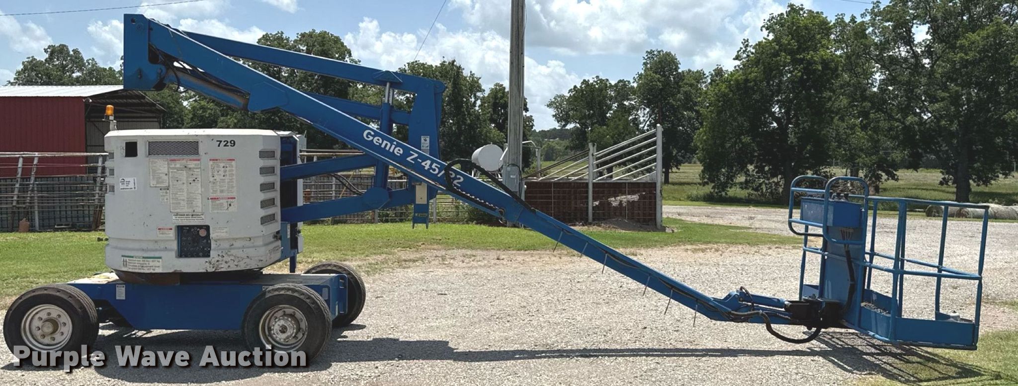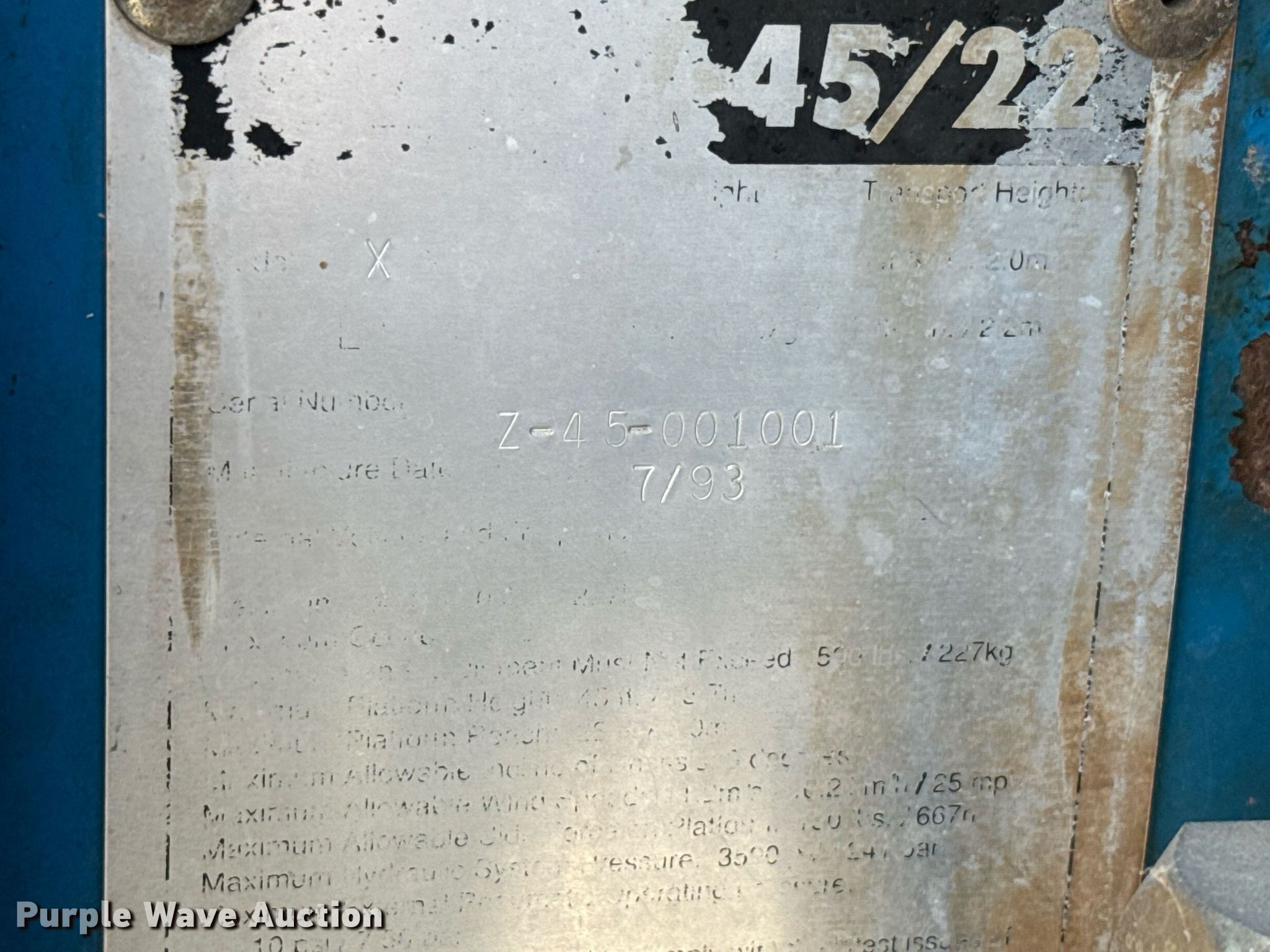 Purple Wave is selling a used Boom Lift in Oklahoma. This item is a 1993 Genie Z-45/22 boom lift with the following: Hours: 5,234 on meter, Actual hours unknown, Serial: Z-45-001001