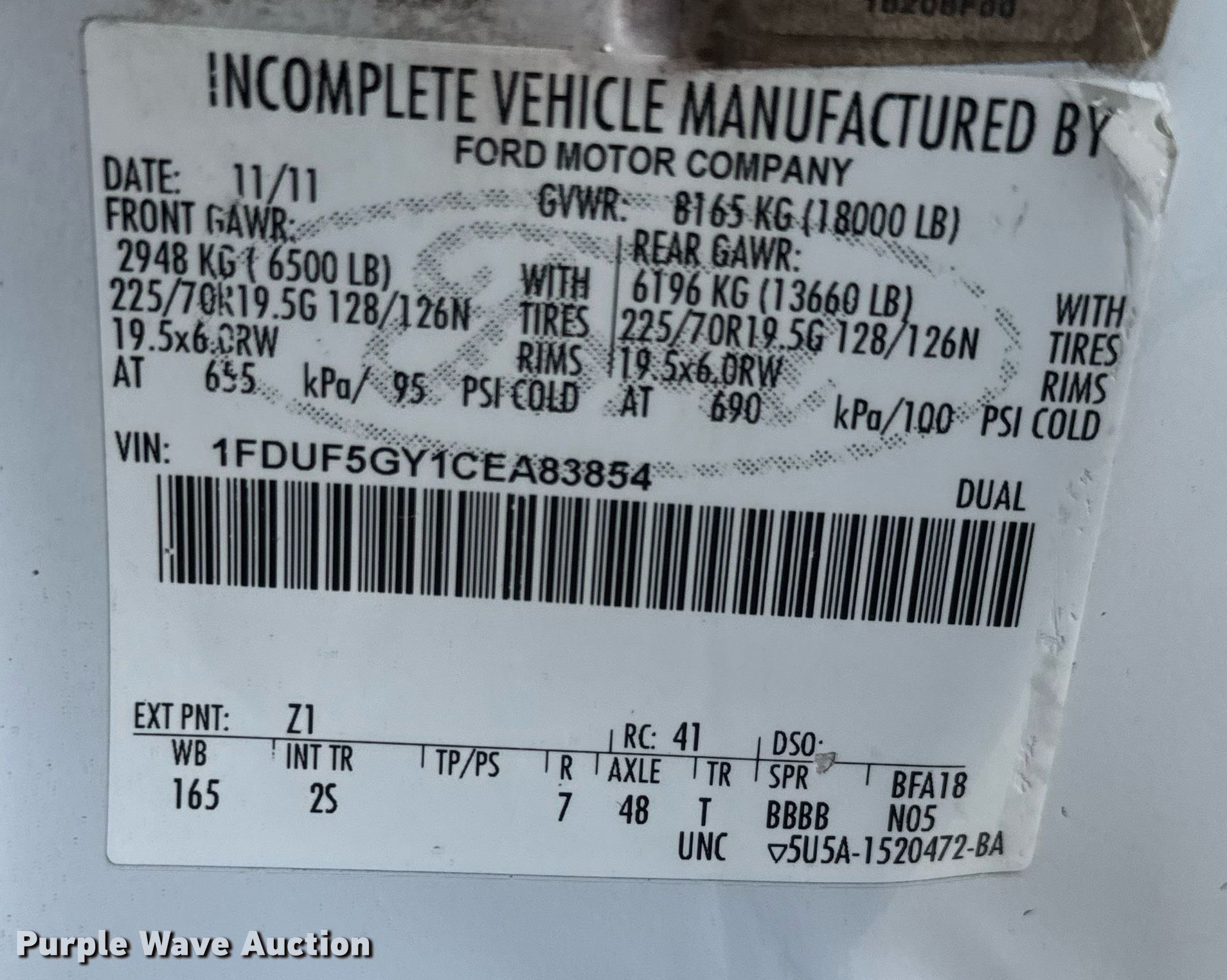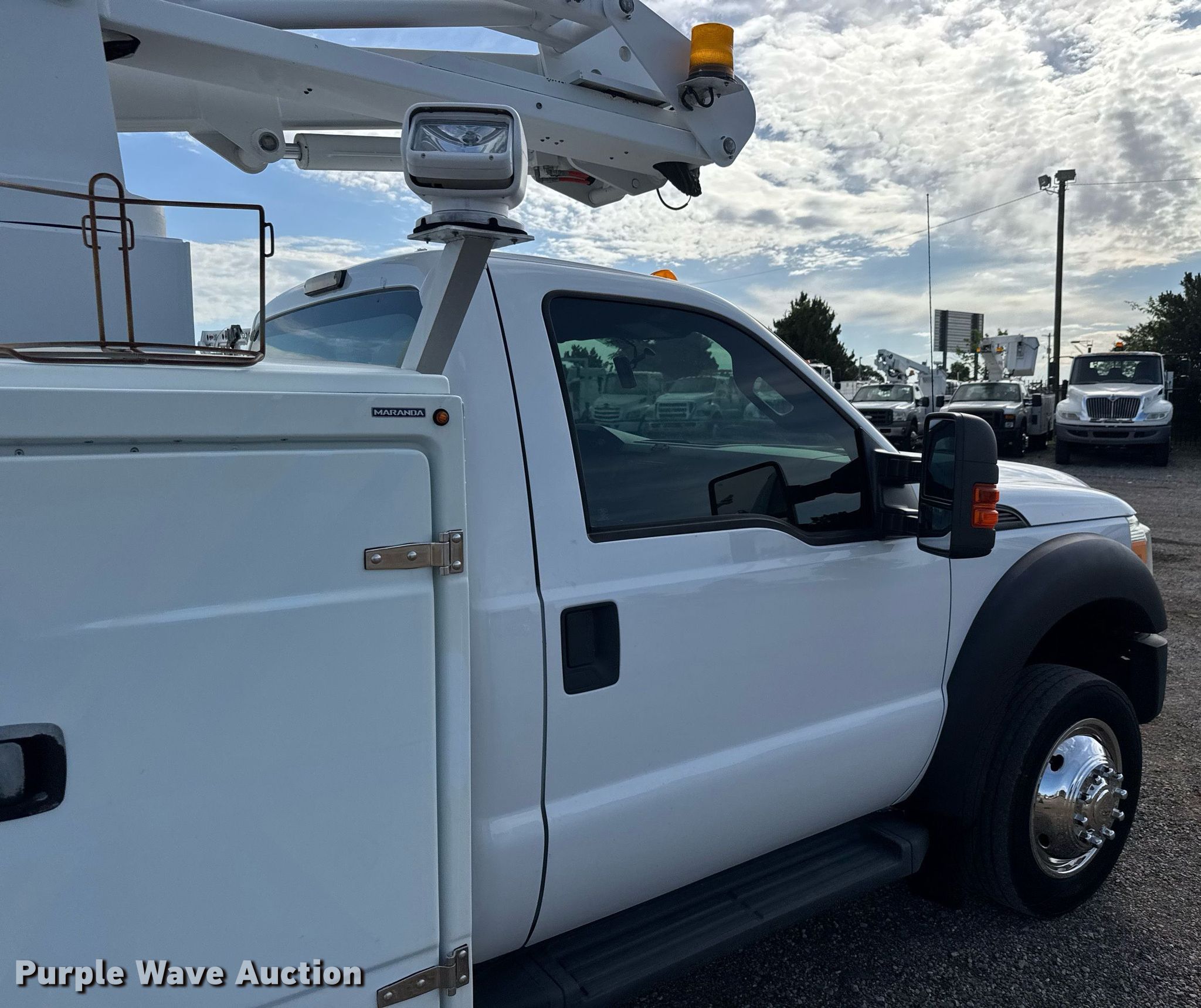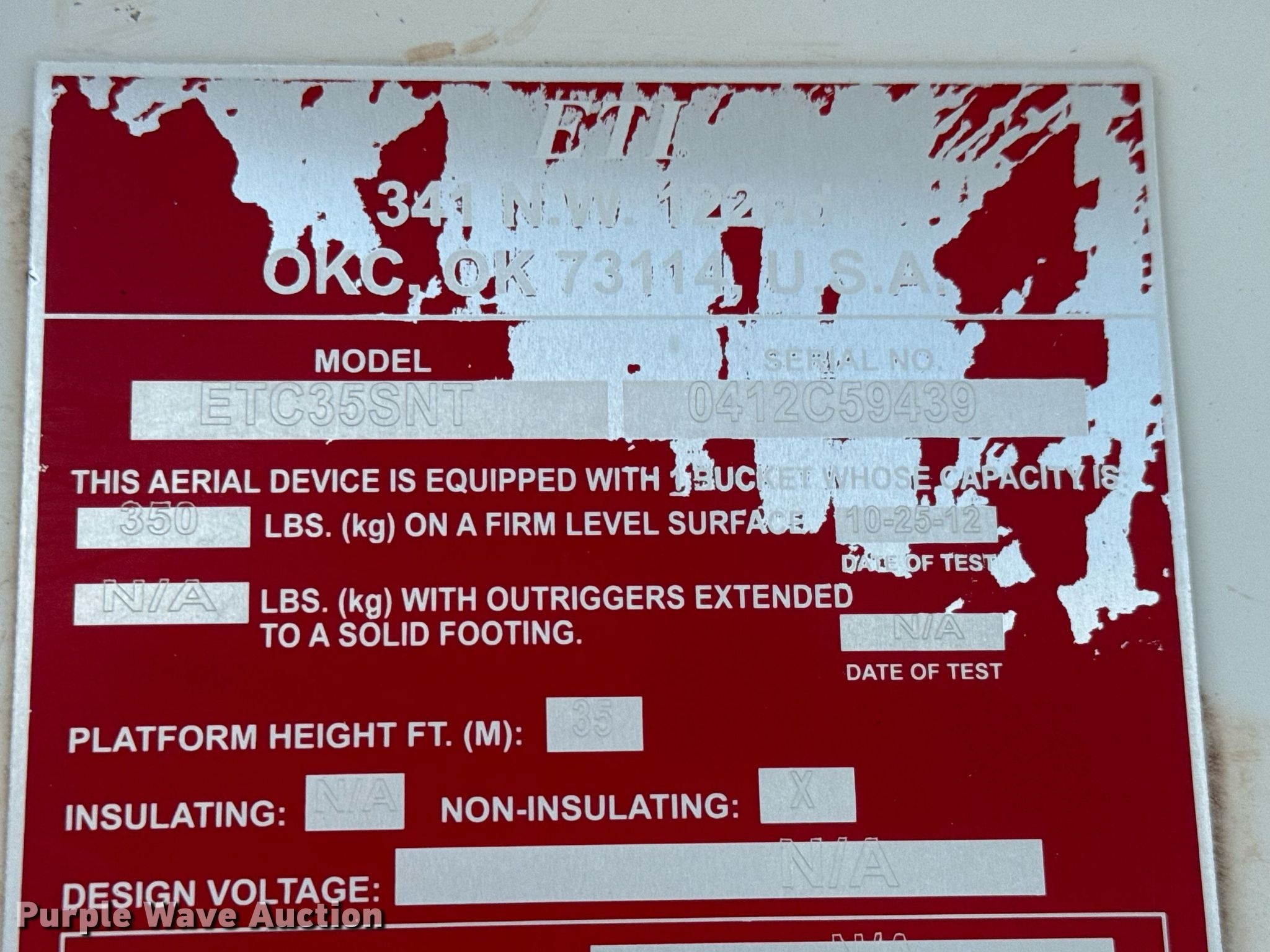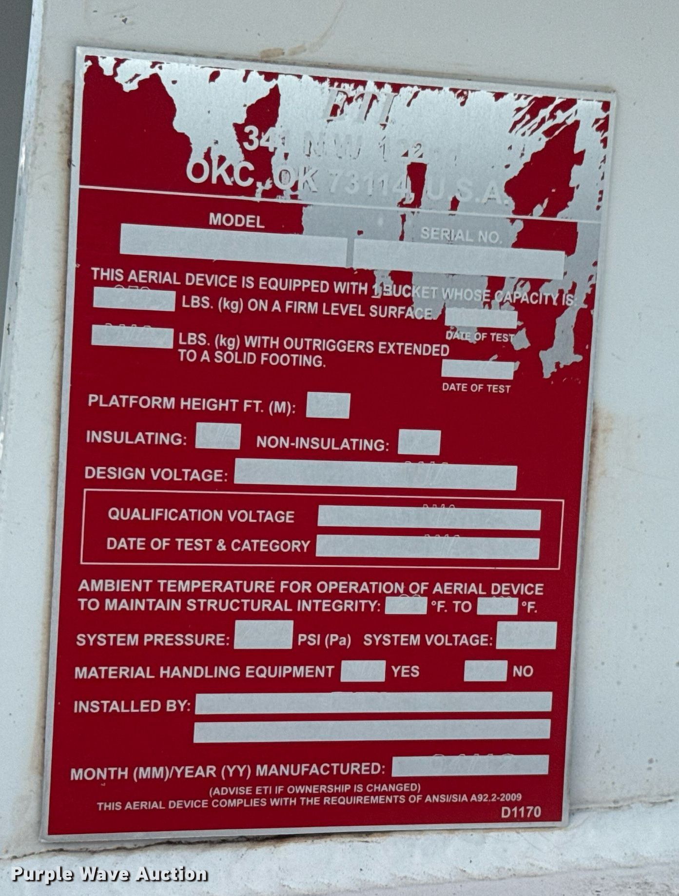 2012 Ford F550 Super Duty bucket truck. Miles: 142,310 on odometer, VIN: 1FDUF5GY1CEA83854. Engine Ford, Displacement: 6.8L, Cylinders: 10, Fuel type: Gas. Transmission Automatic. Chassis Axles: Single, Suspension: Spring, Brakes: Hydraulic, PTO, GVWR: 18,000 lbs, Wheelbase: 165". Interior AC, Heat, Heated mirrors, Power windows, Power locks, Cruise control, Auxiliary controls. Features Bed Maranda MSP84CA, 14' L x 94" W, Boom 2012 ETI ETC35SNT, Serial: 0412C59439, Mast height: 35', Maximum lift capacity: 350 lbs, Boom type: Articulating, Telescopic, Man basket, Boom controls Platform/ basket, Remote control, Generator Cummins Onan Energy Command 30G, Hours: 1,166 on meter. Tires Size: 225/70R19.5. Notes Windshield chipped or cracked. Oklahoma title. Seller is an Oklahoma licensed motor vehicle dealer. Title will be assigned and distributed by the dealer. Please contact the seller for distribution questions. Title distribution may be delayed up to 30 days from verification of funds. Collinsville, OK 74021
