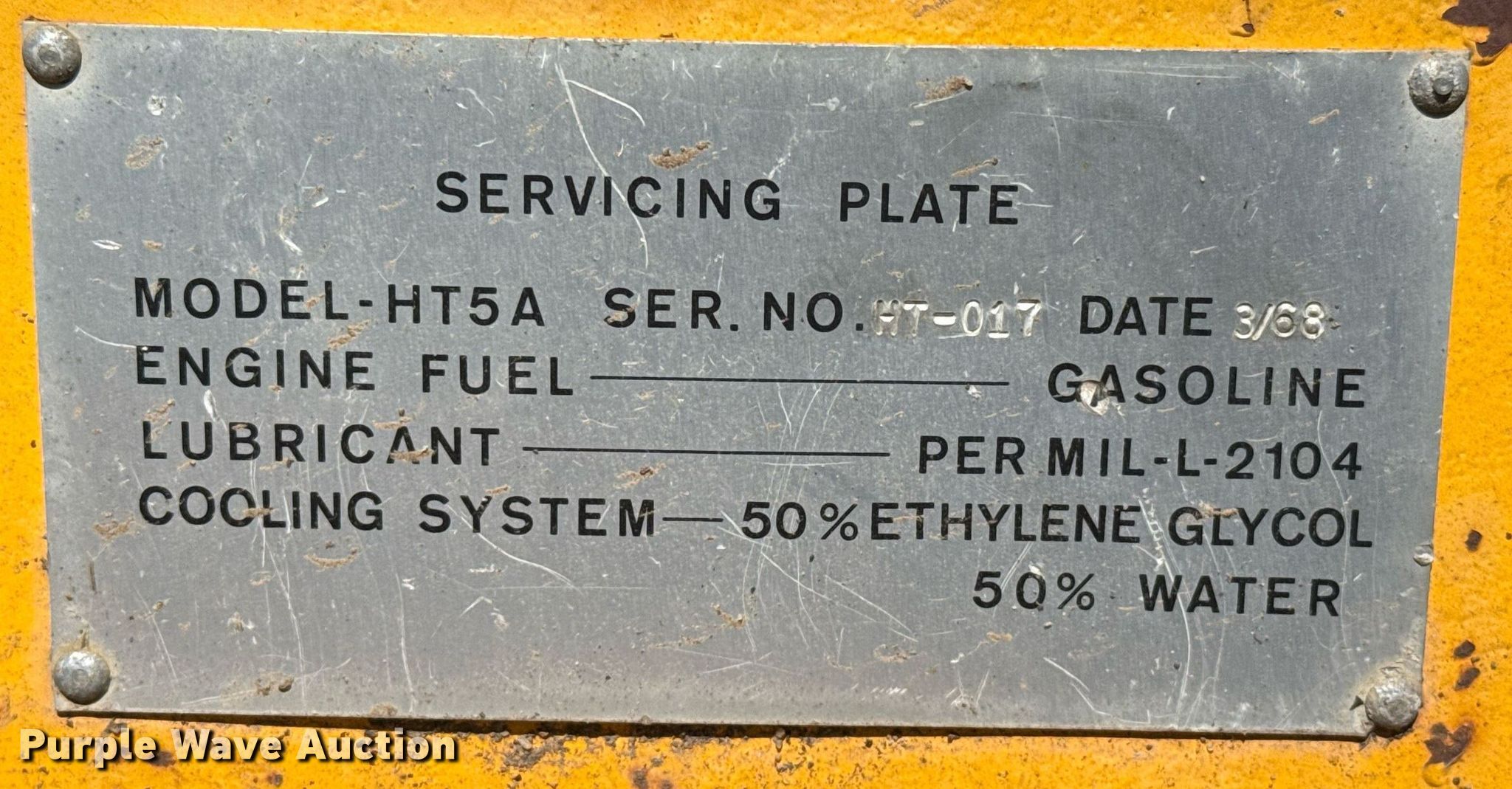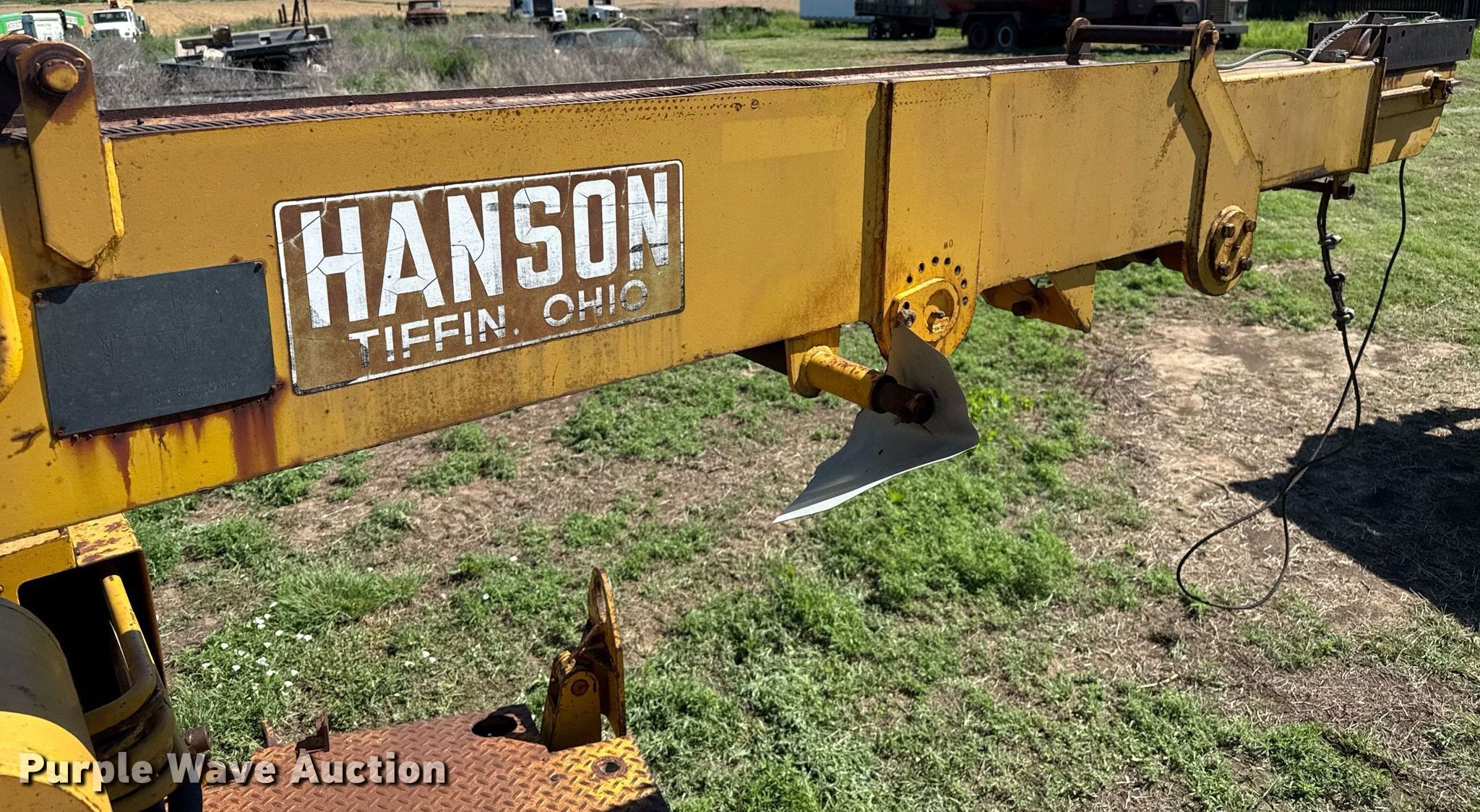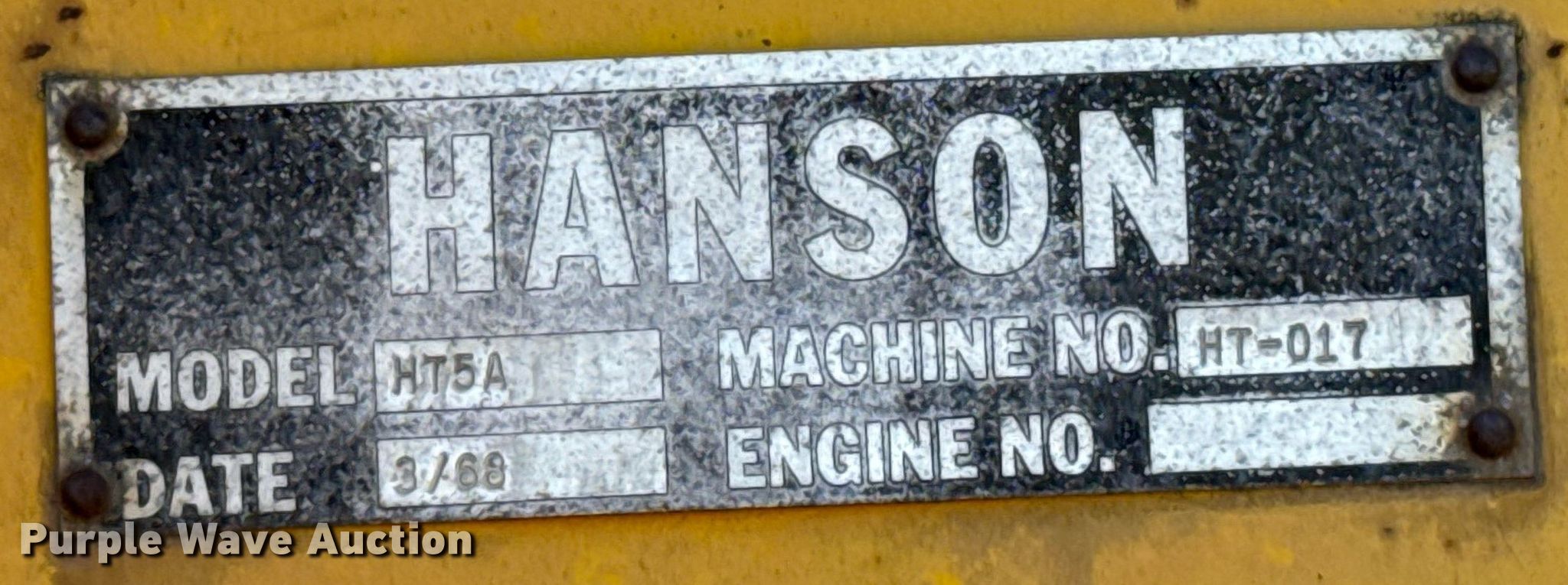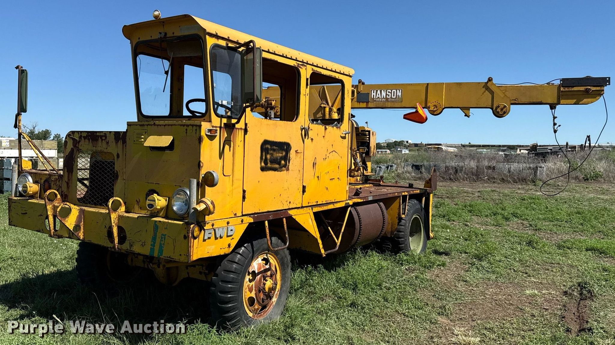 1968 Hanson HT5A crane truck. Hours: 1,395 on meter, VIN: HT-017. Engine Cylinders: 6, Fuel type: Gas. Transmission Manual. Chassis Four wheel drive, Axles: Single, Suspension: Spring, Brakes: Air. Features Crane Boom Telescopic, Maximum boom length: 16' Maximum lift capacity: 4,000 lbs, Boom controls Ground.. Tires Size: 9.00-20. Notes Unknown operating condition. This is worksite support equipment and will not come with a title. Transfer of ownership documentation will be a bill of sale. Dodge City, KS 67801